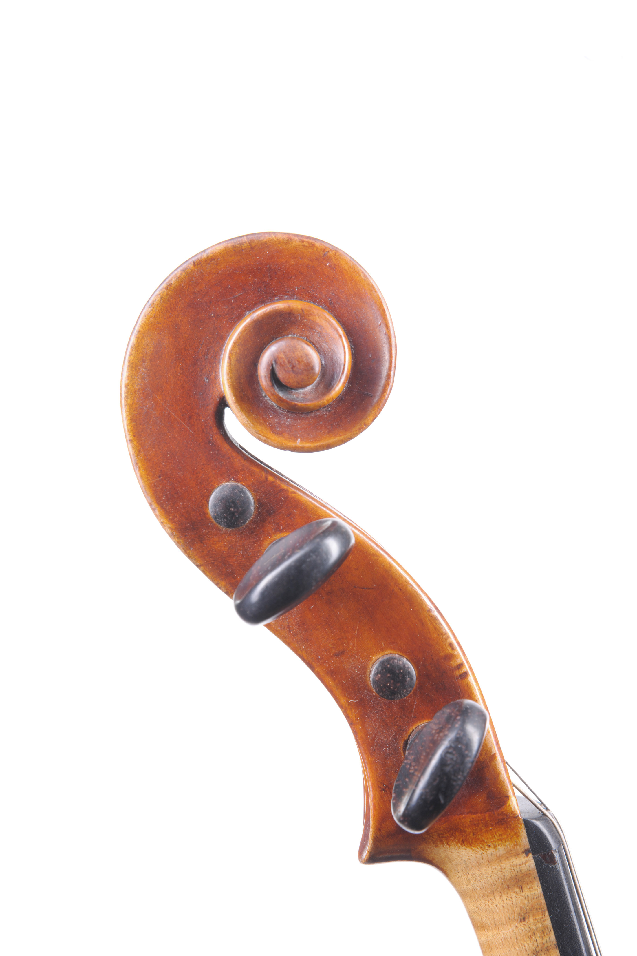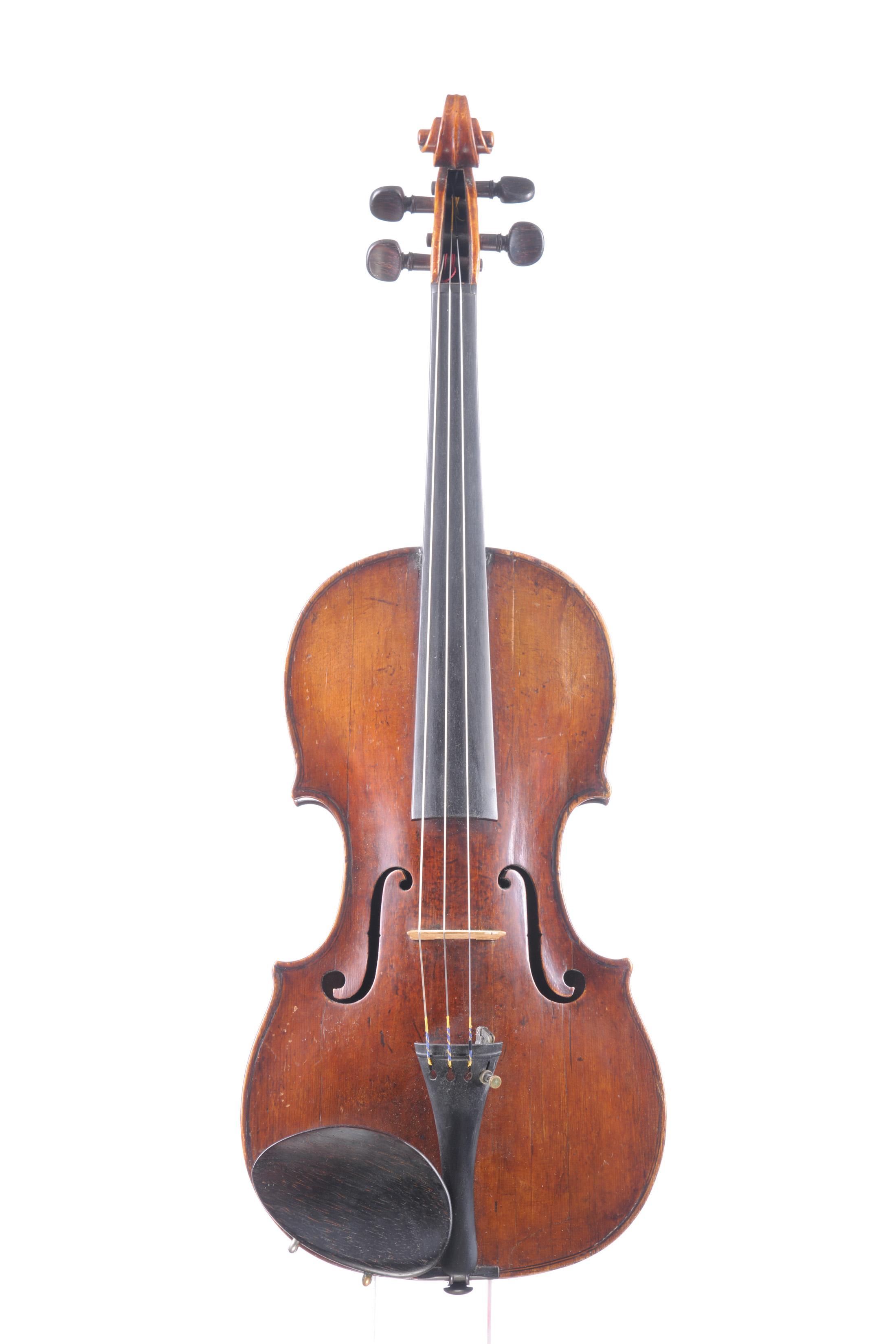 fait en deuxième partie du XVIIIe, portant une étiquette apocryphe de Jacobus Stainer. Diverses cassures restaurées à la table et au fond, l'ensemble est en bon état de restauration. Fond de deux pièces. Vernis brun doré. 355 mm. Avec sa boite. Diverses cassures: Cassure d'âme.