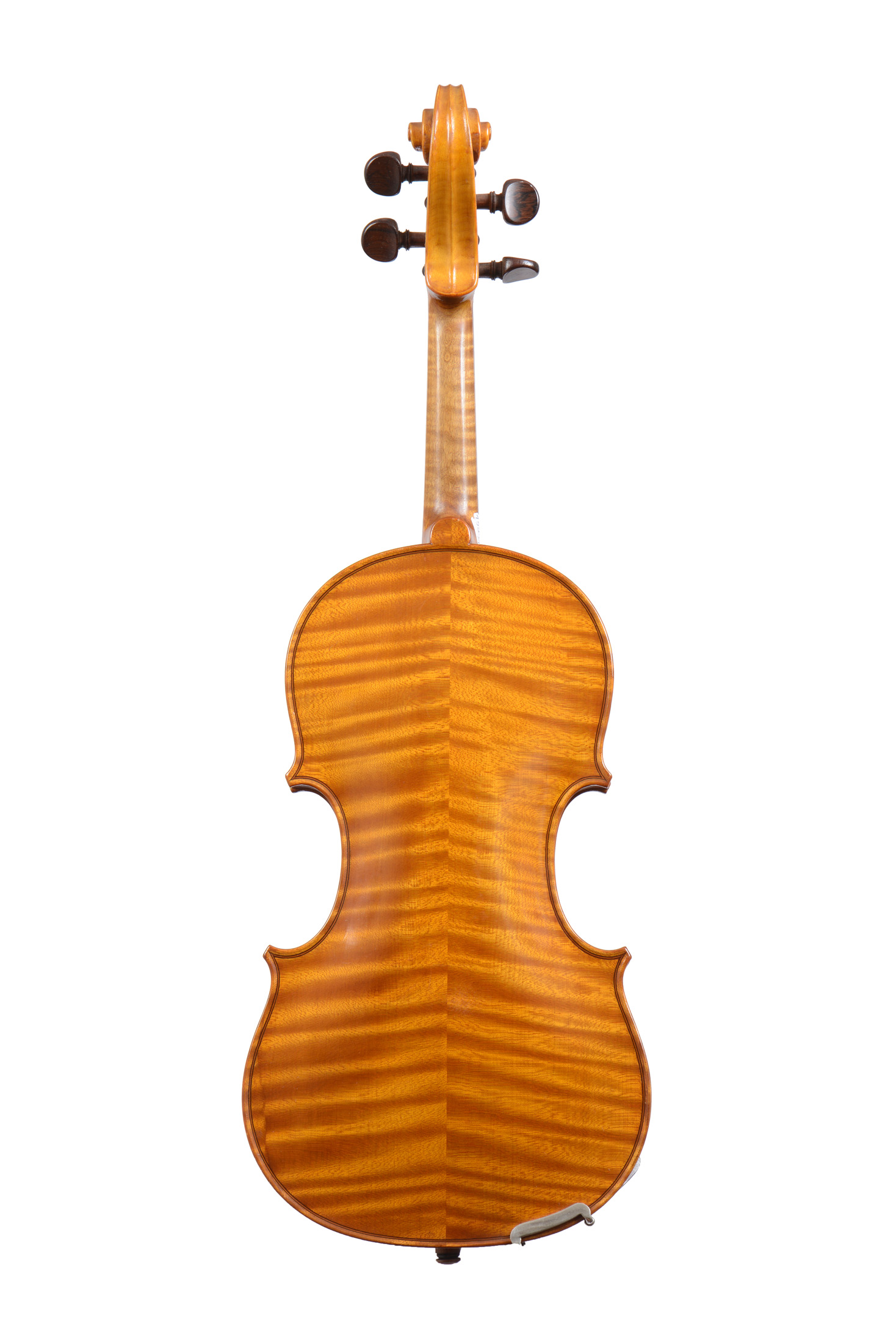 dont il porte l'étiquette "Jacques Camurat fecit in Paris anno 1958" et la marque au fer à l'intérieur au fond J.CAMURAT à PARIS. Fond de deux pièces en érable ondé. Table, éclisses et tête du même bois. Vernis brun doré. 354 mm. Parfait état de conservation.