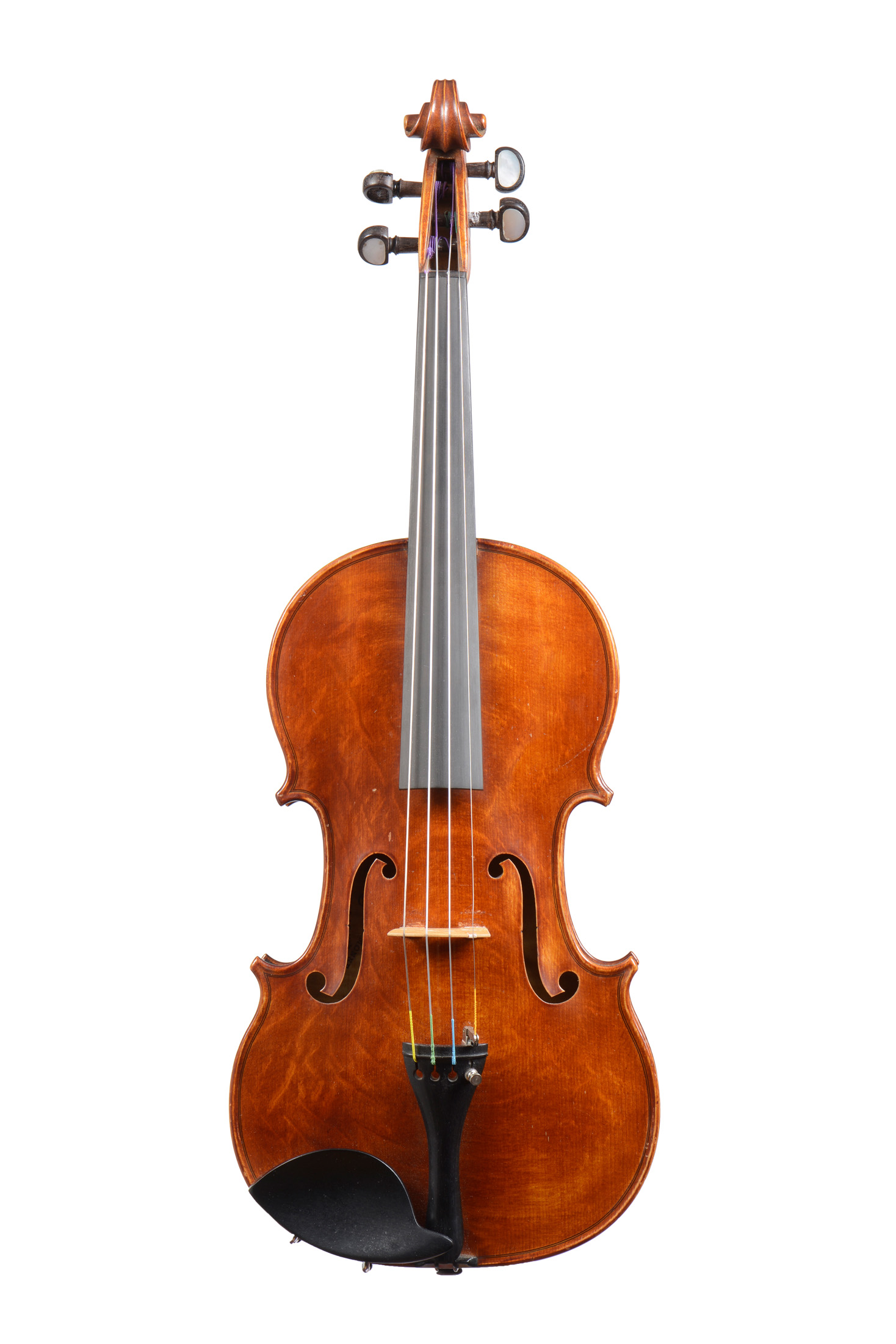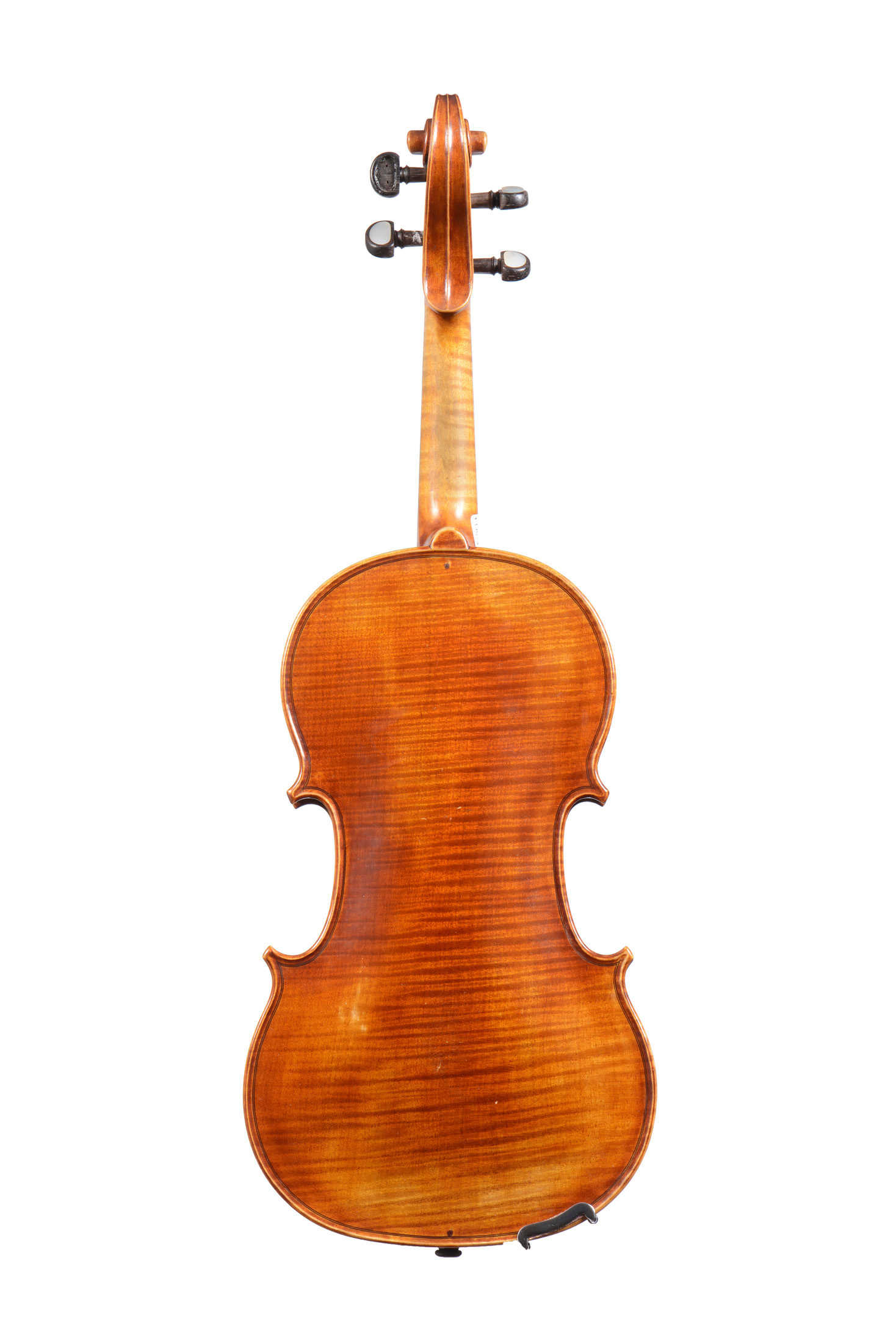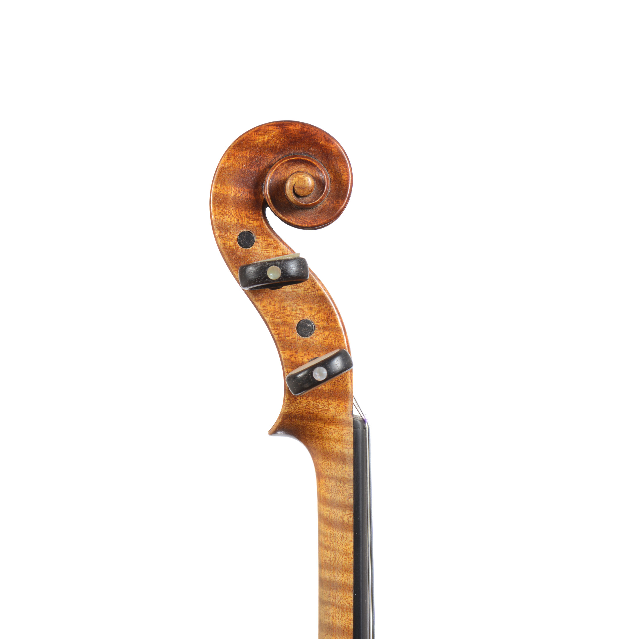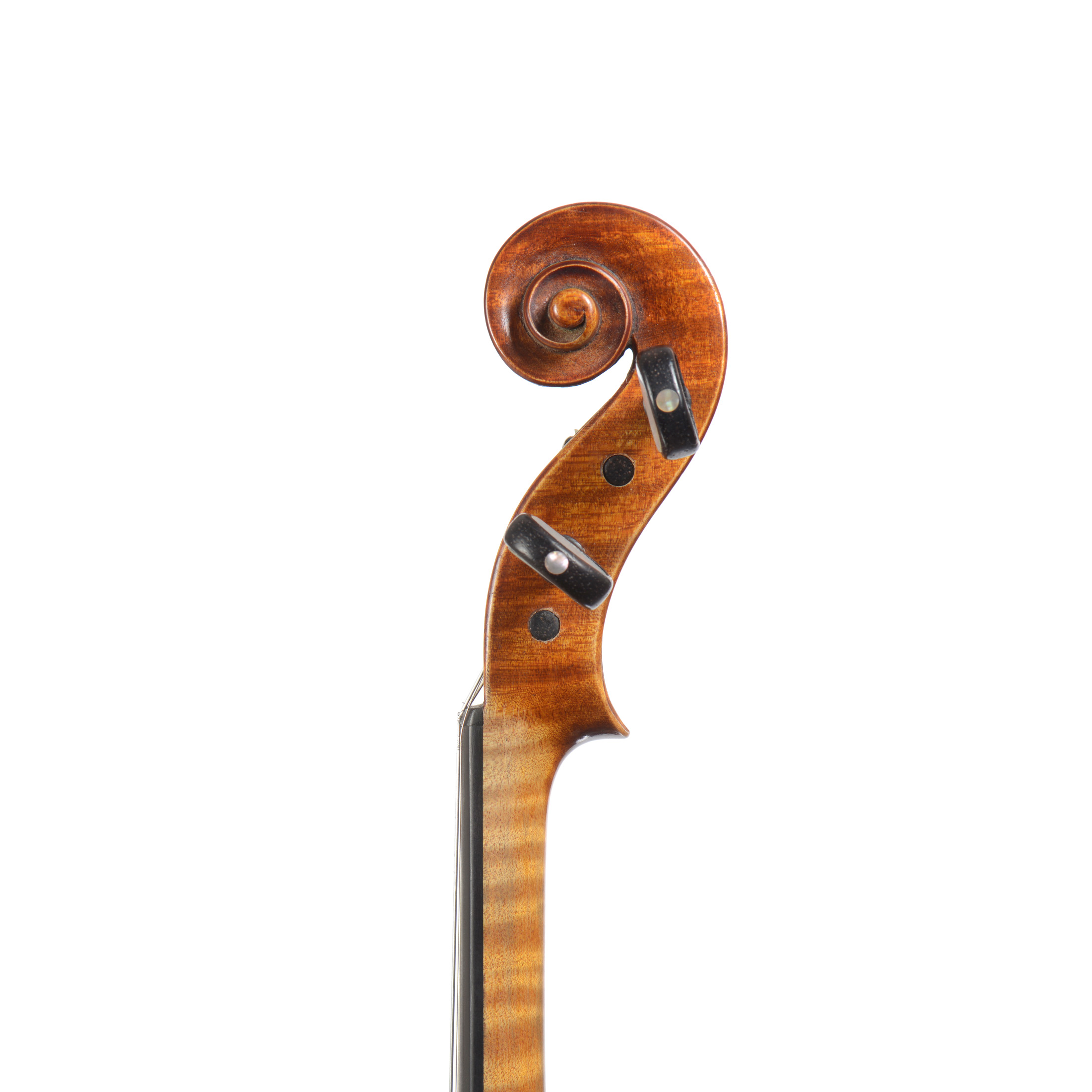 Vers 1800. Portant la marque au fer "À la ville de Crémonne", D. Nicolas Ainé, et la signature manuscrite à la plume à coté de l'âme. Fond d'une pièce en bel érable. Table d'une pièce en épicéa chenillé. Beau vernis brun sur fond doré. En parfait état de conservation. 362 mm.
