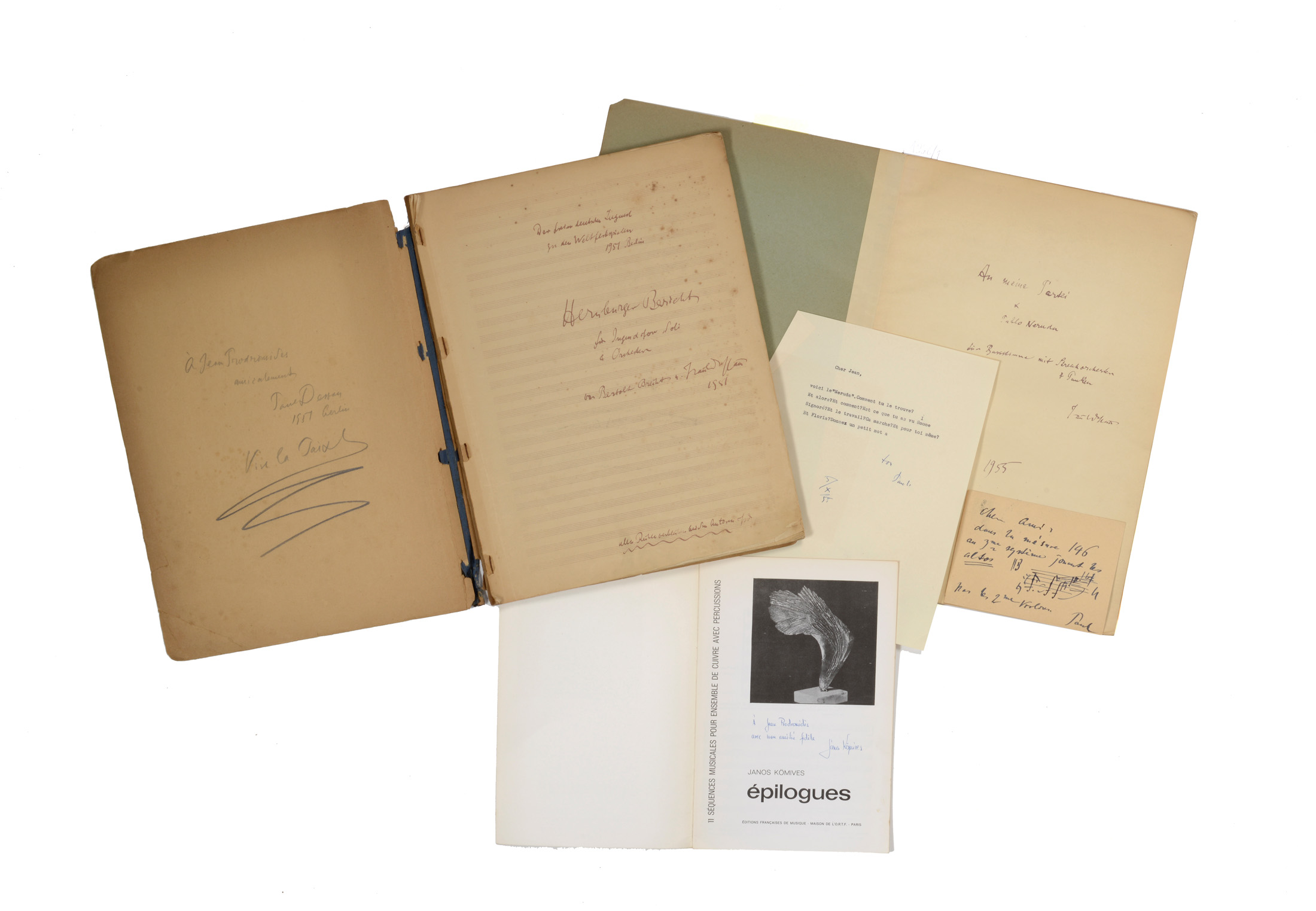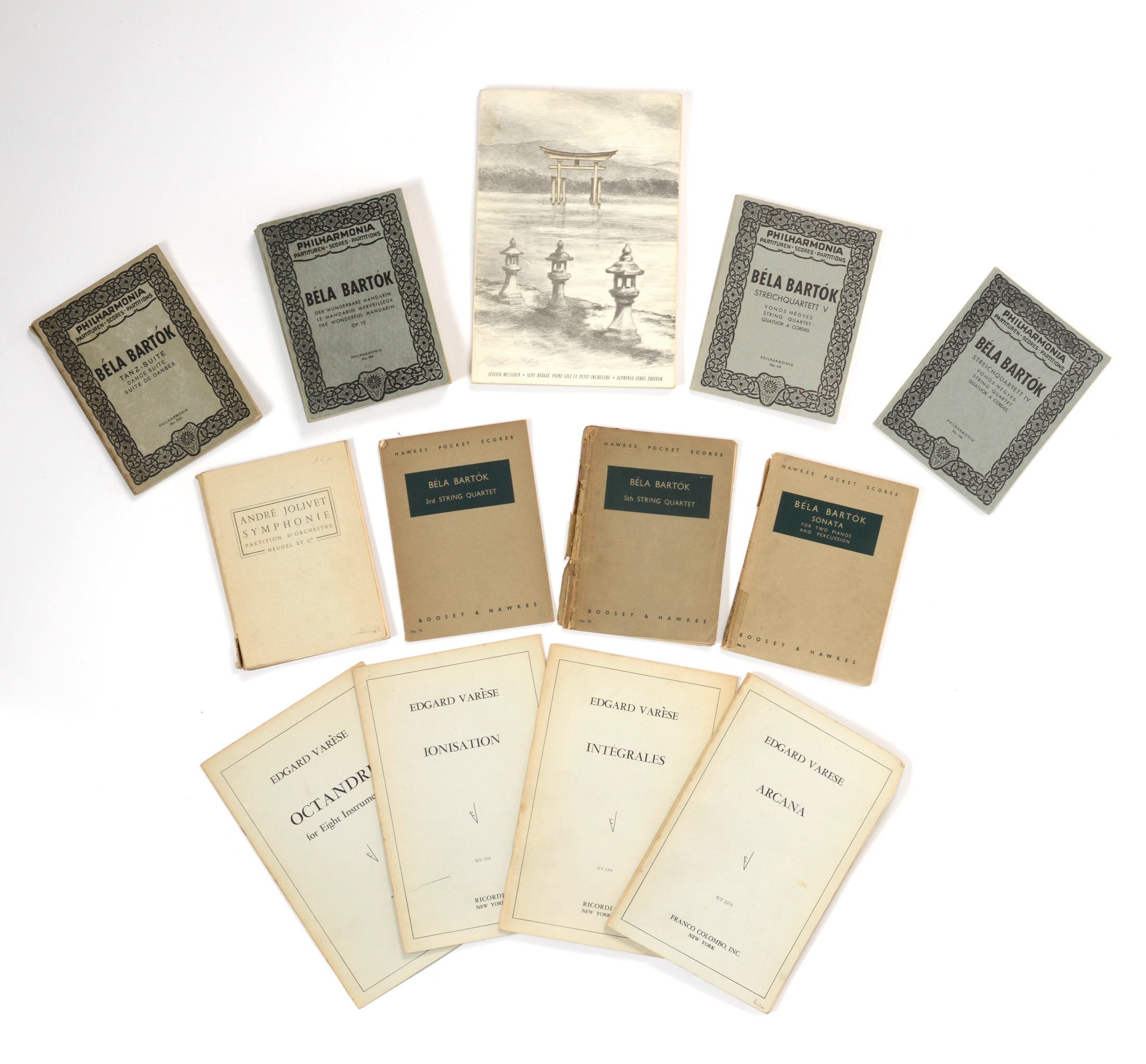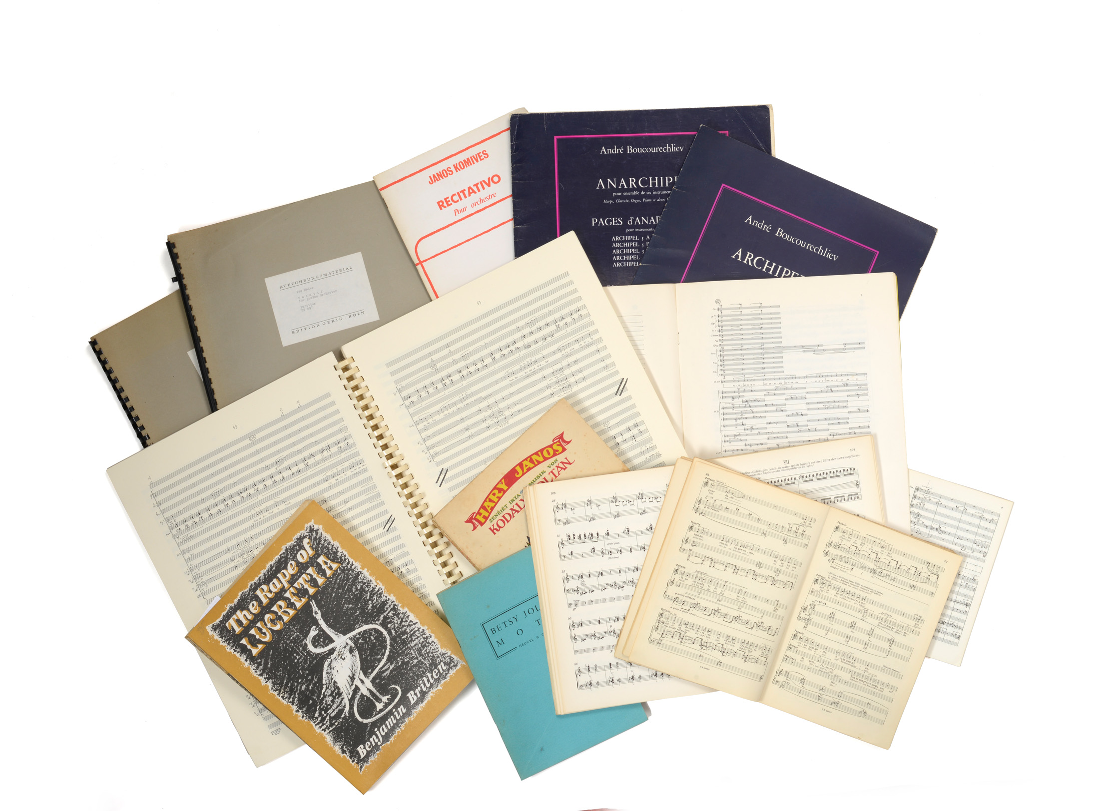 Oeuvres de : Gilber AMY ( Inventions ), Tadeusz BAIRD ( Erotyki ); Bela BARTOK (8 partitions « de poche » - Philarmonia -, quatuors et Le Mandarin merveilleux, et 2 partitions grand format); Alban BERG (3 partitions type « studien-partitur » (partition complète en petit format) dont Lulu Suite ); André BOUCOURECHLIEV( Anarchipel, Archipel 4, 2 grands in folio); Pierre BOULEZ (5 partitions d'orchestre petits formats - Universal, Heugel -); Benjamin BRITTEN ( The Turn of the Screw », The Rape of Lucretia ); Sylvano BUSSOTTI (Rara); Marius CONSTANT (Le Souper); Luigi DALLAPICOLA (Tre poemi, Volo di Notte en mauvais état); Paul DESSAU (9 partitions dont quatre avec de beaux envois autographes signés (20 Lieder et Die Verurteilung von Lukullus, An meine Partei avec carte autographe signée); Henri DUTILLEUX (IIe symphonie en partition d'orchestre); Jean-Claude ELOY ( Etude III ); Hans EISLER ( Lieder und Choere ); Hans Werner HENZE (6 partitions, dont les piano et chant Boulevard Solitude, Das Wundertheater, Der Idiot, Undine); Philippe HERSANT (Le Château des Carpathes, grand in folio, 184 pp., tampons Durand); Betsy JOLAS ( Mots ); André JOLIVET (3 partitions type « studien-partitur », état moyen); Zoltan KODALY (Hary Janos, mauvais état); Janos KOMIVES (Epilogues avec envoi autographe signé, Recitativo pour orchestre); Joseph KOSMA ( A l'assaut du Ciel, orchestre et chant, in folio,197 pp., demi-toile verte, défauts), Witold LUTOSLAWSKI ( Five songs ); Hans-Martin MAJEWSKI ( La mort de Marat, piano et chant, in-4, 67 pp.); Ivo MALEC (3 partitions d'orchestre format in folio et grand in folio); Olivier MESSIAEN (5 partitions d'orchestre Durand, Leduc, 2 en état moyen); Luigi NONO (4 partitions type « studien-partitur » dont La Victoire de Guernica ); Serge PROKOFIEFF (Deuxième symphonie, partition d'orchestre in folio, Édition russe de musique, 1928, dos toilé de l'éditeur, 217 pp. Édition originale rare, état moyen); Arnold SCHOENBERG (11 partitions dont 4 en mauvais état); Edgard VARESE (8 partitions d'orchestre Ricordi New York); Anton WEBERN (11 partitions type « studien-partitur » Universal, une en mauvais état); Iannis XENAKIS : (14 partitions tous formats, du poche au très grand in-folio, certaines en fac simile autographe, état moyen).