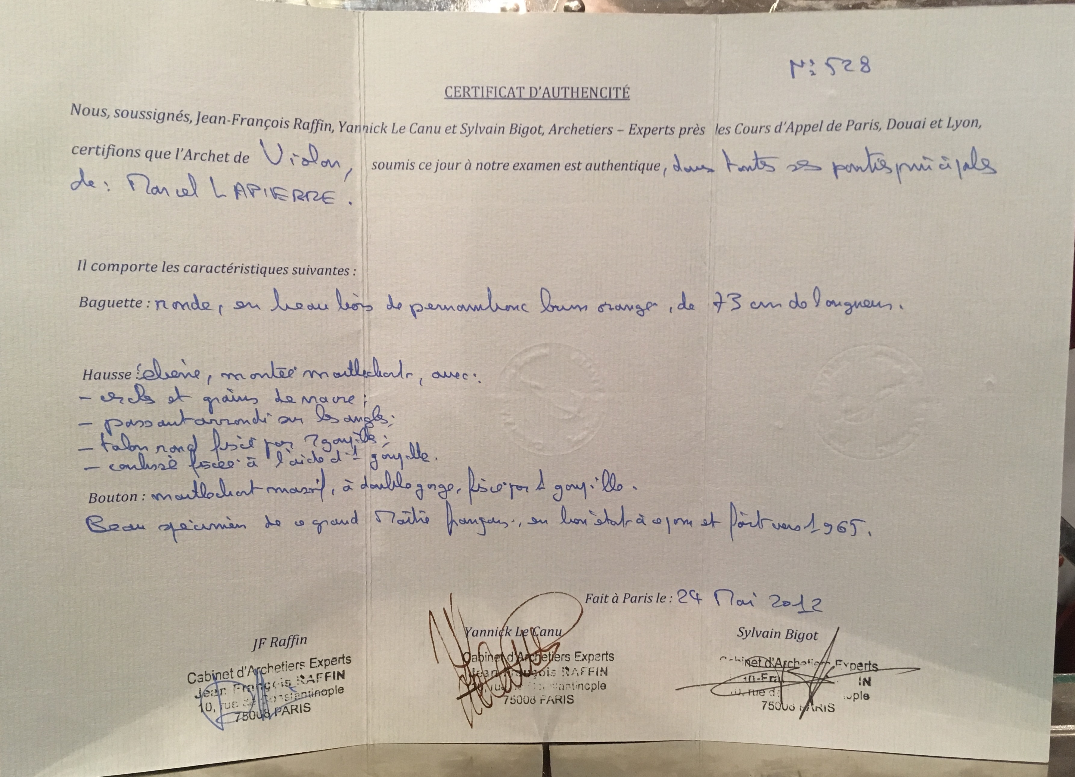 French violin bow by Marcel LAPIERRE. Certificate J.F Raffin. good condition.