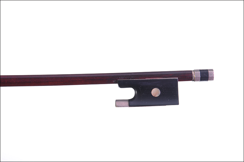 Archet de violon portant la marque de CUNIOT HURY , baguette en pernambouc 73,1cm, hausse en ébène montée maillechort, sans mèche ni garniture