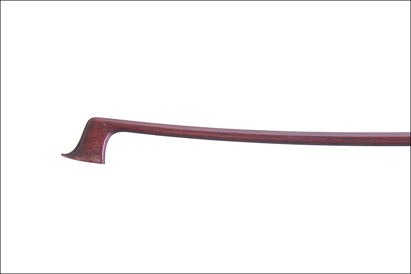 Archet de violon fait à Mirecourt vers 1900. Baguette octogonale en pernambouc. Hausse ébène montée maillechort. 721 mm. 55g sans mèche, garniture argent sur soie.