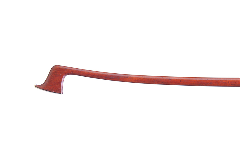 Archet de violon portant une marque au fer apocryphe de Emile Ouchard. Baguette ronde en pernambouc. Hausse ébène montée argent. Manque l'argent plein du bouton. 733 mm