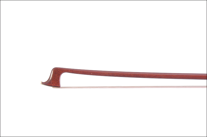 Archet de violon fait à Mirecourt au début du XXe siècle. Baguette ronde en pernambouc. Hausse ébène montée maillechort. 730 mm. 59g.