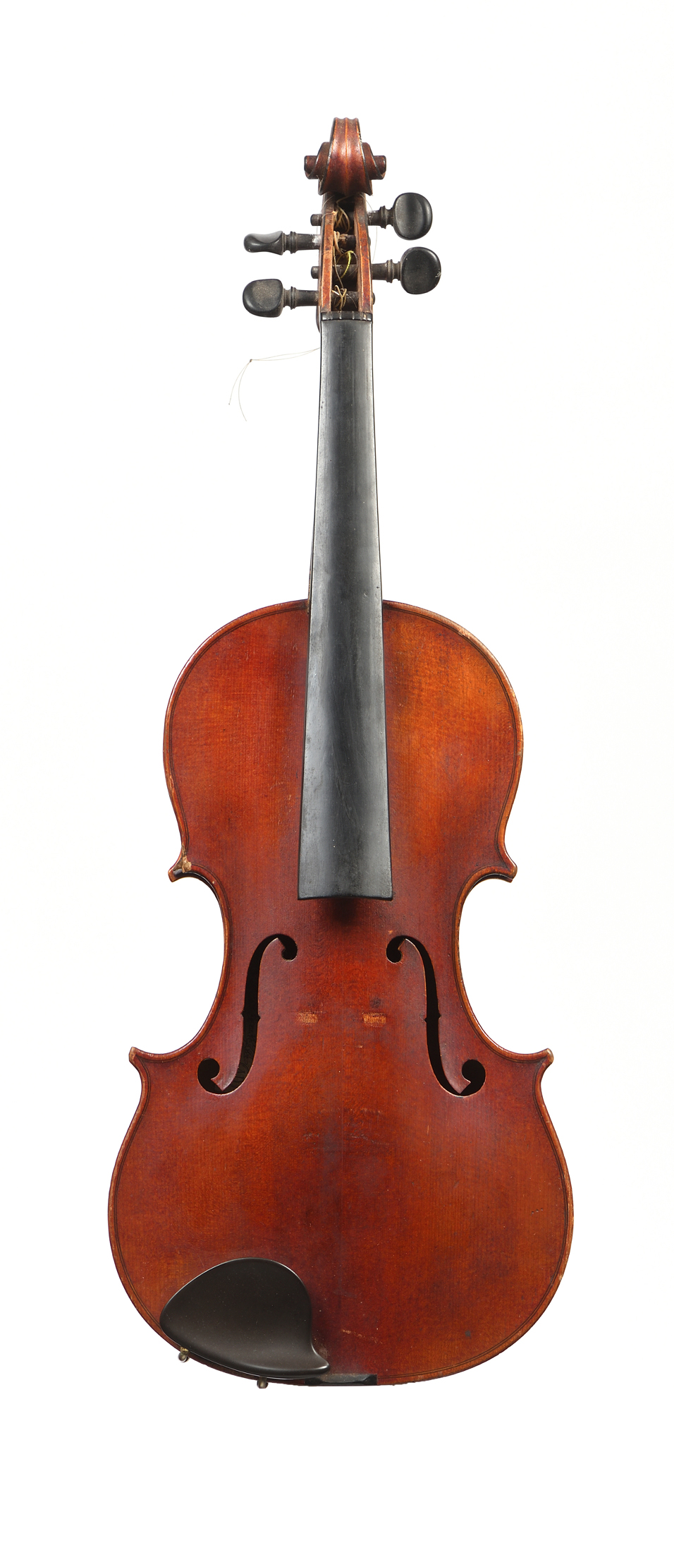 dont il porte l'étiquette au millésime de 1903 à Bordeaux. Contresigné. " Alexdre Delanoy à Bordeaux, élève de JB Vuillaume..." Beau fond de deux pièces en bel érable aux ondes régulières. Table de deux pièces en épicéa. Eclisses et tête du même bois. Un coin abimé. Une trace de vers. 357 mm. Avec boite et archet. Bon état général.