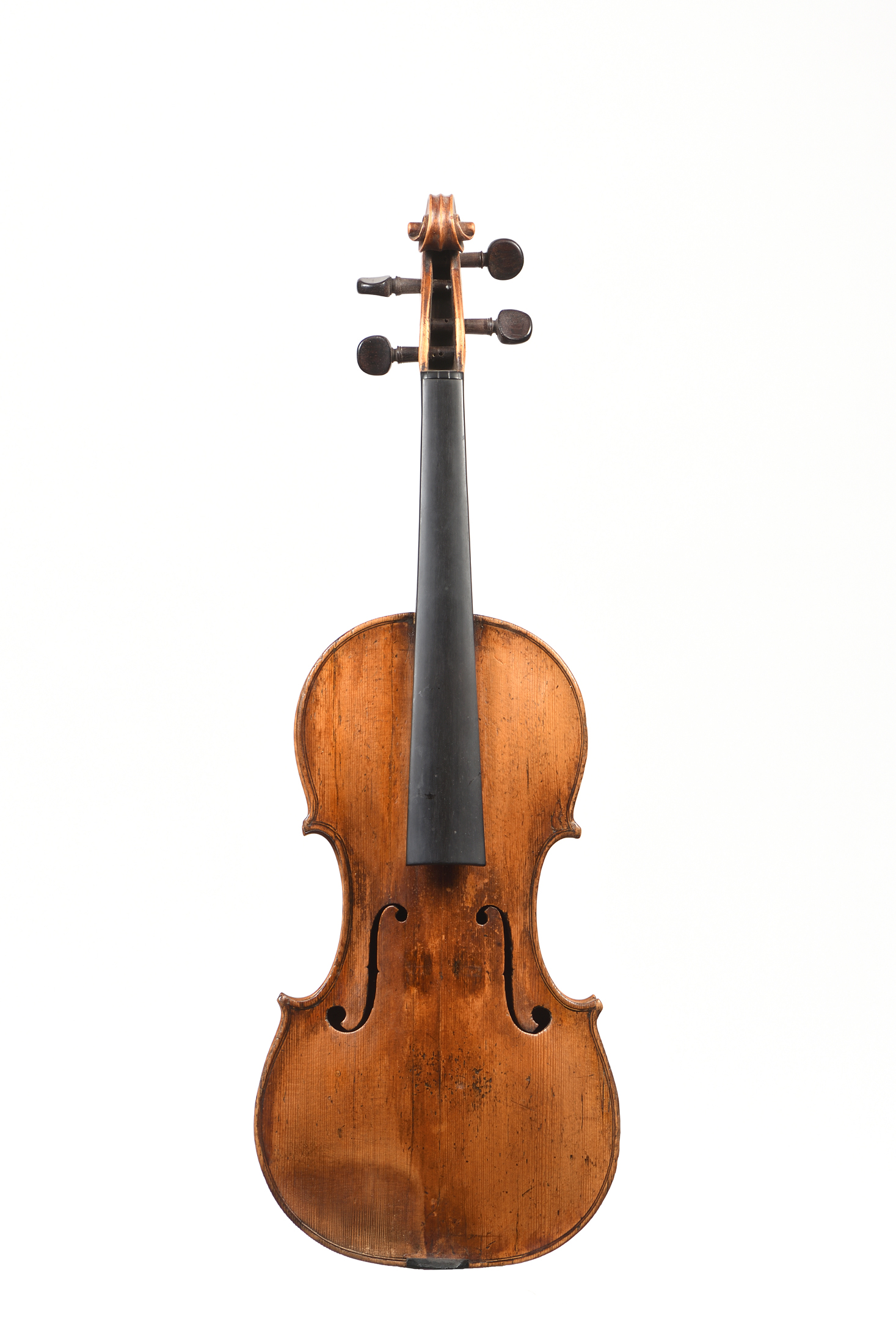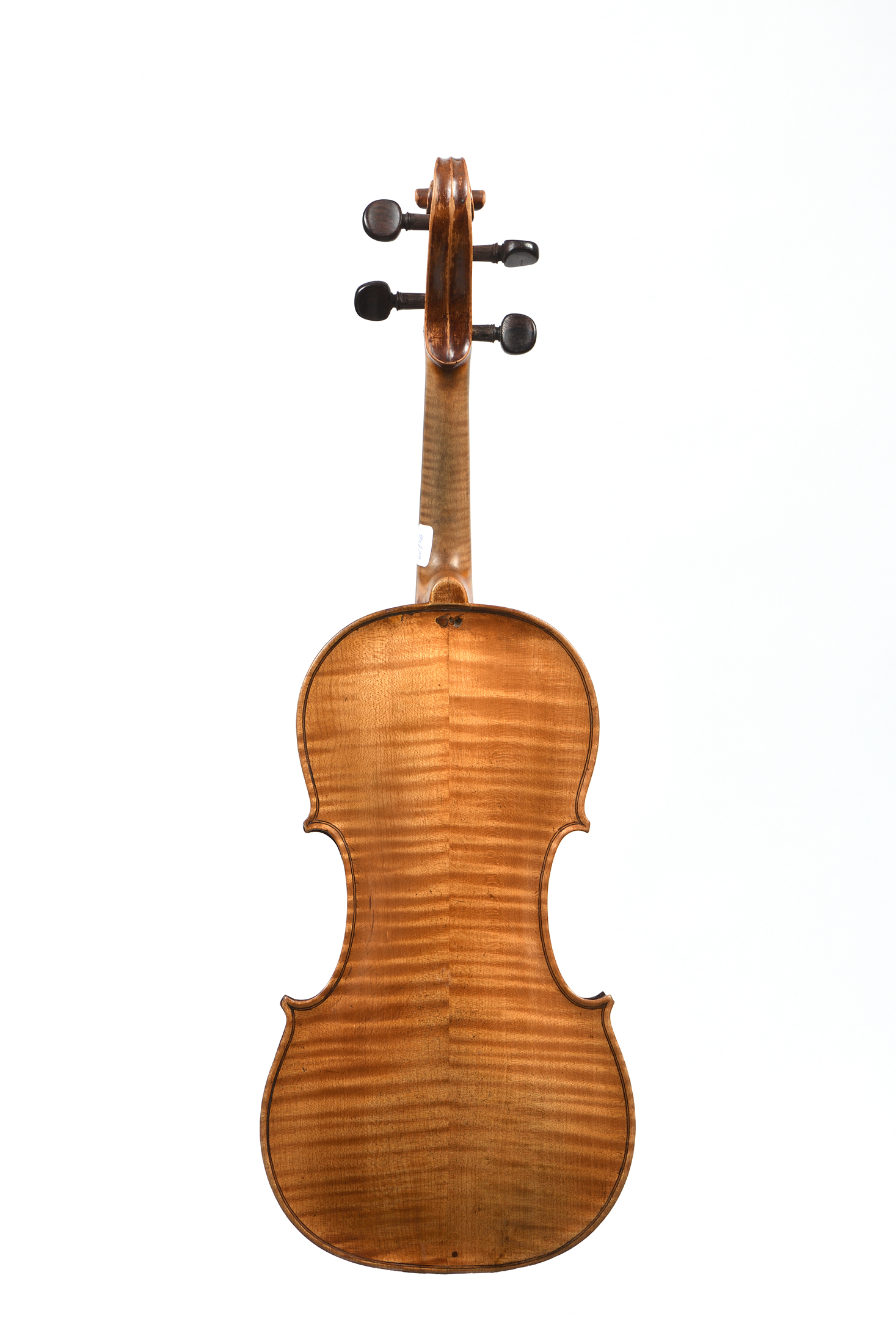 dont il porte l'étiquette originale " René CHAMPION, rue saint martin... 17?", fait en deuxième partie du XVIII. Dans le style de Jacques Boquay. Fond de deux pièces en bel érable aux ondes régulières. Eclisses du même bois et Tête sur couche. Table en en épicéa.Vernis brun doré. Bon état de conservation: Diverses cassures restaurées. 357 mm.