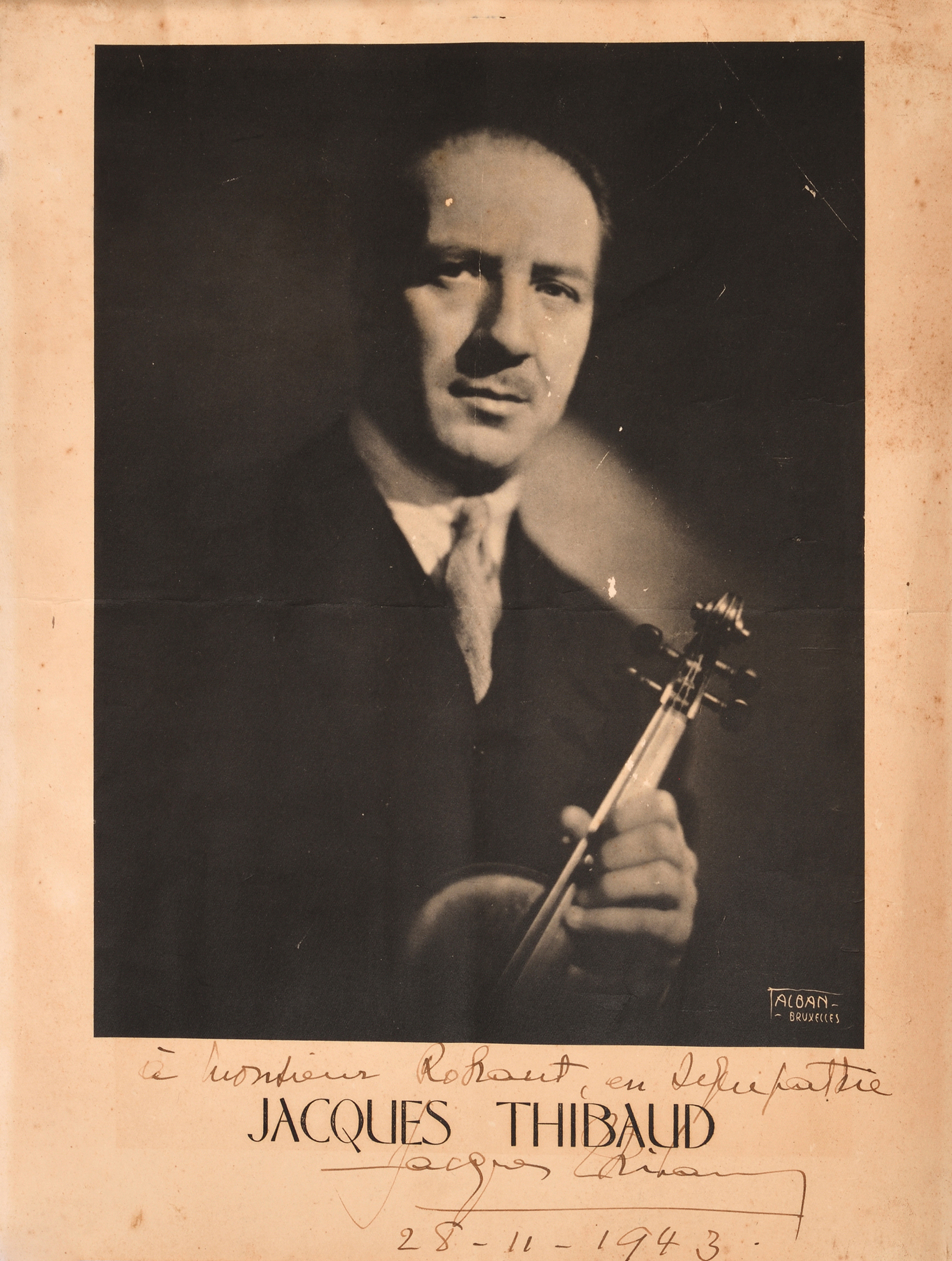 Portrait du célèbre violoniste Jacques Thibaud. Autographe à l'encre. ALBAN BRUXELLES. 39 X 30 cm. Traces d'humidité et pliures.