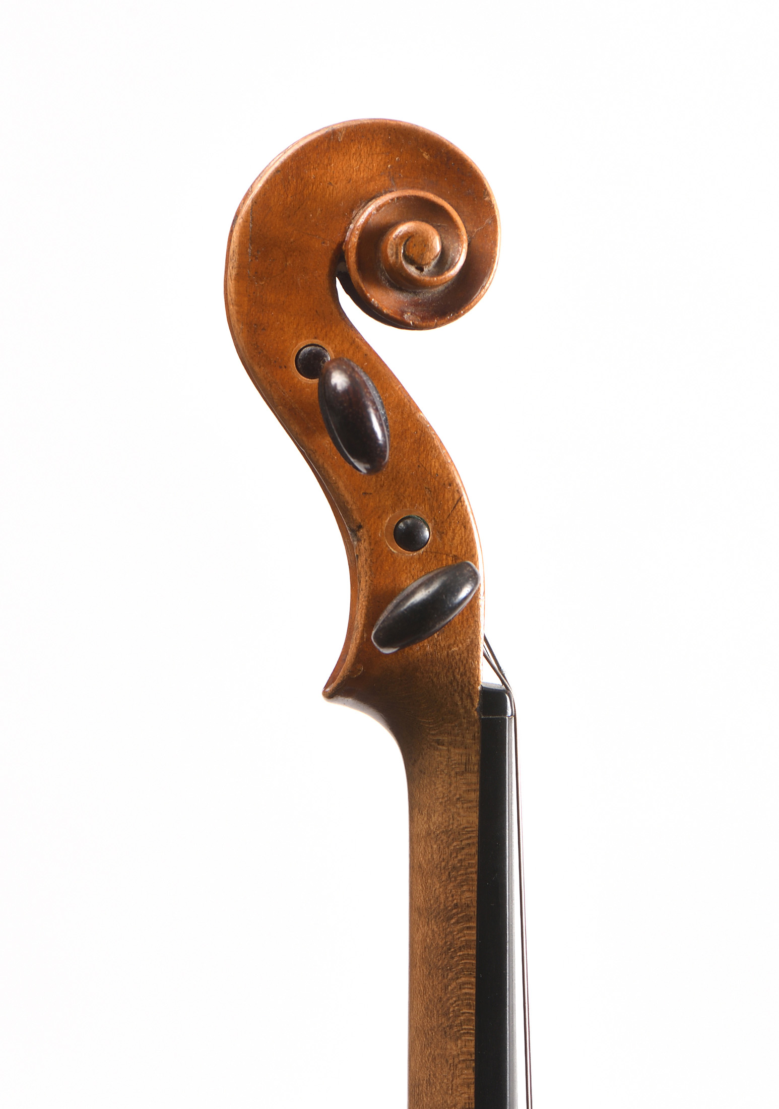 portant une étiquette "GAVINIES, Rue S Thomas du Louvre, à Paris, 1770" Fait au XVIIIe, "Vieux PARIS". Vernis brun sur fond doré. Fond de deux pièces en bel érable aux ondes régulières horizontales. Table en épicéa aux pores serrés au centre, s'élargissant sur les bords. Diverses cassures restaurées à la table, dont une à l'âme. 353 mm. Prêt à jouer.