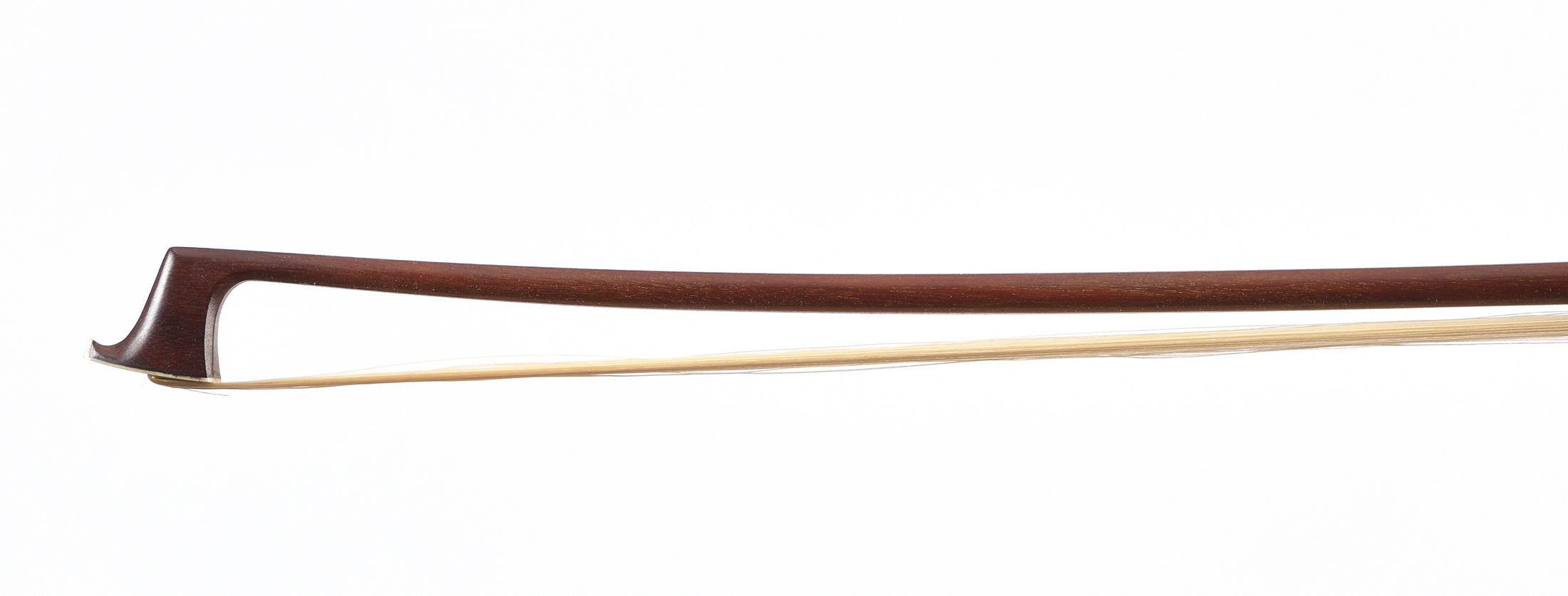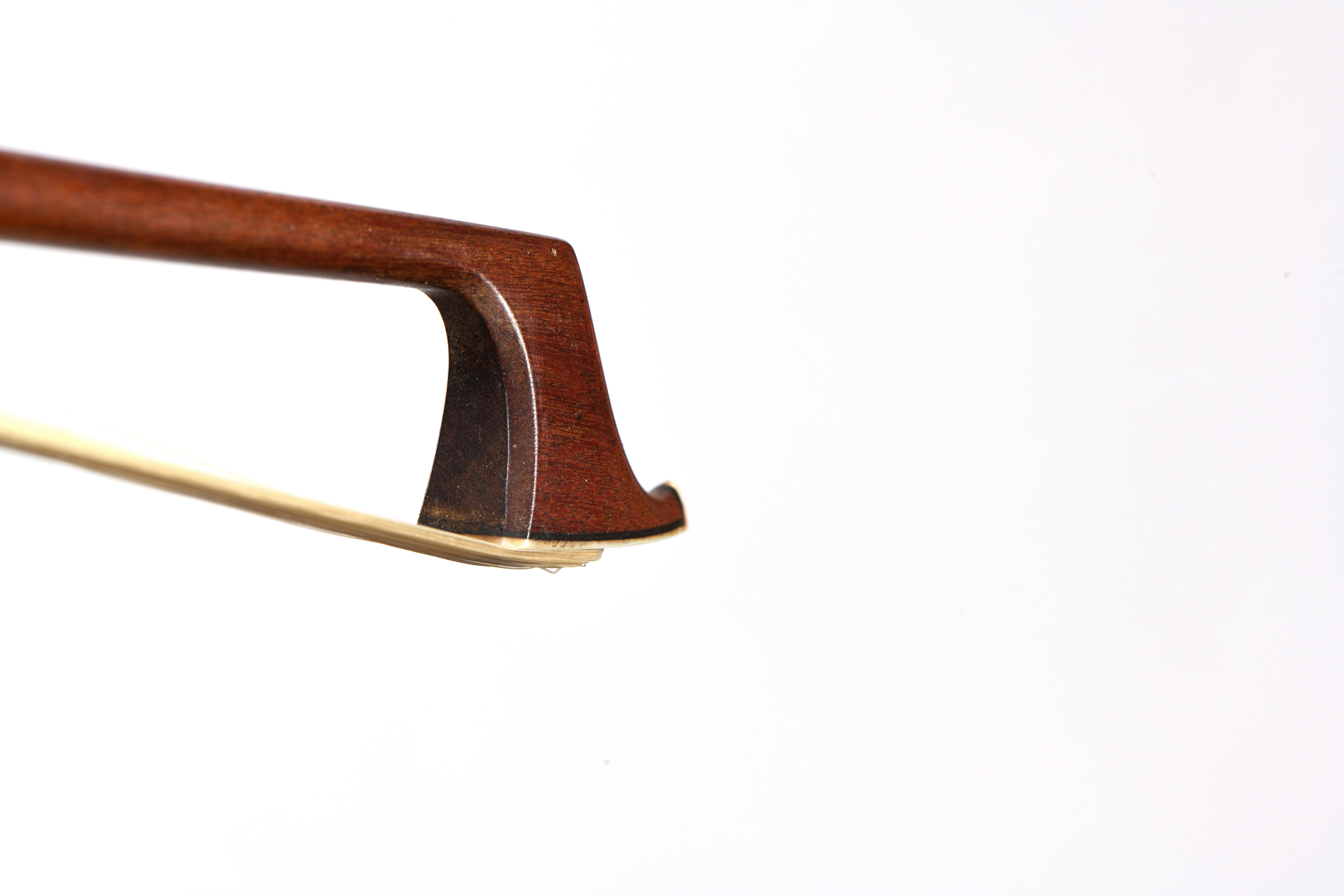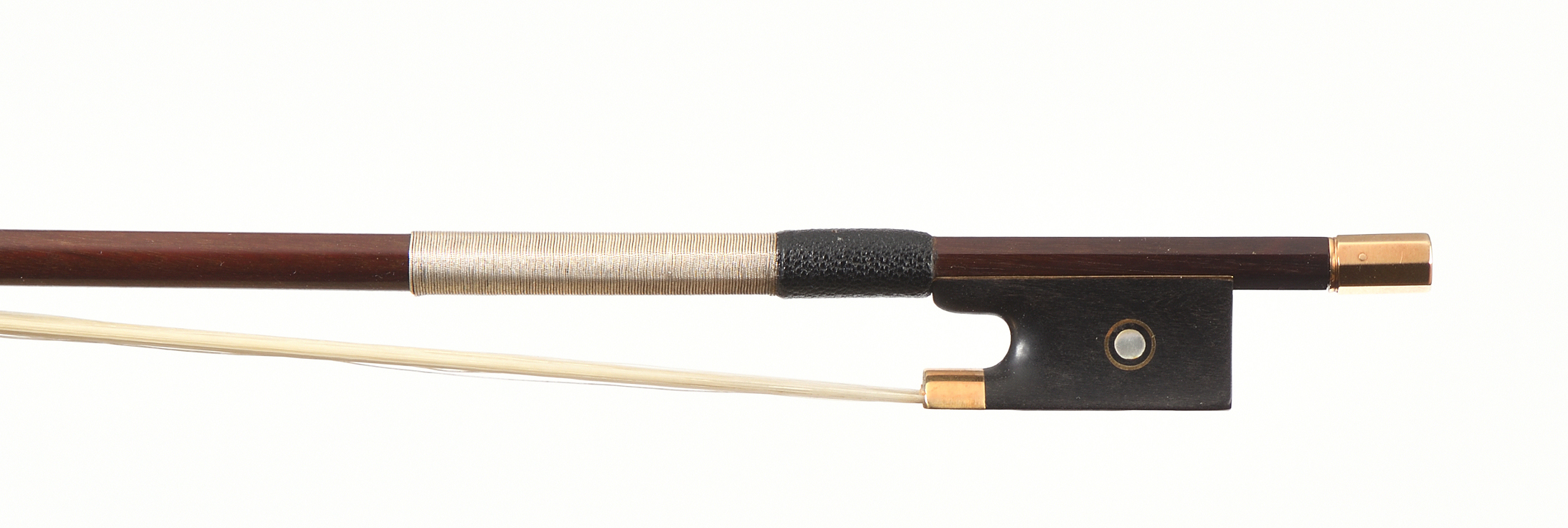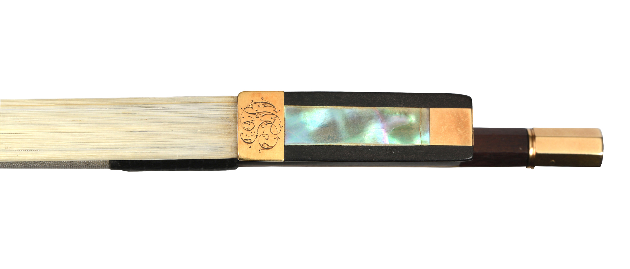 Rare et Intéressant archet monté or attribué à Jules FETIQUE. Portant les initiales du musicien SD. Baguette ronde en beau bois de pernambouc. La hausse est en ébène montée or avec grain de nacre cerclé d'or. 726 mm. 65 g avec garniture argent sur soie.