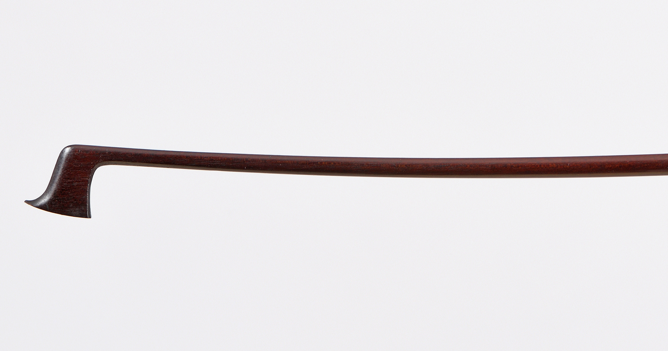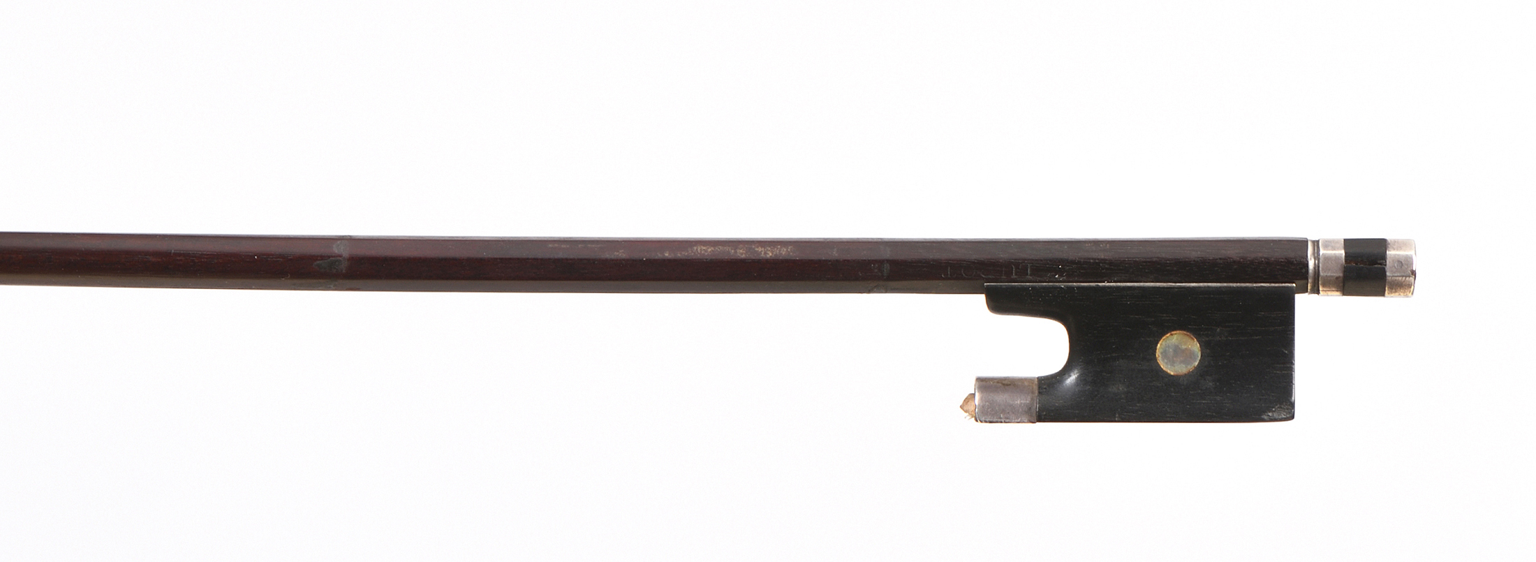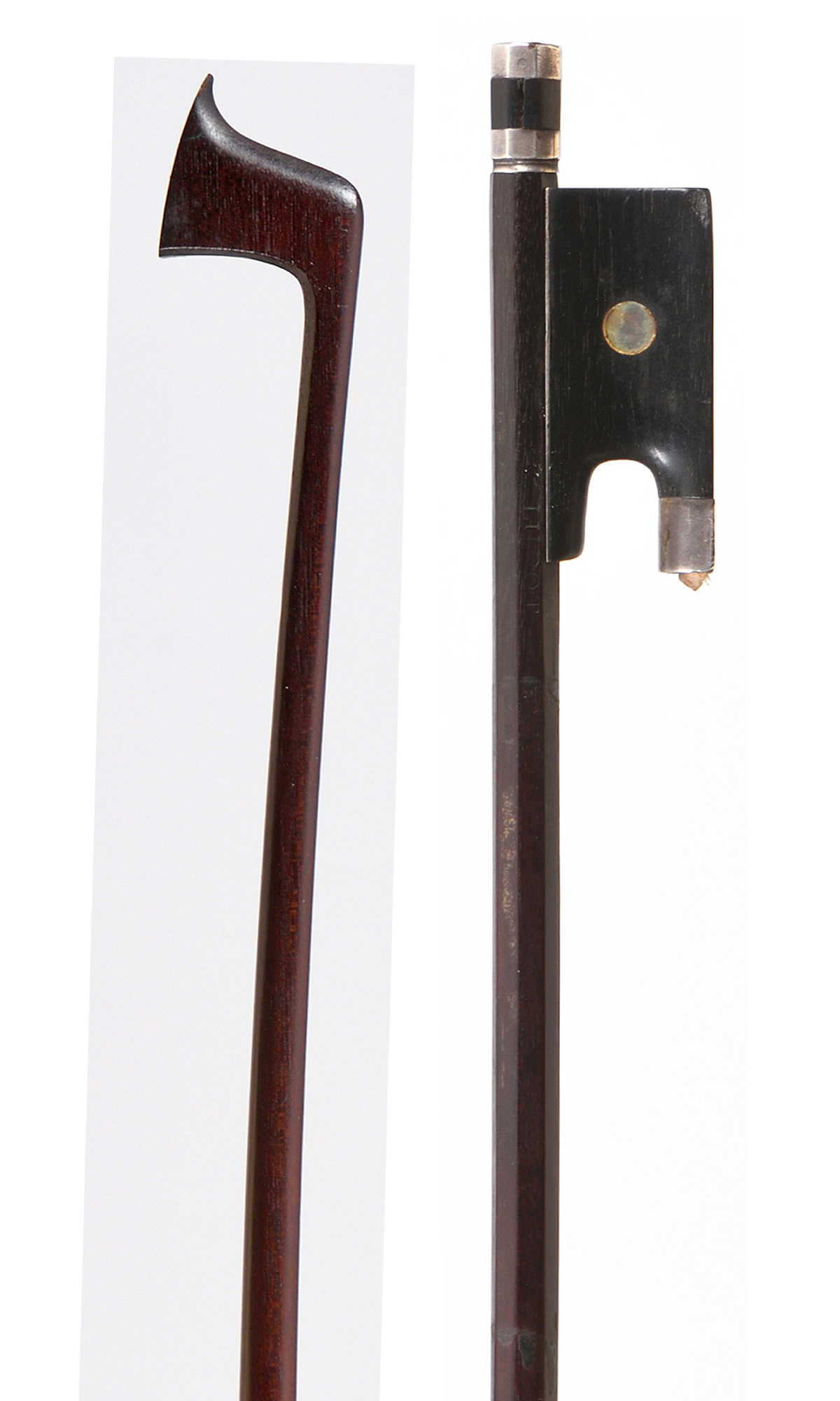 Exceptionnel archet fait par Charles Nicolas BAZIN portant une marque au fer LUPOT. Baguette ronde en bois de pernambouc. Hausse ébène montée argent. Bouton de trois pièces à restaurer. 52,5 g. 728 mm.