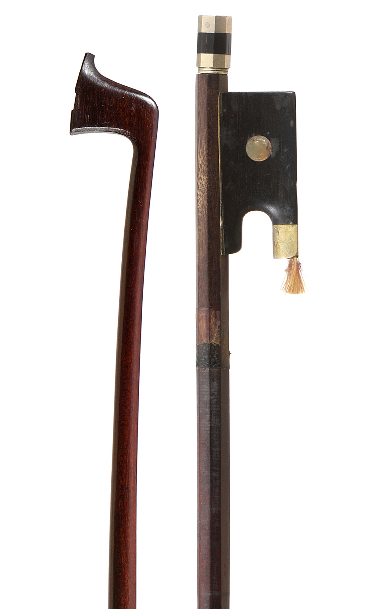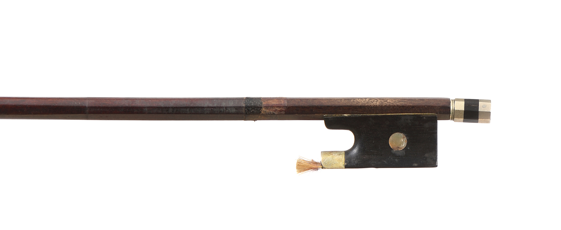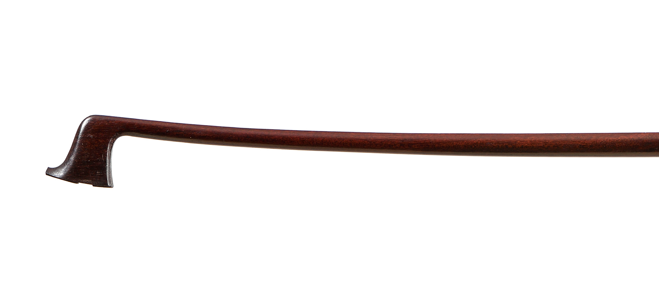 Baguette ronde en beau bois de pernambouc brun. Hausse ébène montée maillechort. 51,4 g sans mèche, ni garniture. avec certificat de DAGUIN. 728 mm.