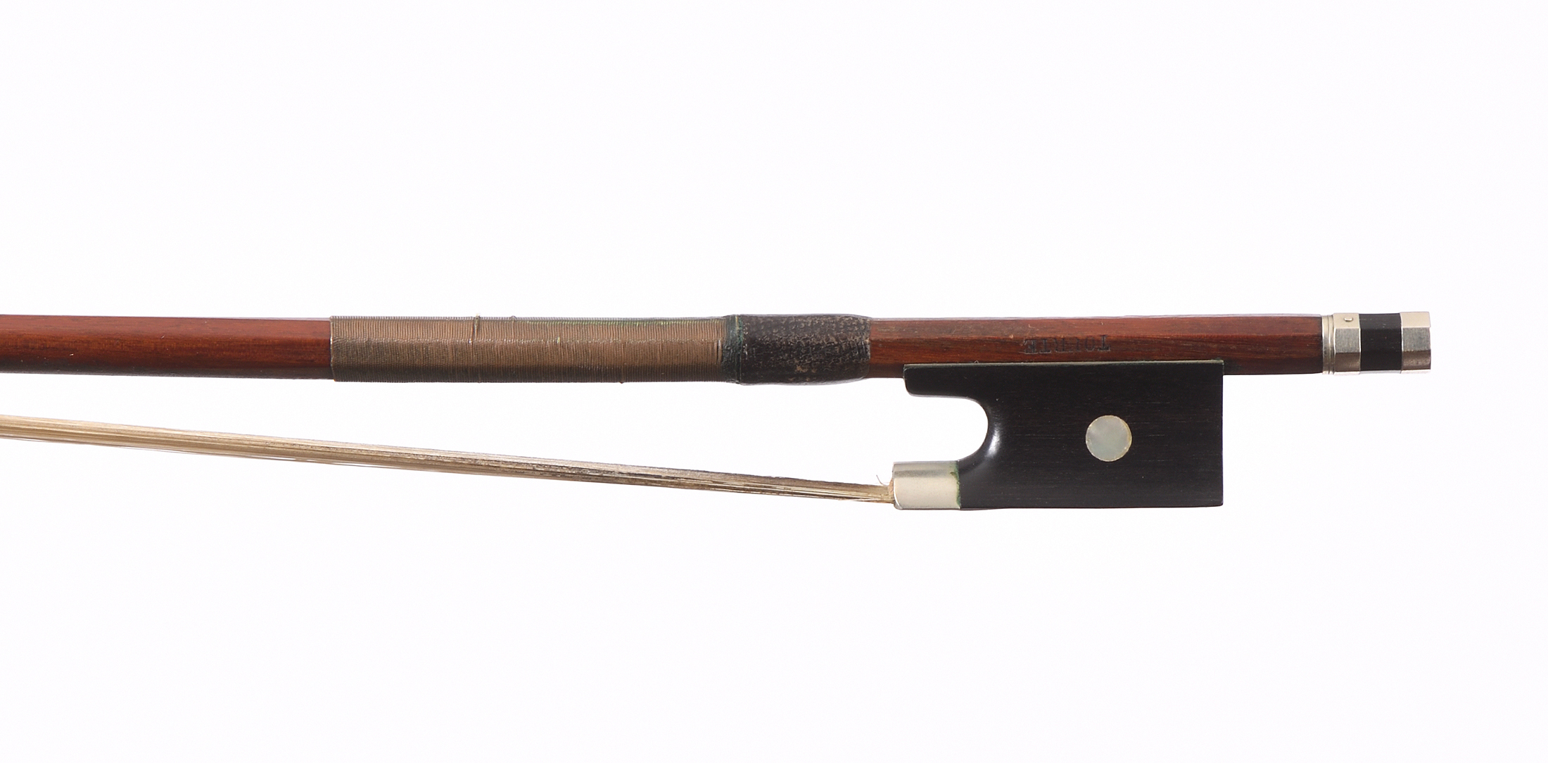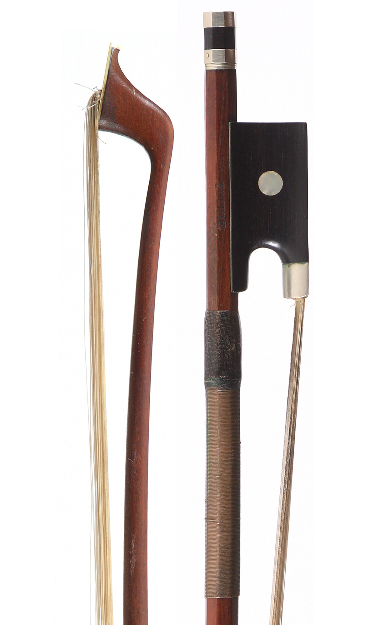 portant une marque TOURTE, avec une tête dent de requin. Belle baguette ronde en pernambouc. Hausse ébène montée maillechort. 731 mm. 51,7 g.
