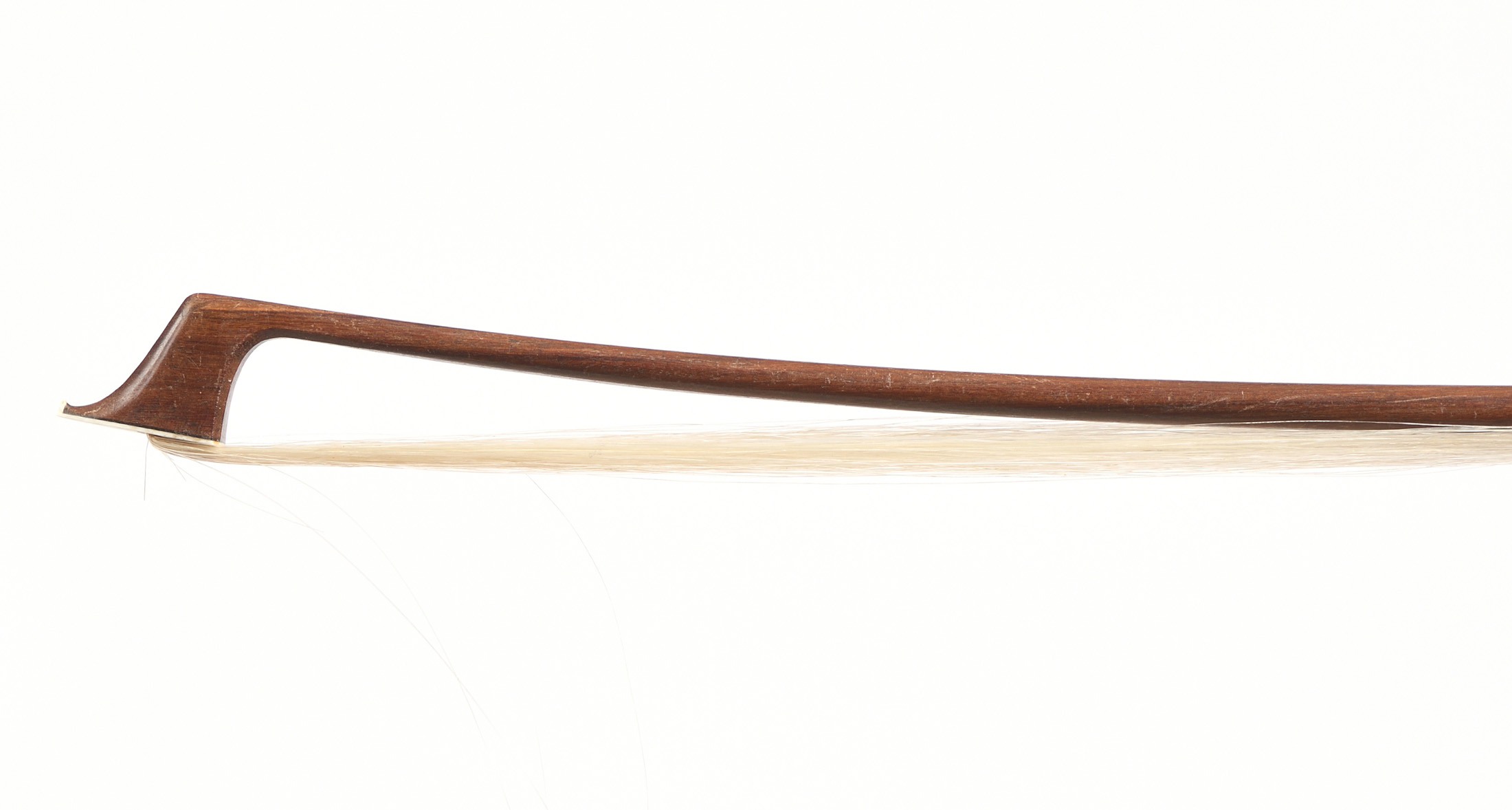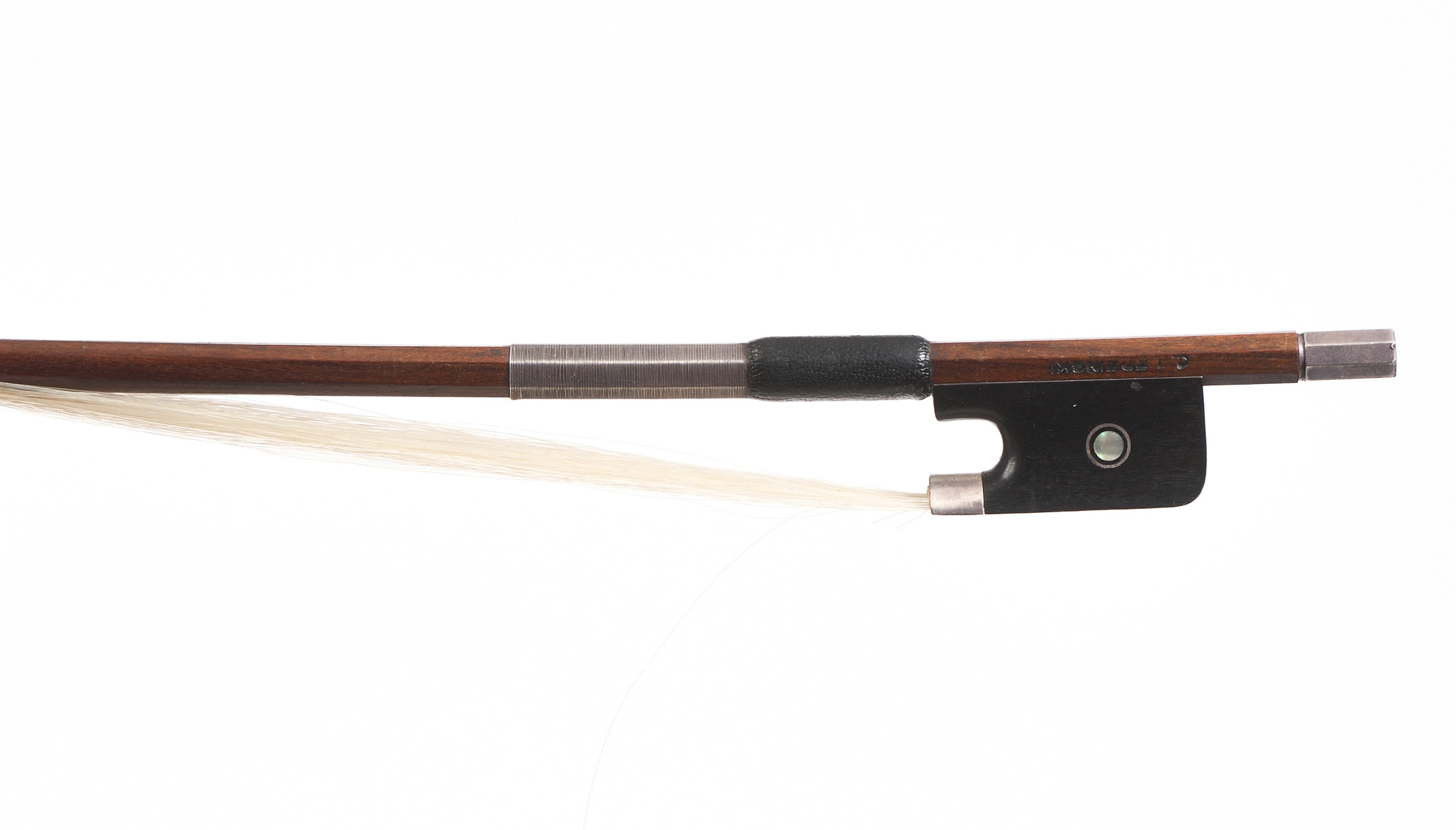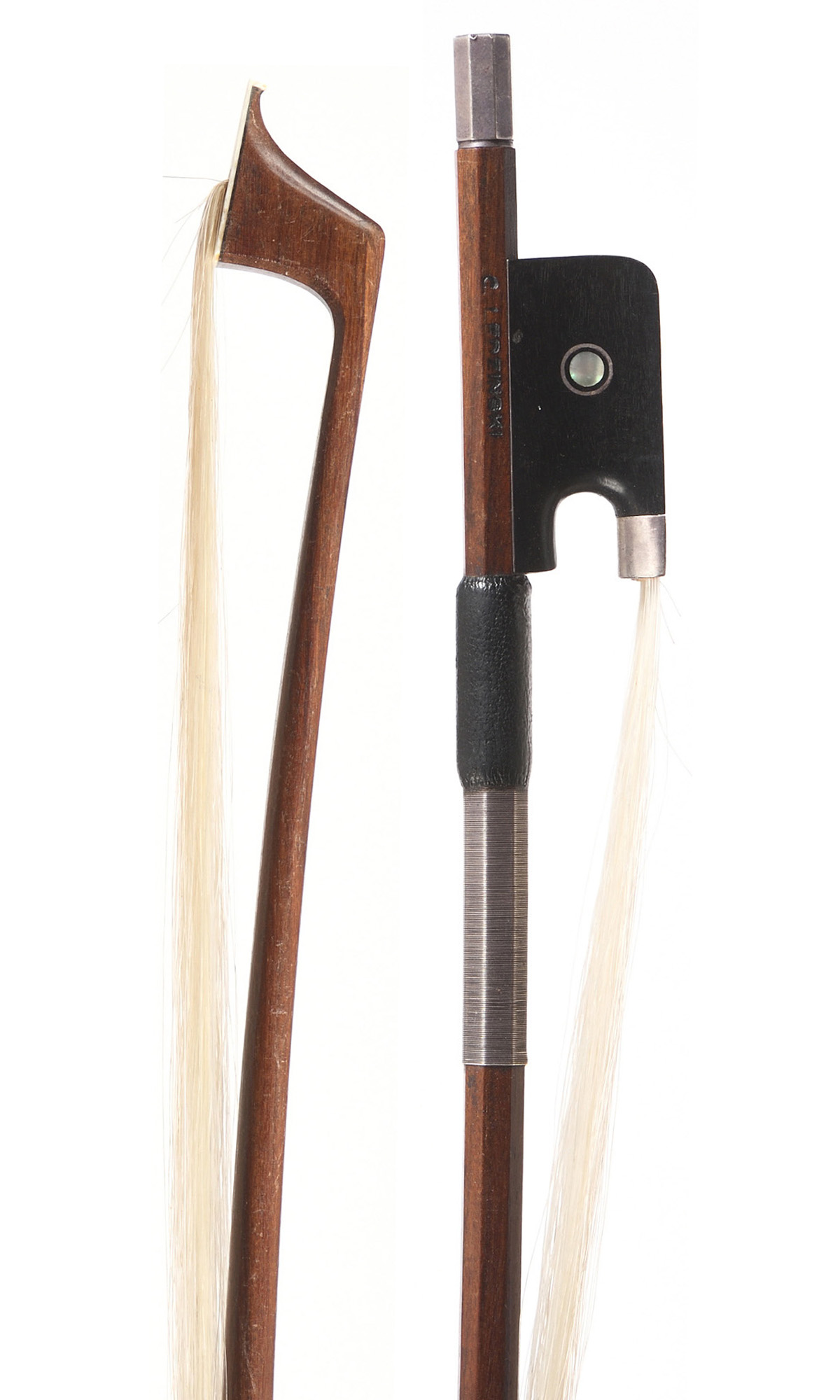 Archet contemporain, portant une marque "C. LEDZINSKI". Baguette ronde en bois de pernambouc. Hausse ébène montée argent. 695 mm. 74,5 g.