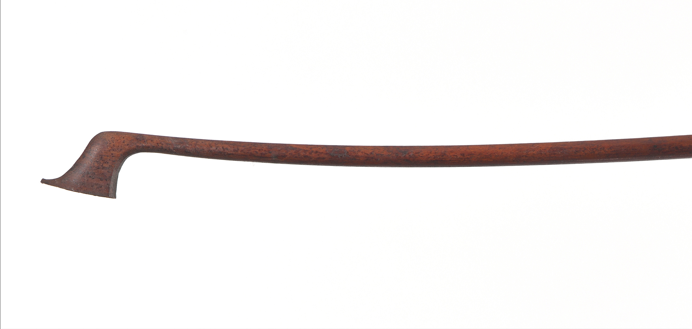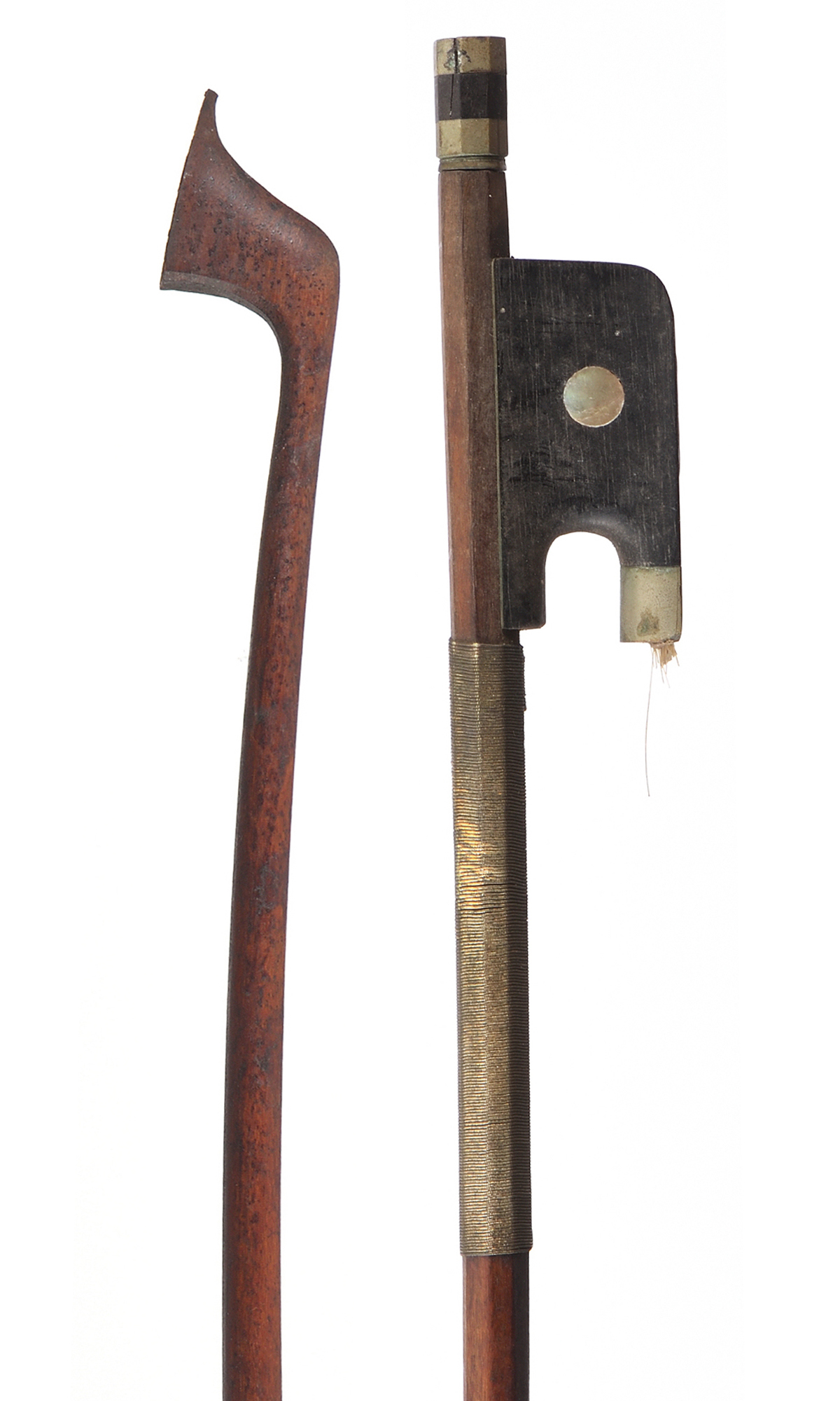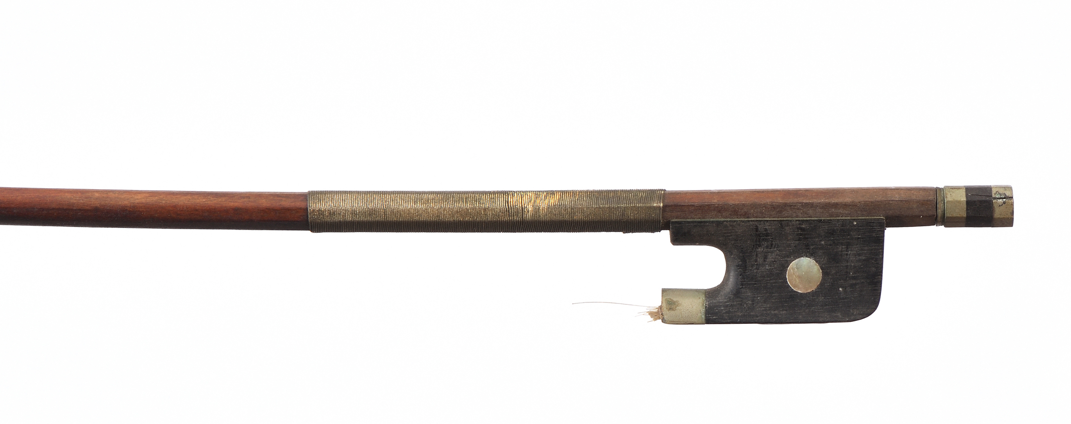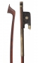 Intéressant archet fait à Mirecourt. Baguette ronde en bois de pernambouc. Hausse ébène montée maillechort. 696 mm. 56,5 g sans mèche, sans plaque de tête.