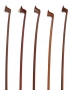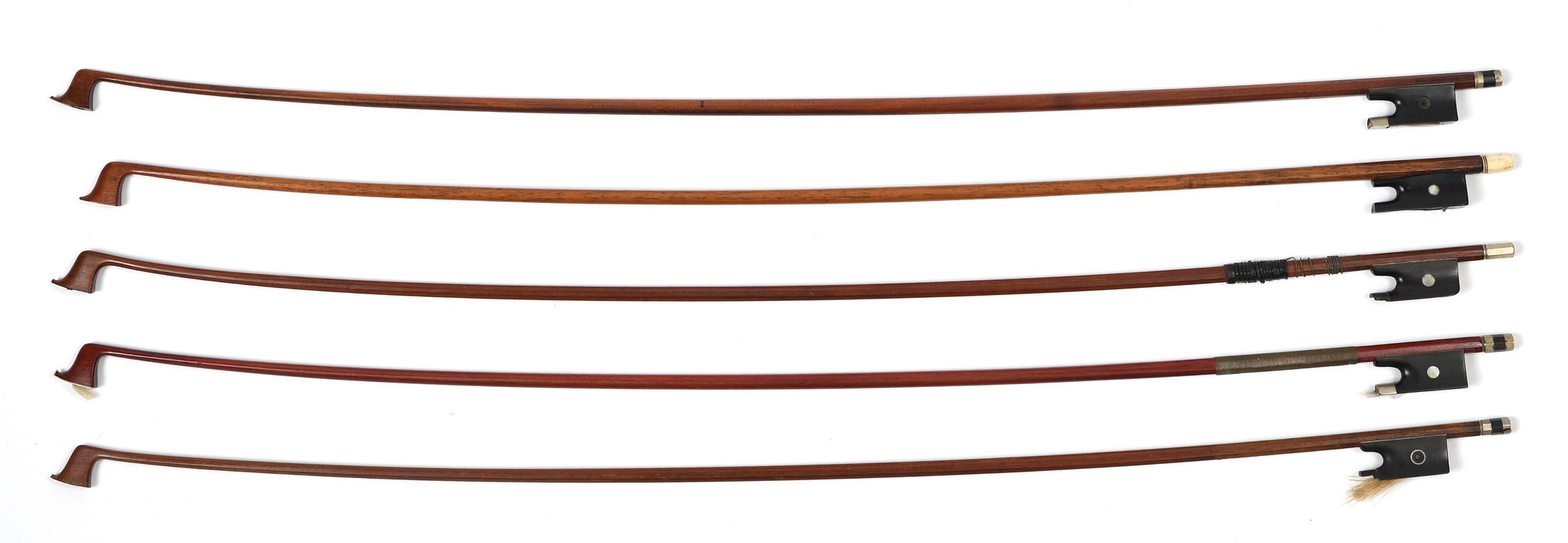 Lot de cinq archets de violon en bois exotique. Marque au fer CLASQUIN, Bouton en os. L'ensemble est à restaurer.
