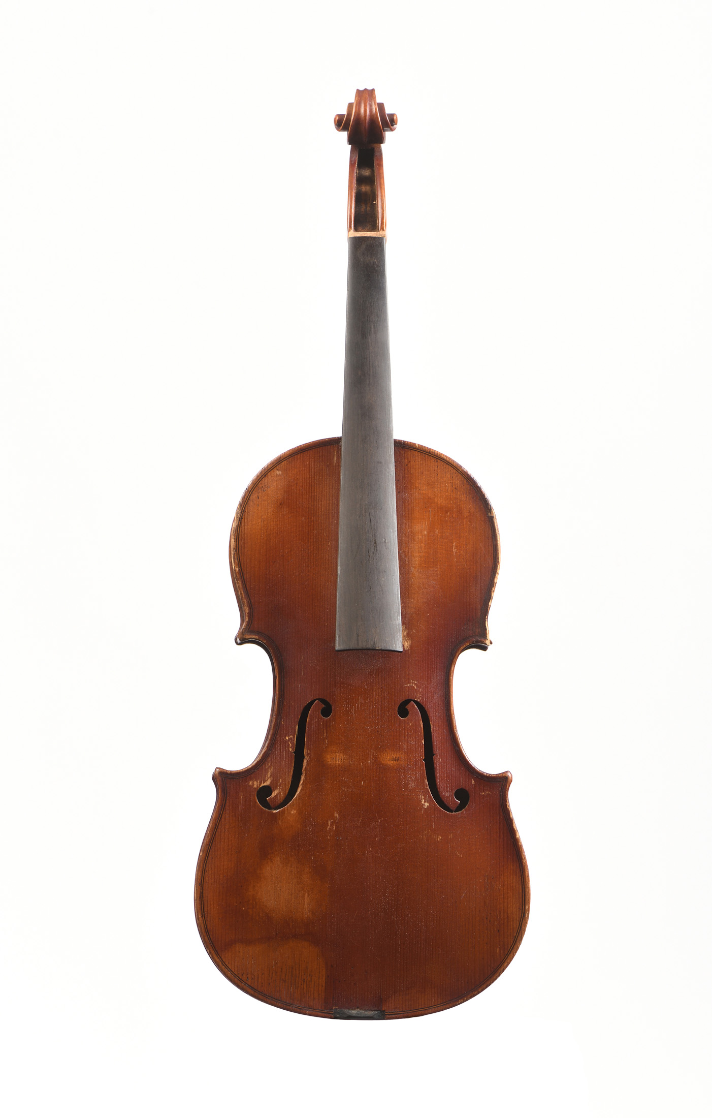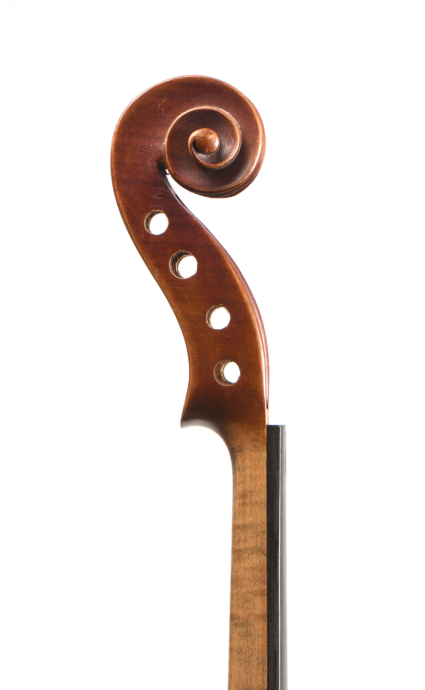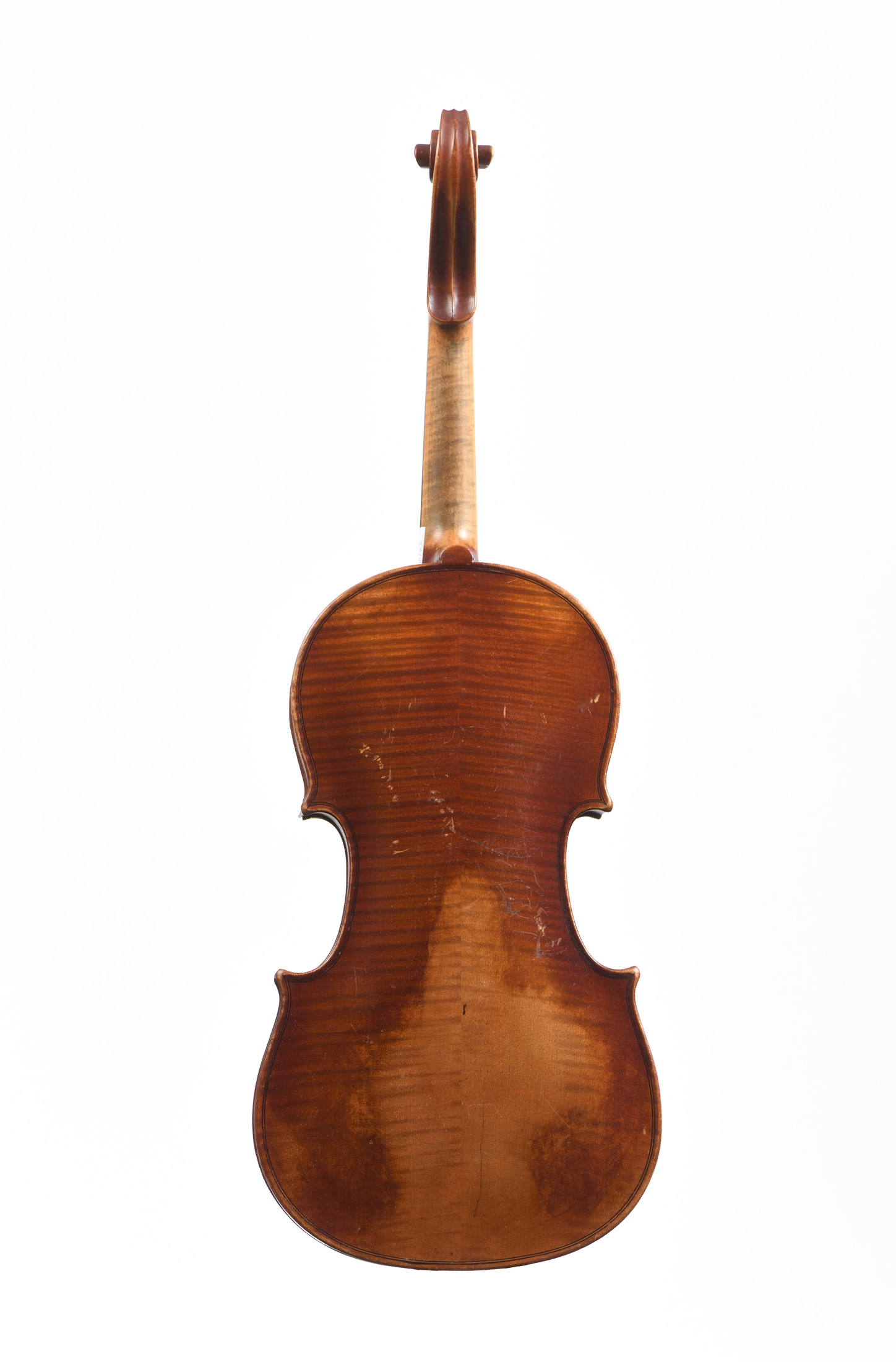 portant une étiquette apocryphe "Nicolas AMATI". Fond de deux pièces en érable ondé aux ondes régulières. Table en épicéa aux pores larges. Vernis brun rouge sur fond doré. 360 mm. Vernis retouché.