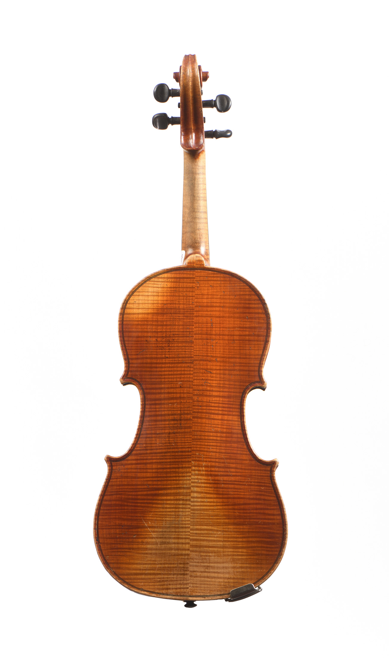 portant une étiquette "Modèle d'après Stradivarius...1721". Fait dans le style de Derazey, à Mirecourt. Fond de deux pièces en érable aux petites ondes régulières, très marquées. Vernis brun orangé sur fond doré. 361 mm.