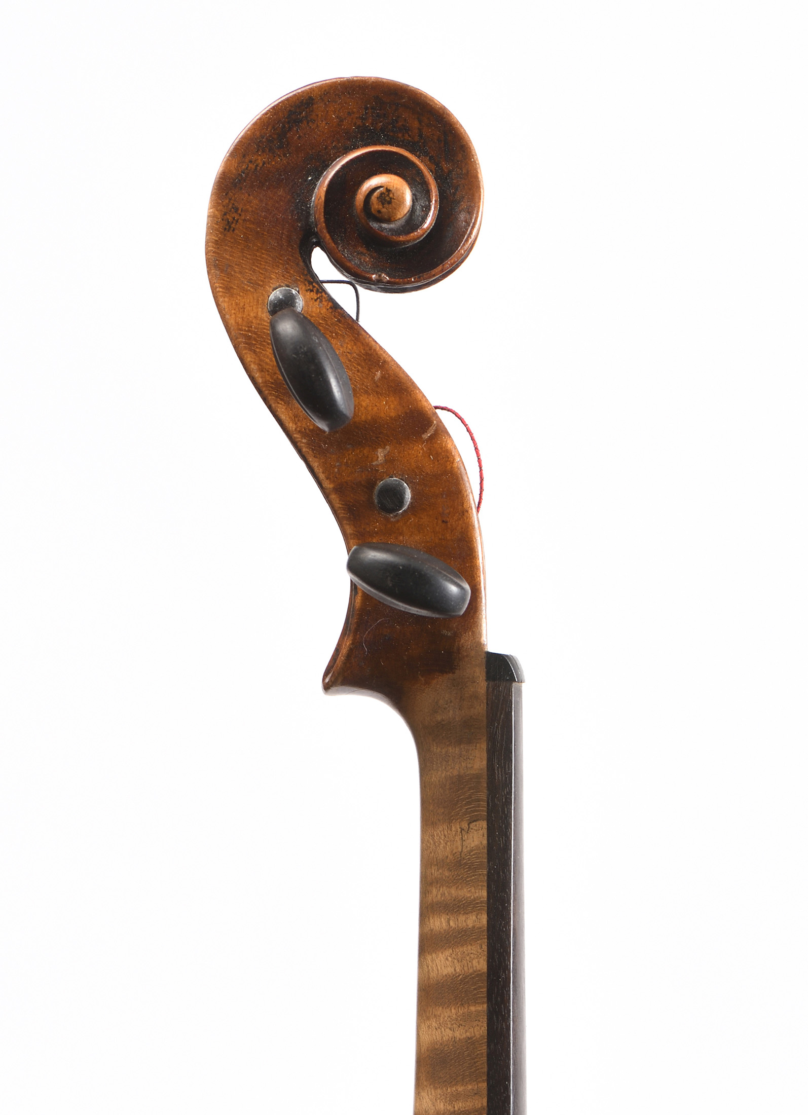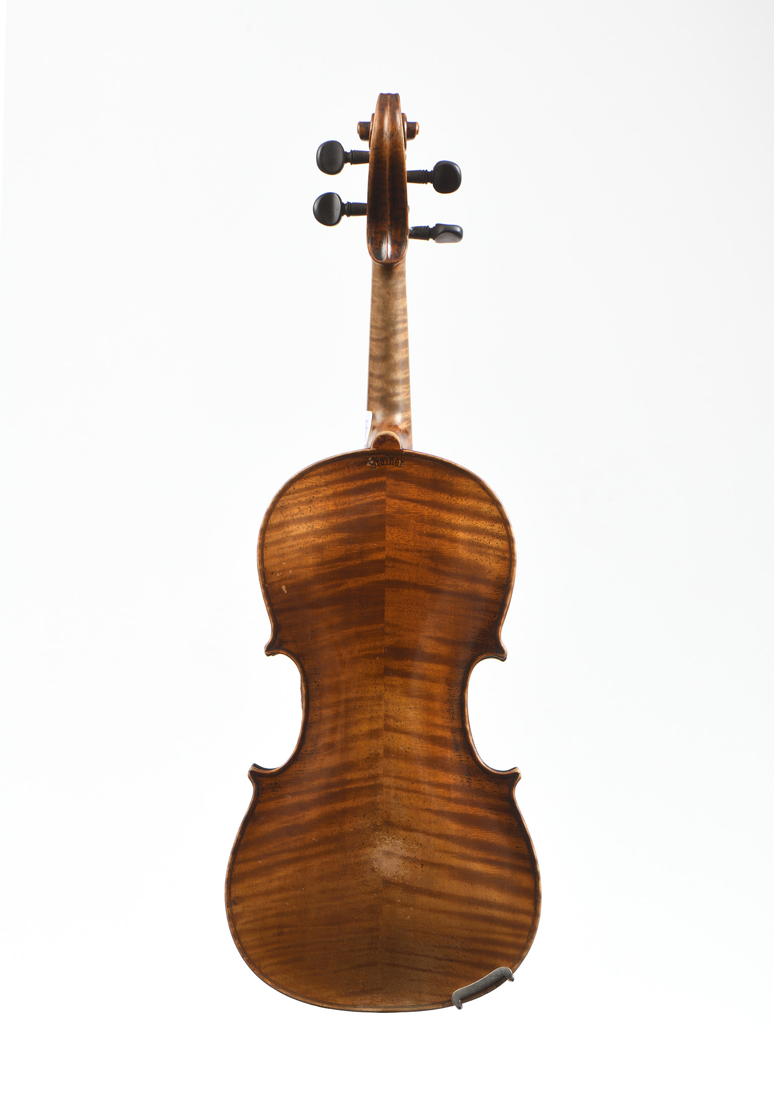 Fond de deux pièces en érable. Vernis brun sur fond doré. 359 mm. Avec boite et deux archets. Diverses cassures de table restaurées.