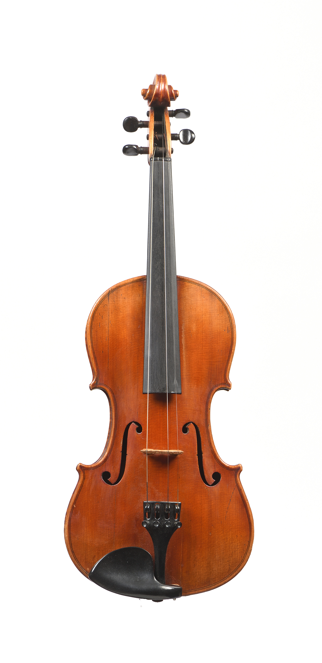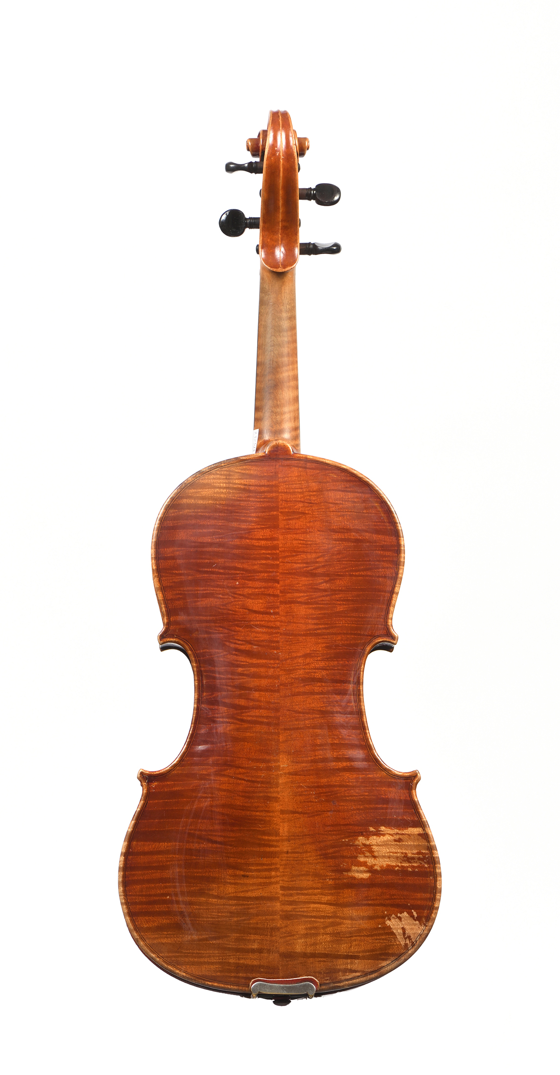 portant une étiquette Stradivarius 1724. Fond de deux pièces en érable maillé. Vernis brun orangé. Avec boite et archet sans valeur commerciale. Diverses cassures. 355 mm.