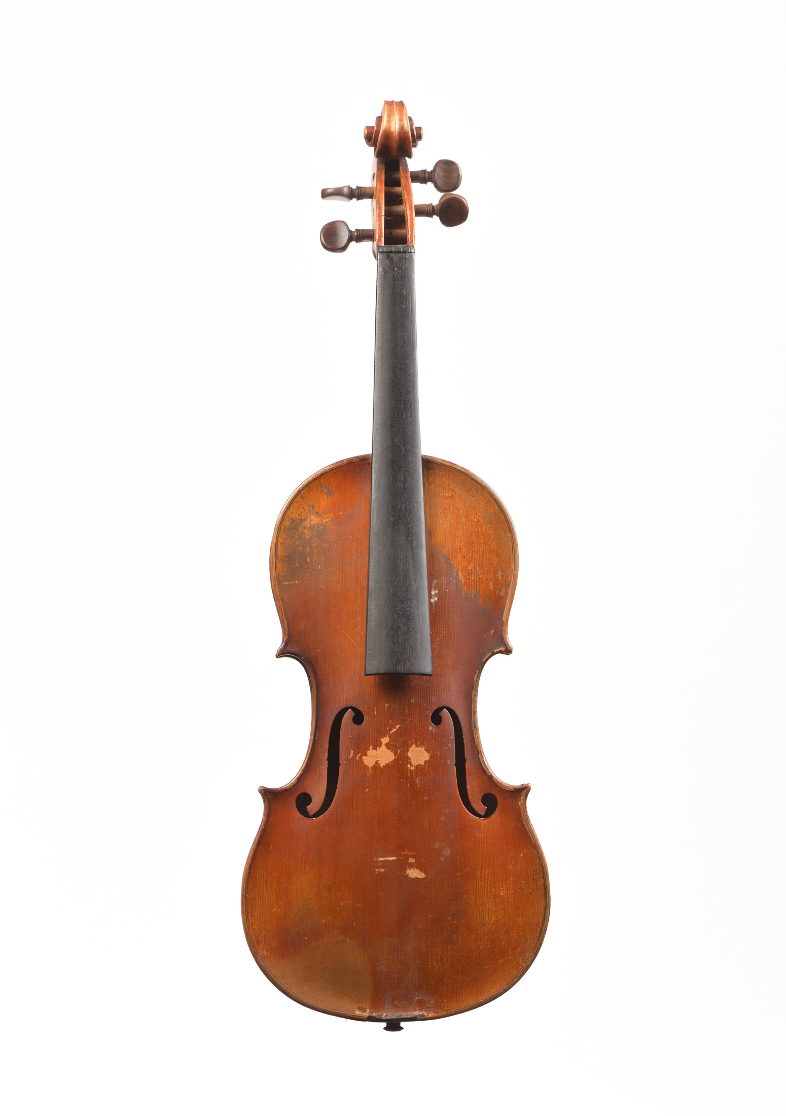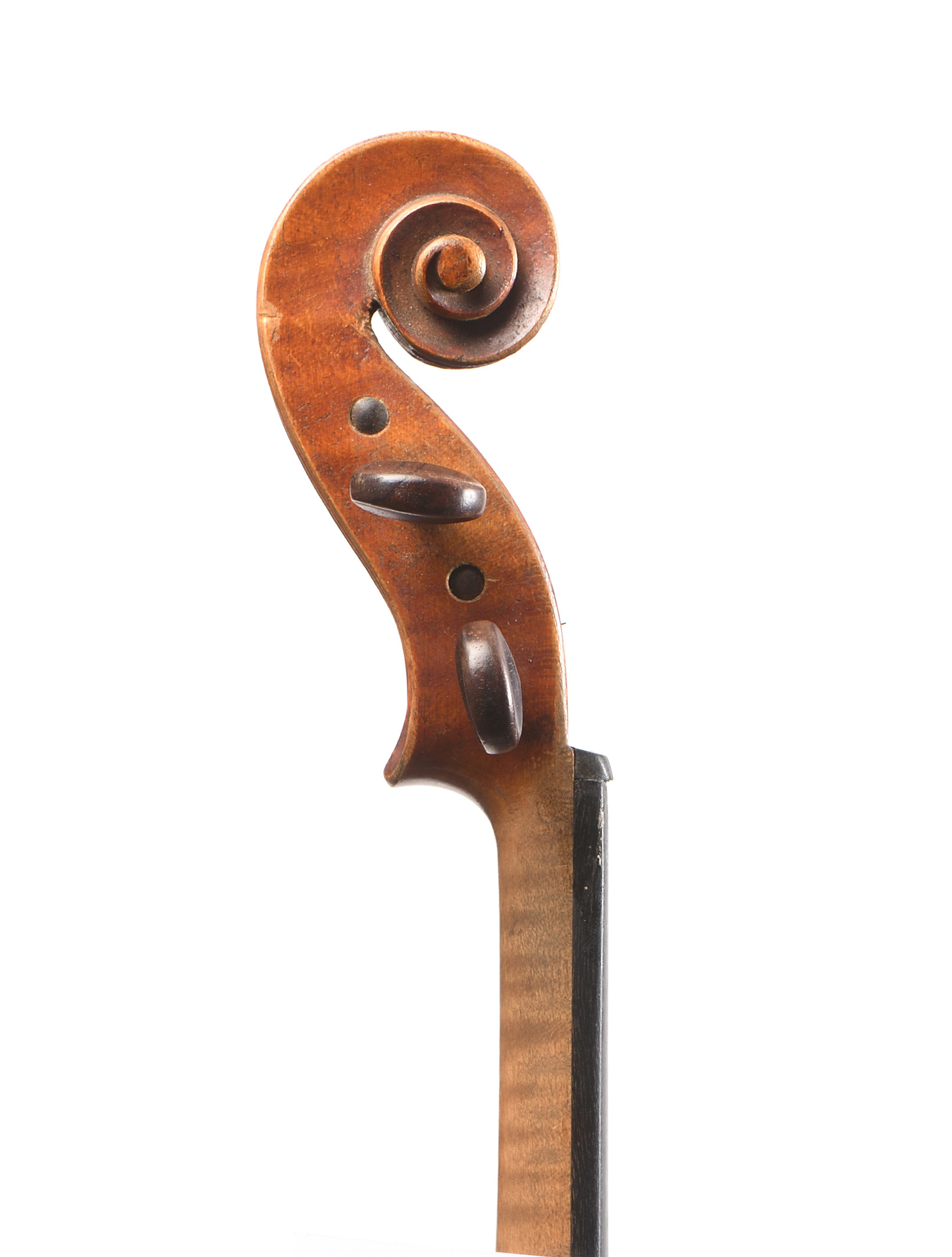 portant une étiquette "Georg Kloz... Mittenwald". Fond de deux pièces en érable ondé. Vernis brun orangé sur fond doré. 357 mm. Avec boite et archet cassé.