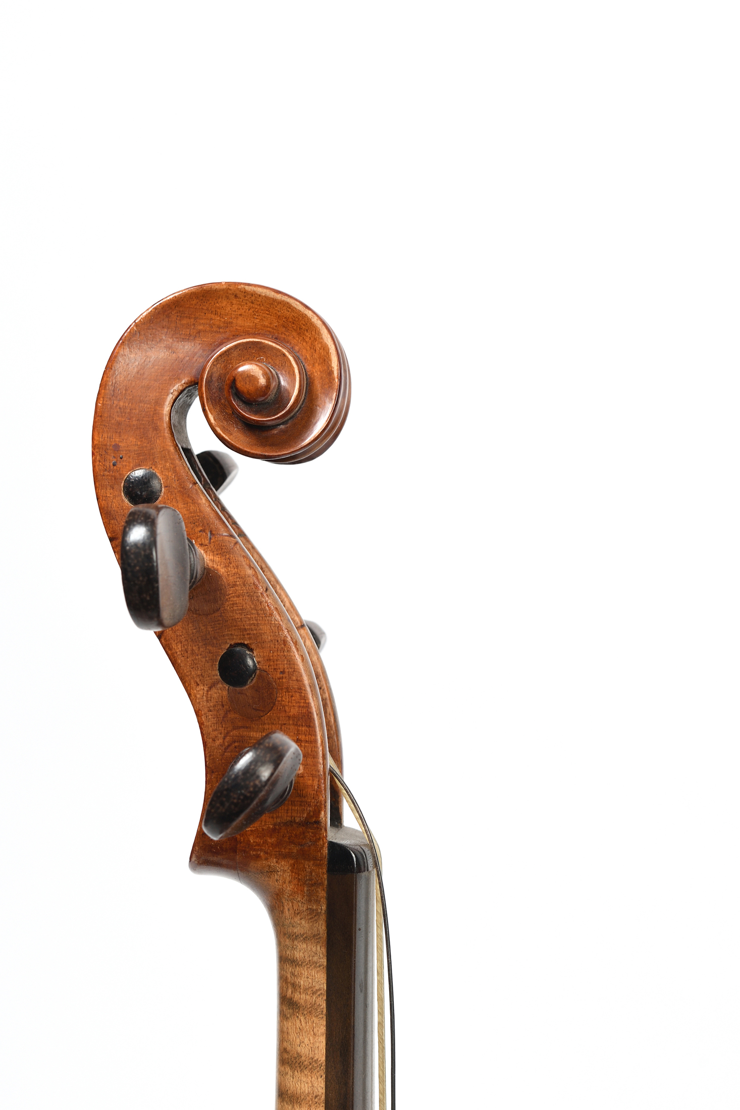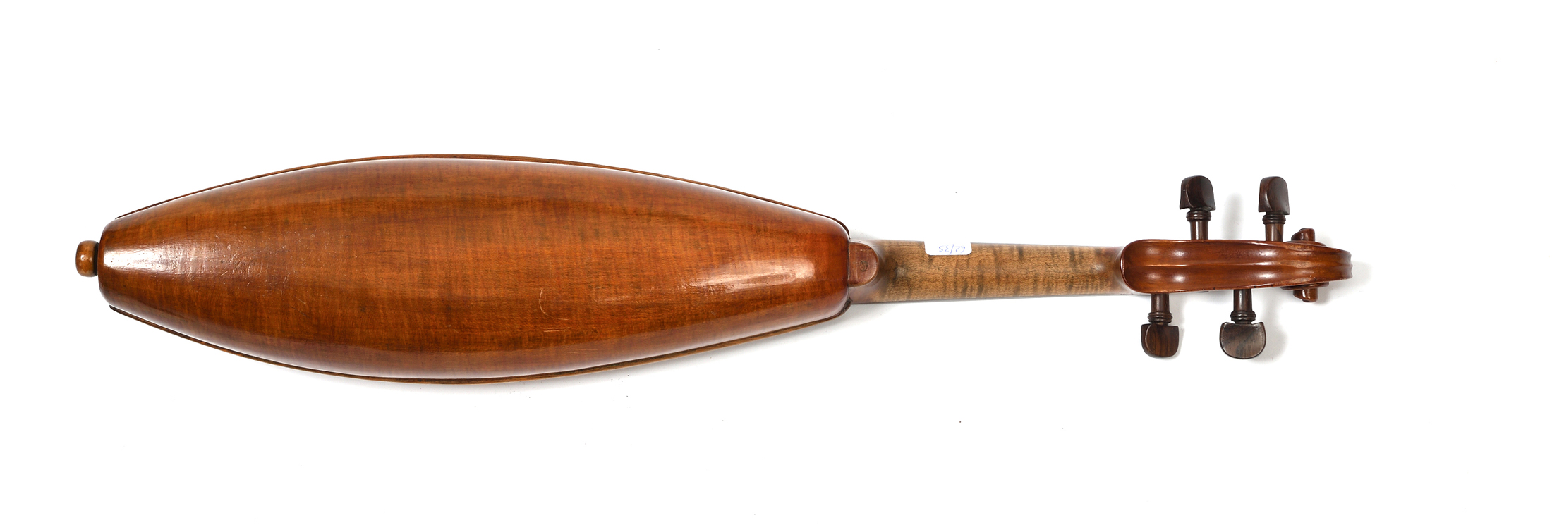 Pochette de maitre à danser d'Europe centrale. Fond et éclisses d'une seule pièce d'érable. Table en sapin. Tête de violon. Diverses marques au fer illisibles.