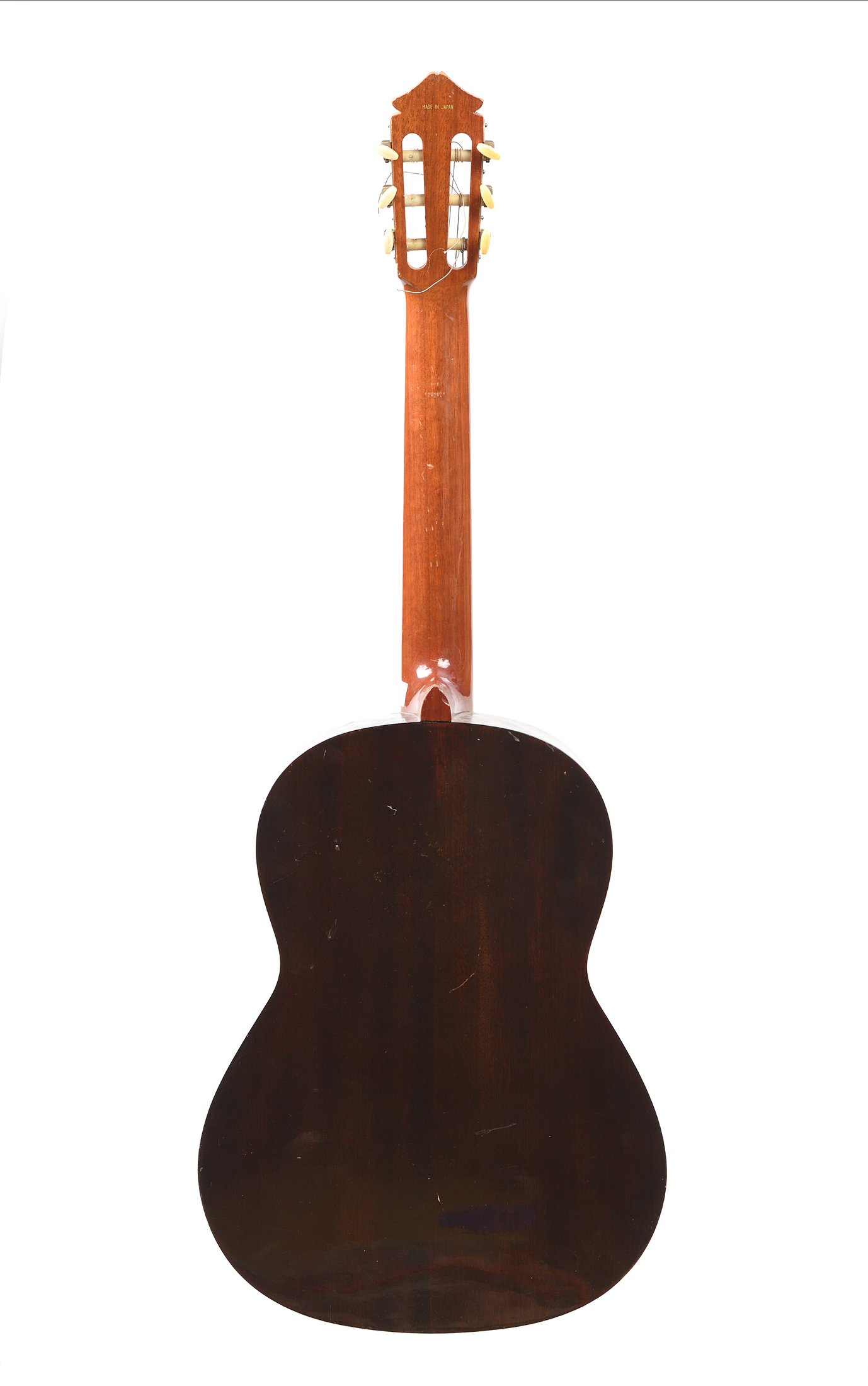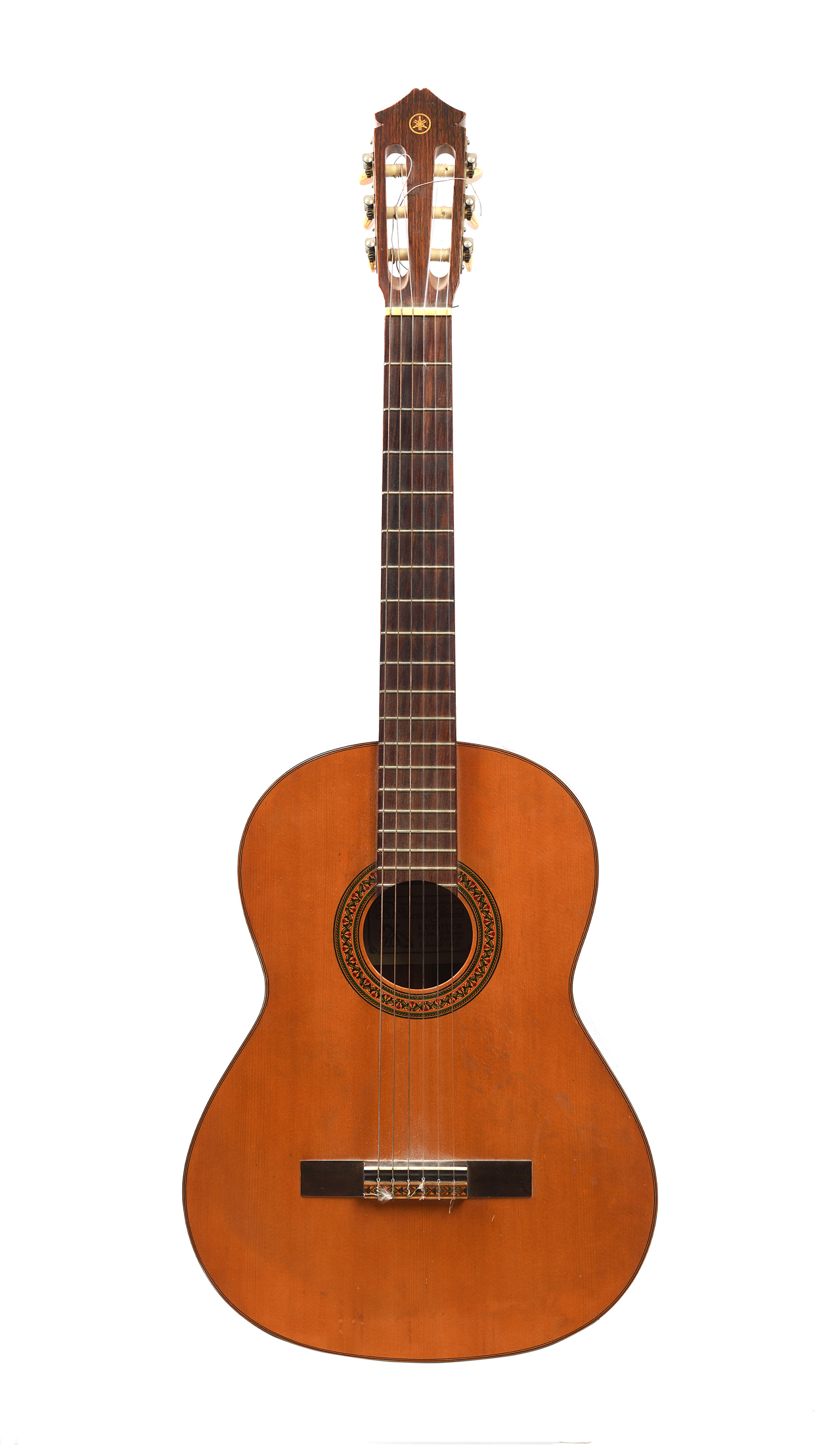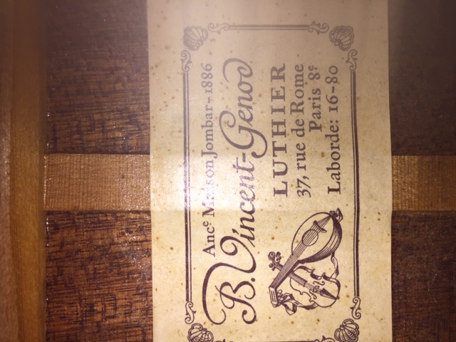portant une étiquette "B. Vincent-Genod. Luthier 37 rue de Rome. Paris 8e. Laborde: 16-80". Guitare moderne des années 80 fait chez Yamaha dont elle porte la marque sur la tête. L'ensemble est à restaurer.