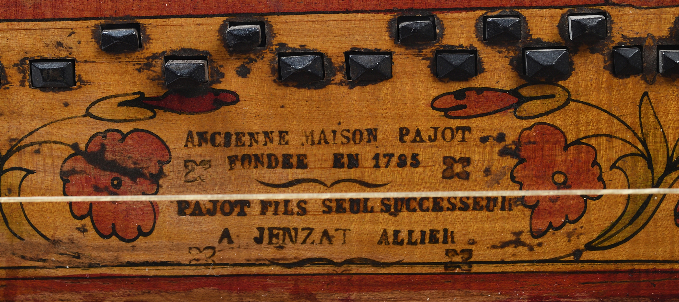 Belle Vielle à roue fait par Pajot à Jenzat dont elle porte la marque "Ancienne maison PAJOT. Fondee en 1795. Pajot Fils, seul successeur à JANZAT (ALLIER). Cassures de table. L'ensemble en bon état de restauration.