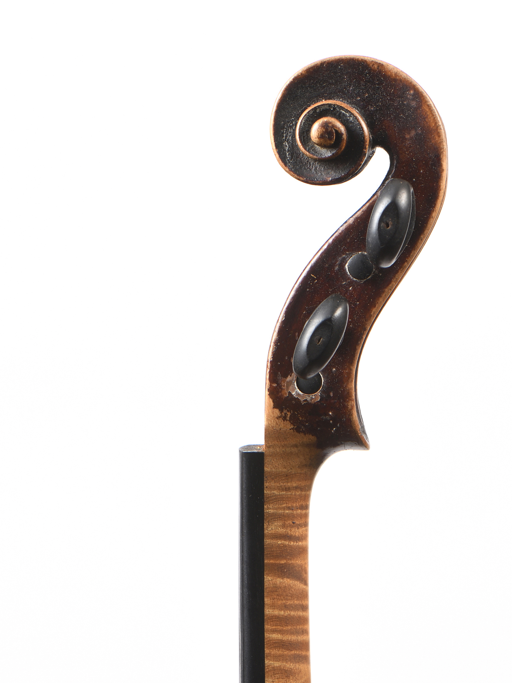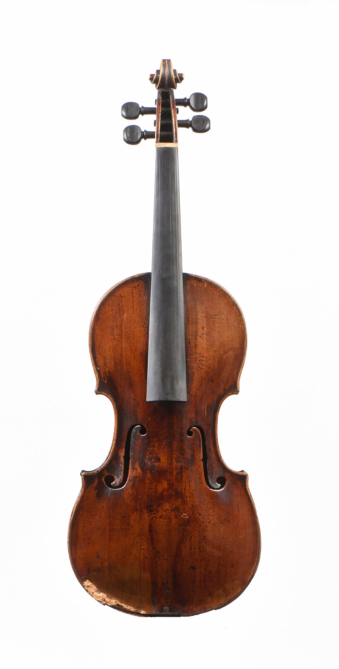 portant une étiquette William FORSTER 1774. Beau fond de deux pièces en érable aux ondes fines, régulières. Eclisses du même bois, et tête d'un bois taillé sur couche. Table en épicéa aux pores fins de deux pièces 361 mm. Vernis brun foncé sur fond doré. Diverses cassures restaurées à la table. Manques sur les bords. 359 mm. Bon état général.