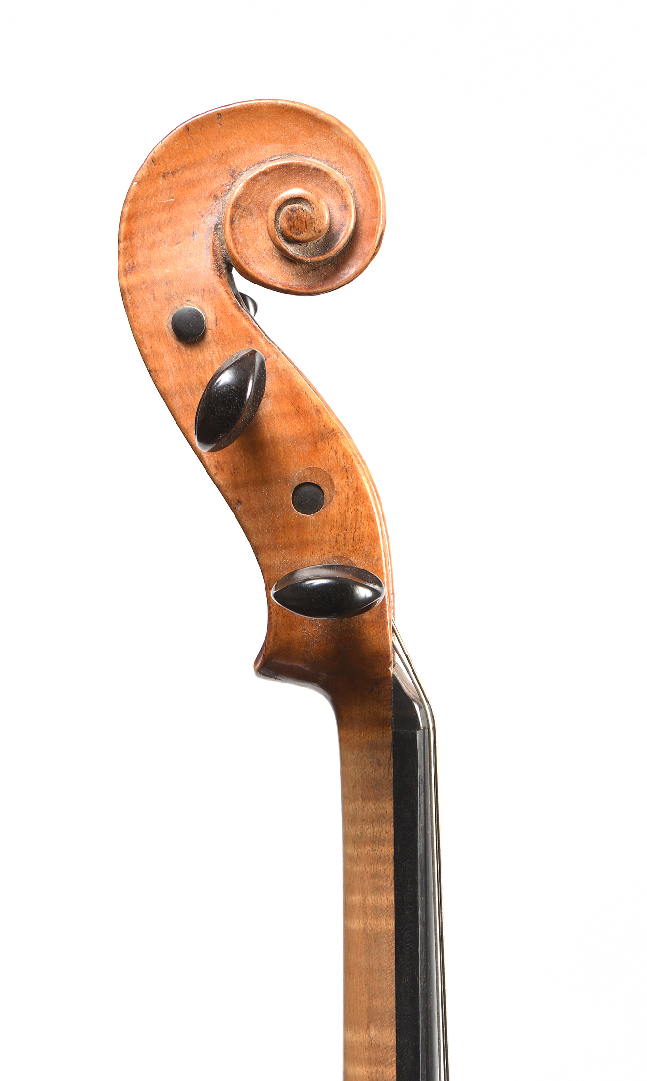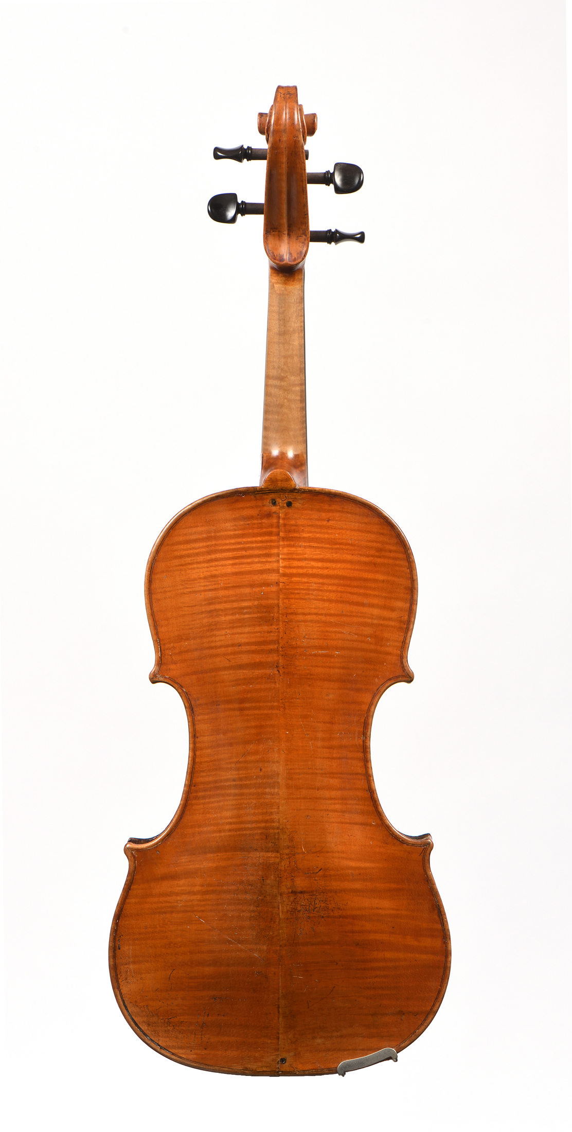 Fait au XIX dans le style de CHAROTTE. Fond de deux pièces en érable aux ondes irrégulières. Eclisses et tête du même bois. Table de deux pièces en épicéa aux pores larges irréguliers. Diverses cassures restaurées. Vernis brun sur fond doré. 398 mm.