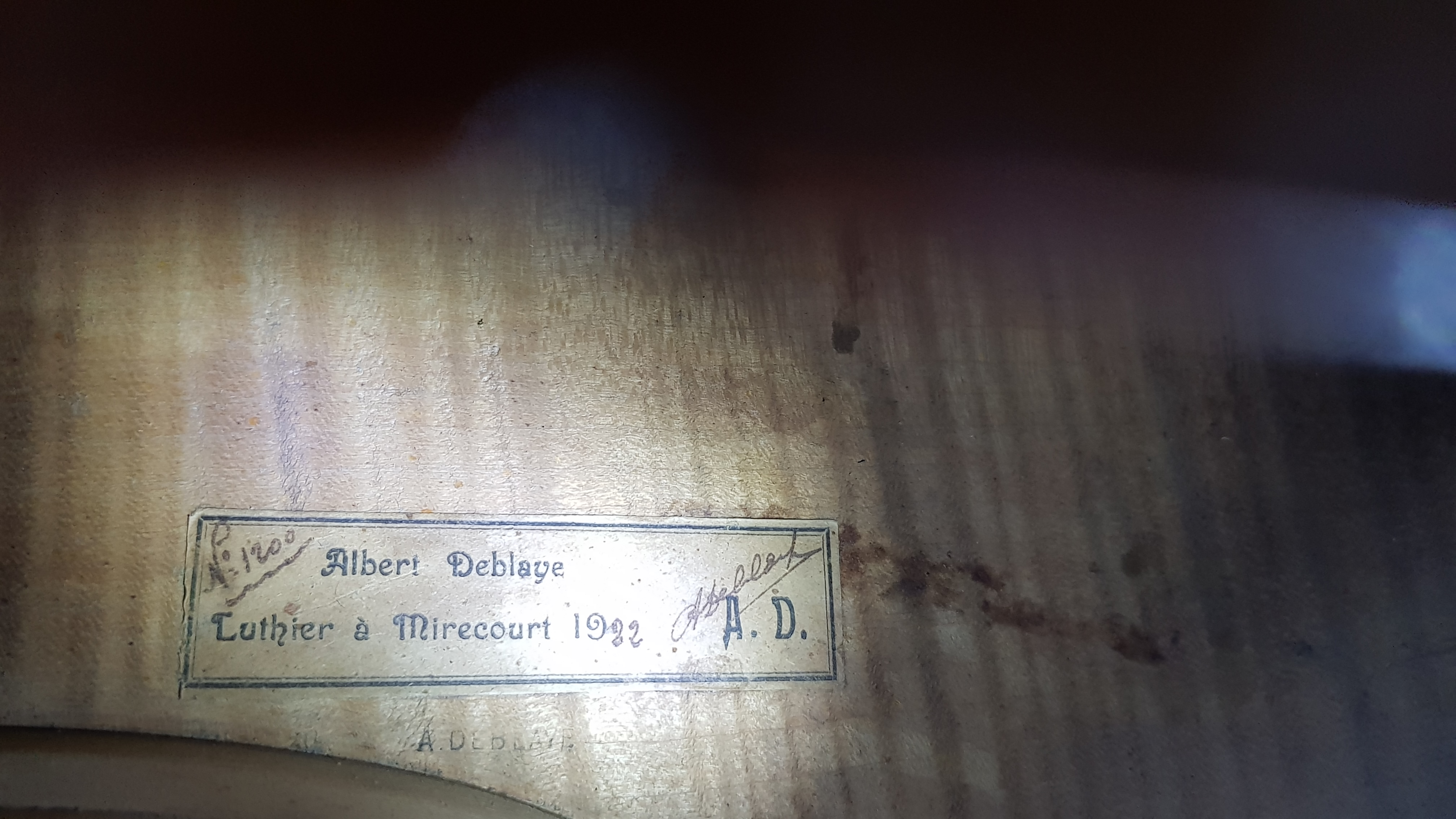 dont il porte l'étiquette "N° 1200 Albert DEBLAYE, Luthier à Mirecourt, 1922 AD", la signature manuscrite, et les marques au fer. Fond de deux pièces en érable. Eclisses et tête du même bois. Table de deux pièces en épicéa. Diverses cassures restaurées à la table, aux éclisses. Bon état de restauration.