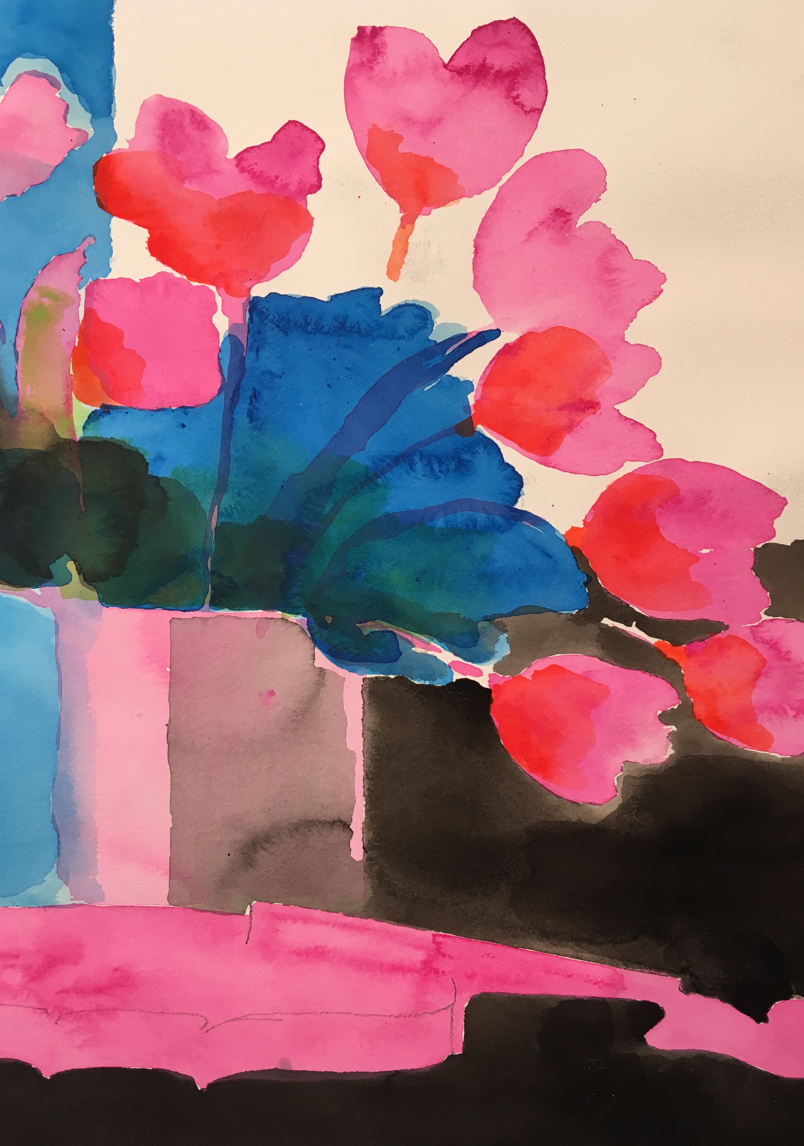 Composition au bouquet et violon rose. Aquarrelle. Signée en bas à gauche. Non encadré. 56,5 X 75 cm