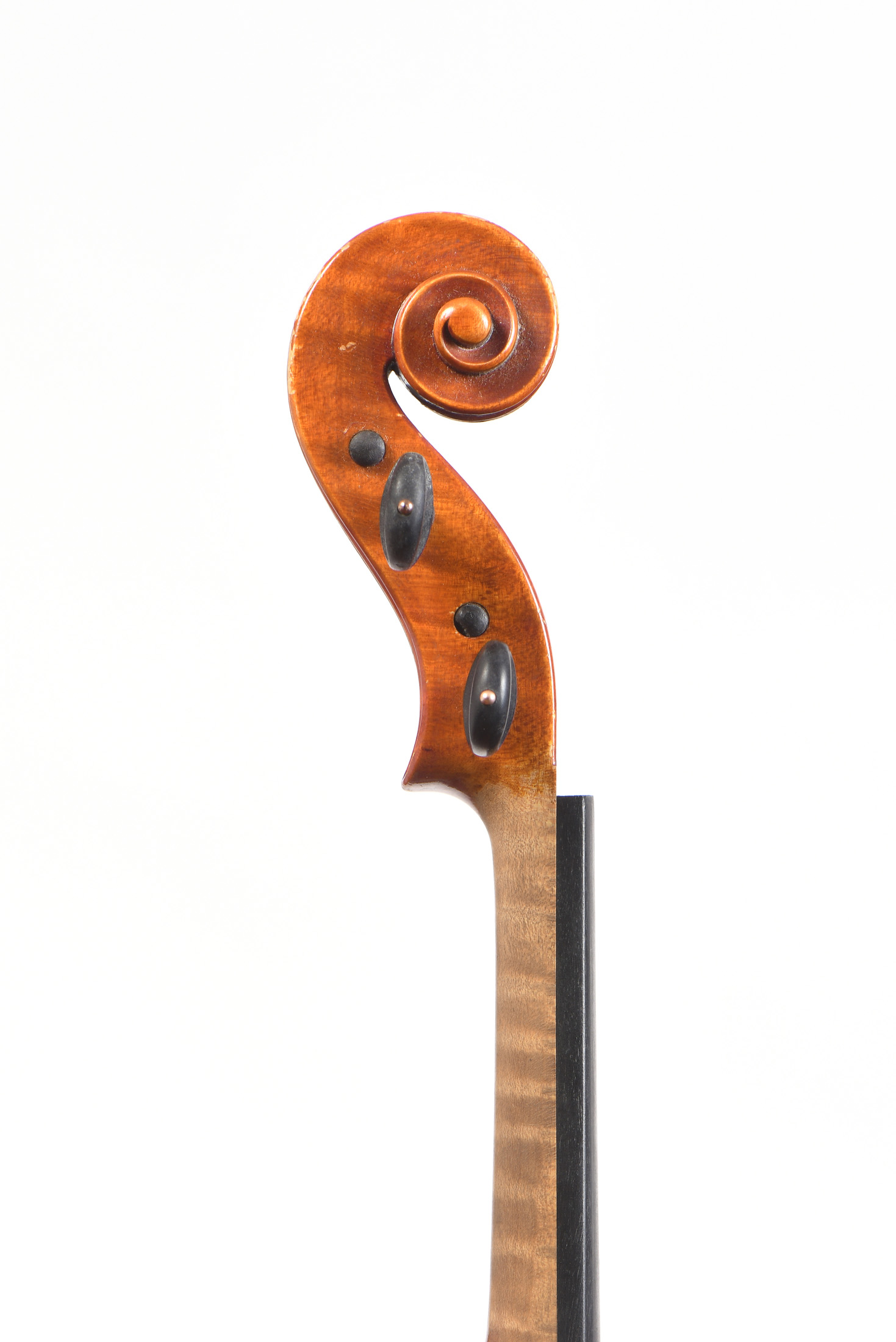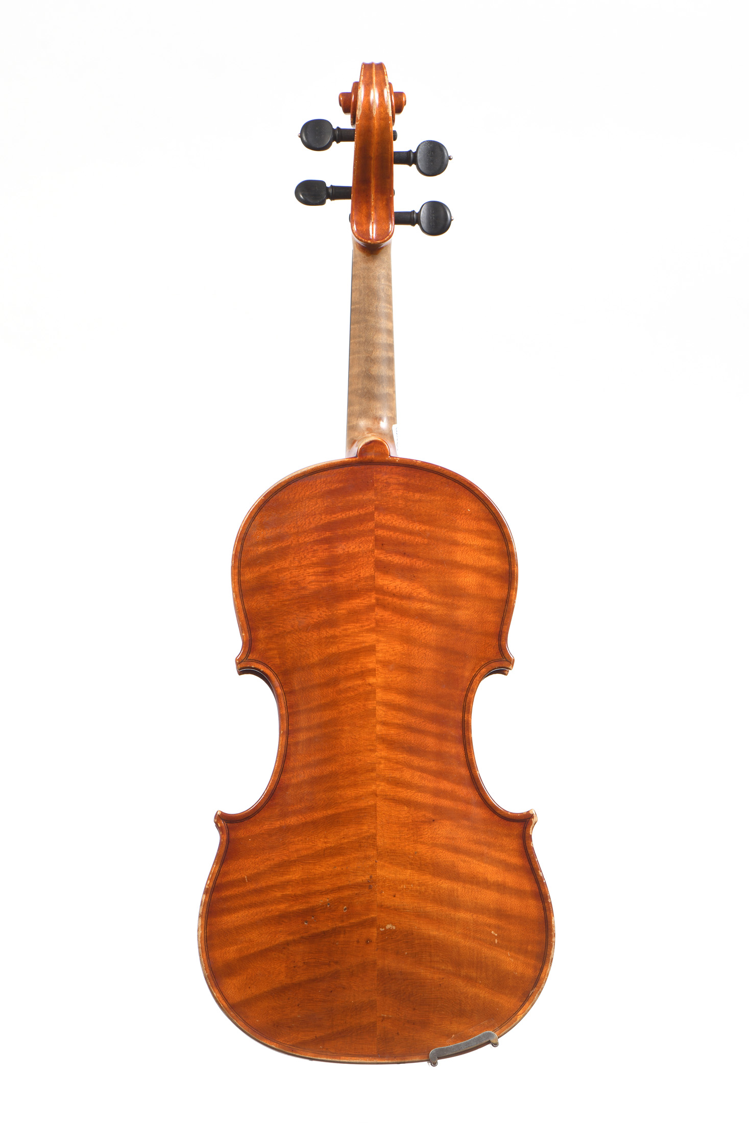 dont il porte une étiquette "ADOLF ROMER, Freiburg... N°64..." 1908. Beau Fond de deux pièces. Vernis brun orangé sur fond doré. Bon état général: Usures. 357 mm. Avec boite et Archet.