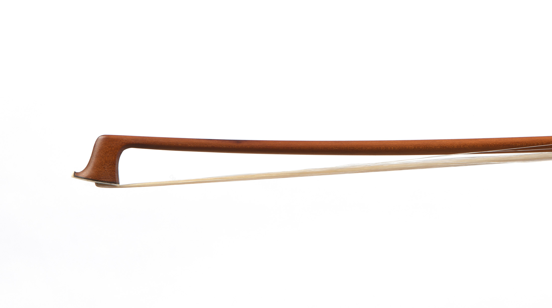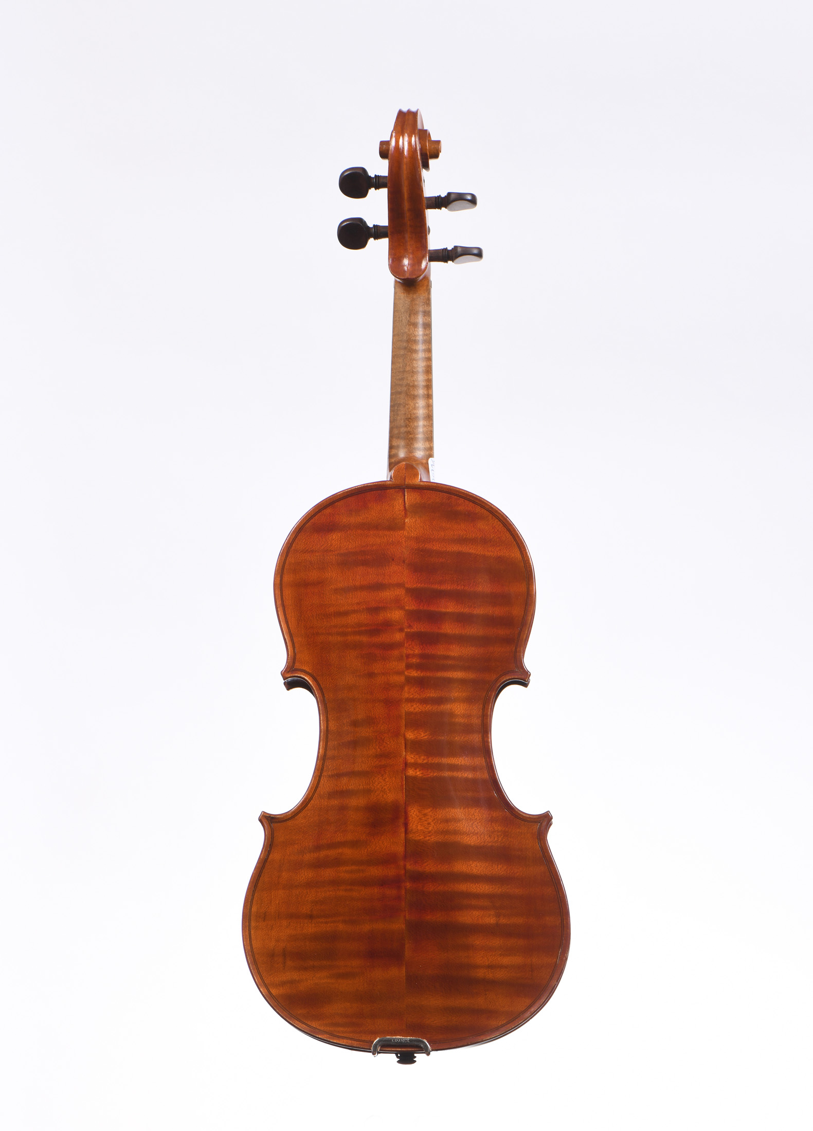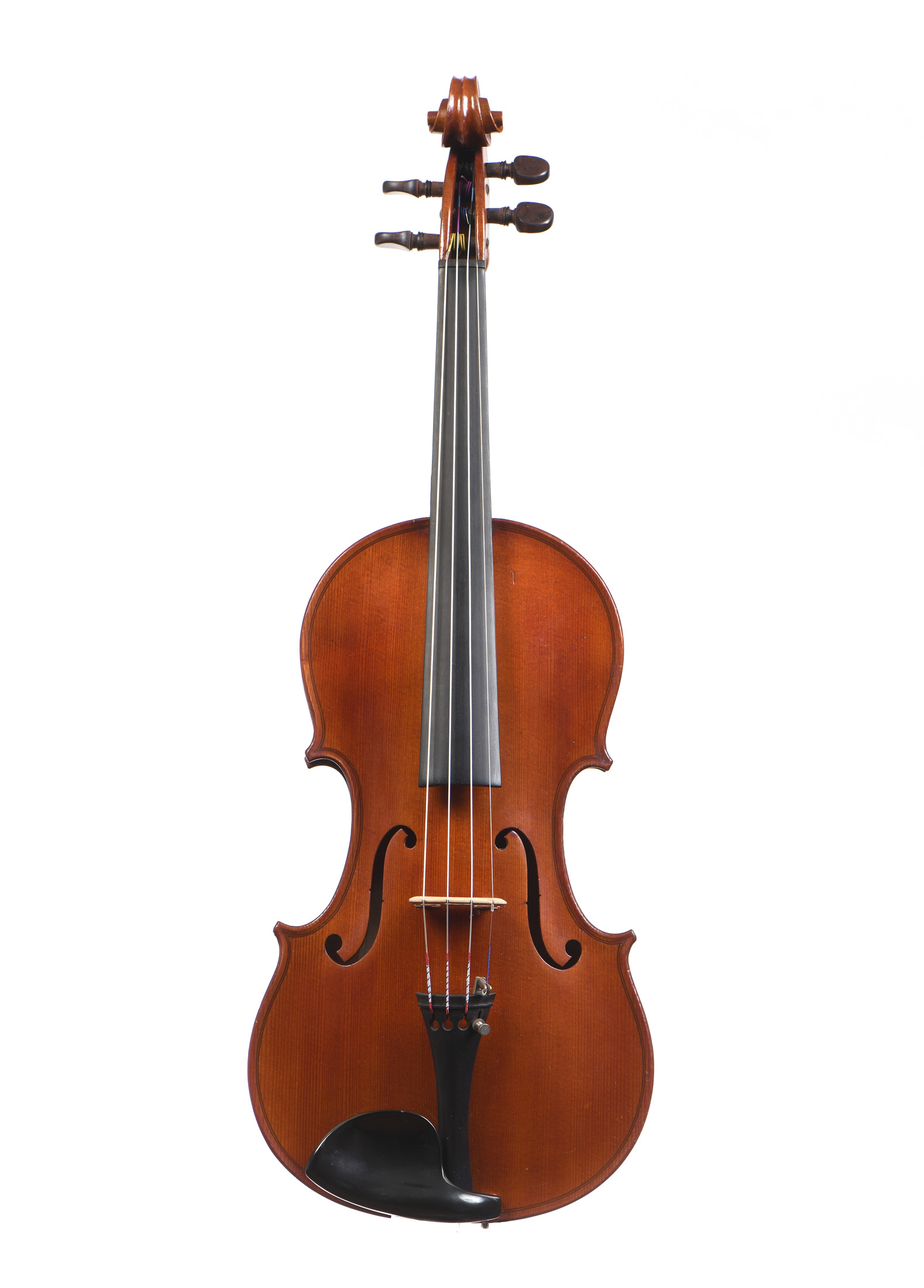 fait à Mirecourt, vers 1920. Portant une étiquette Nicolas BERTHOLINI. Vernis brun orangé sur fond doré. Fond de deux pièces. Bon état général. Joint du fond restauré. Avec boite et un bel archet Mirecourt, probablement Morizot. 356 mm.