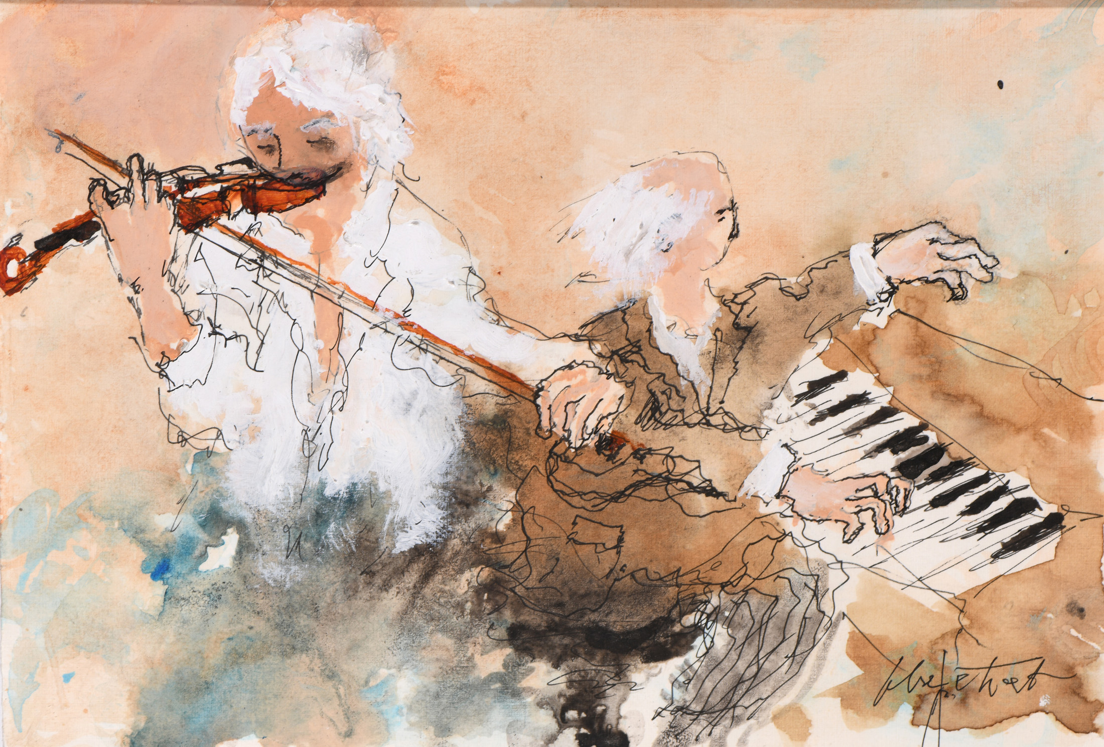 Le duo: Violon et piano. Aquarelle et gouache, trait de plume, sur papier.