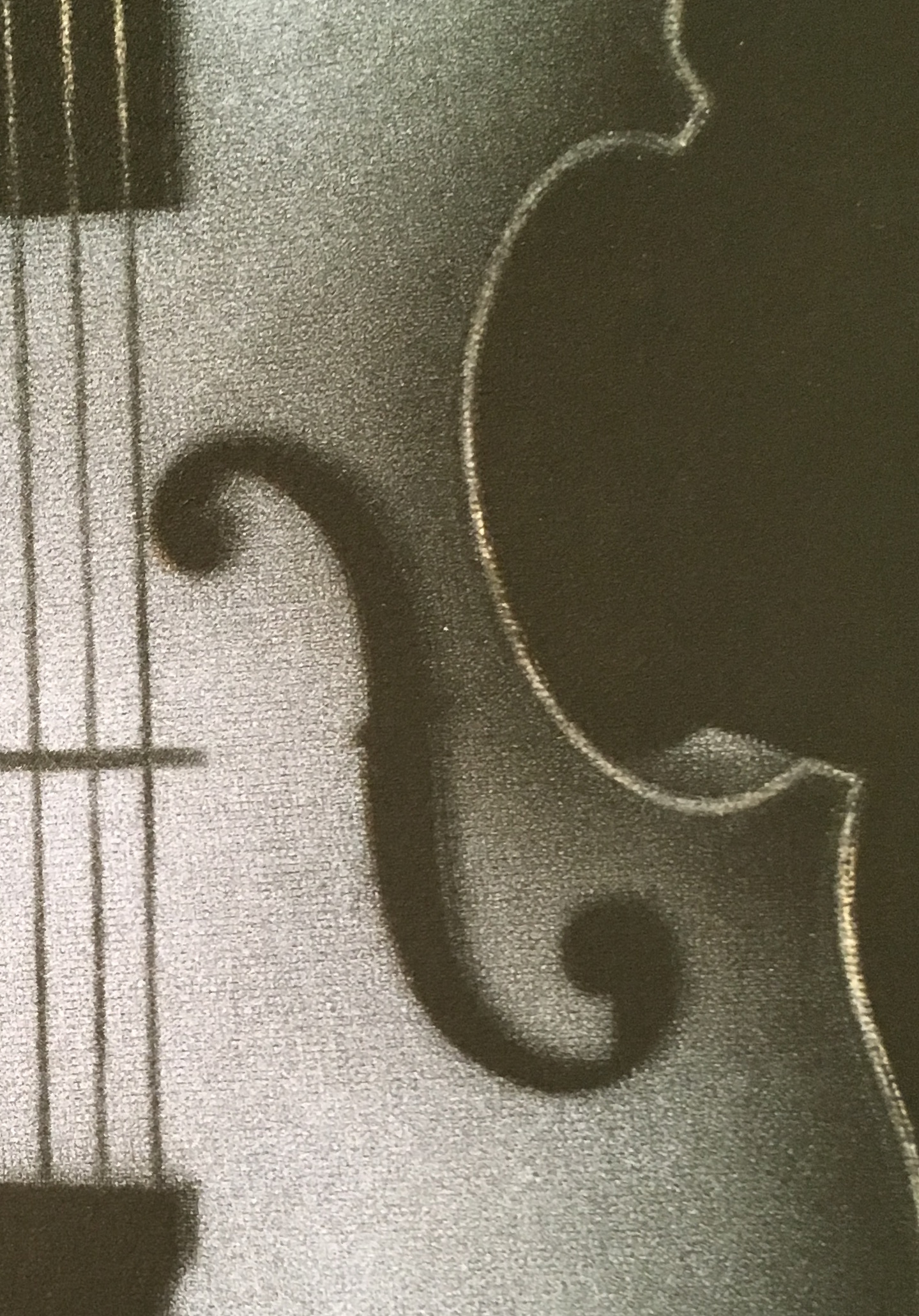 Violon, fraise au dessus d'une coupe. Gravure à la manière noire.