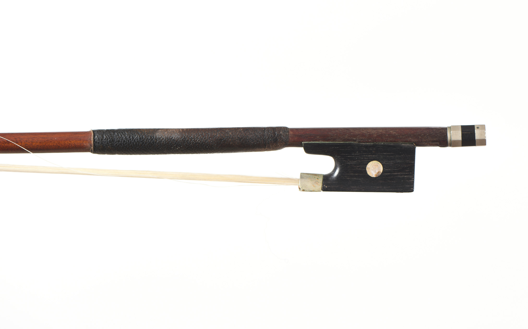 Intéressant archet probablement Anglais. Fin XIXe. Baguette en beau bois de pernambouc. Hausse ébène montée maillechort, Grain. 726 mm. 56 g avec garniture cuire.
