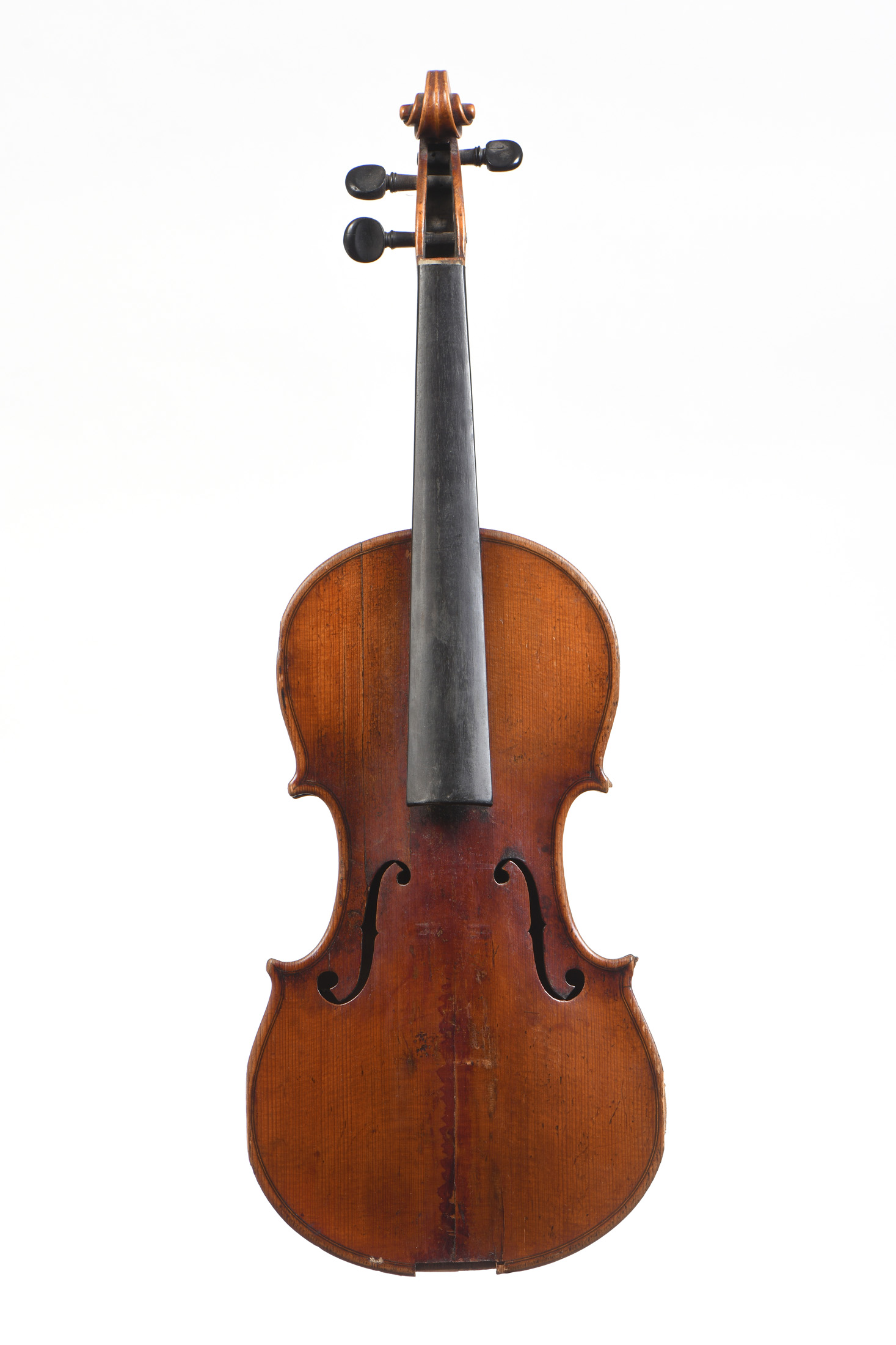 portant une étiquette Nicolaus Amati. Fond de deux pièces. Vernis brun rouge sur fond doré. Diverses cassures de table. Détablé. A restaurer. 360 mm.