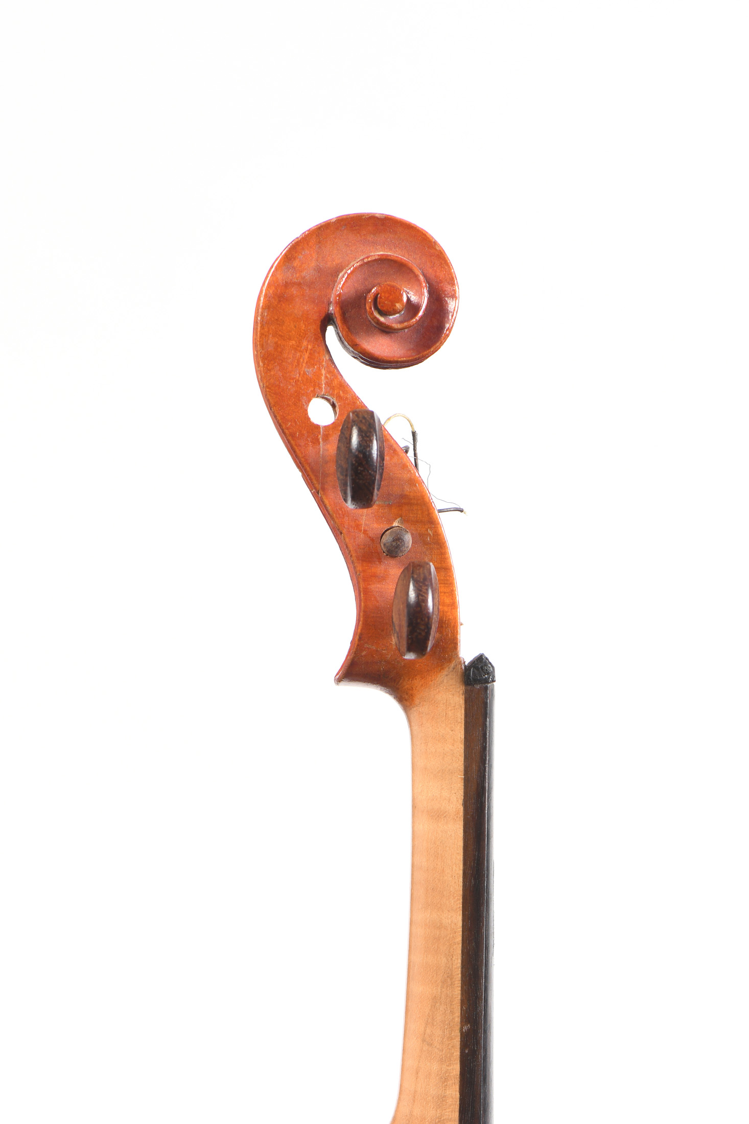 fait à Mirecourt au début du XXe. Portant une étiquette modèle d'après Stradivarius. Vernis brun orangé sur fond doré. Fond de deux pièces. L'ensemble à restaurer: Cassure au fond. Tête réparée. 2 cassures ouvertes à la table.