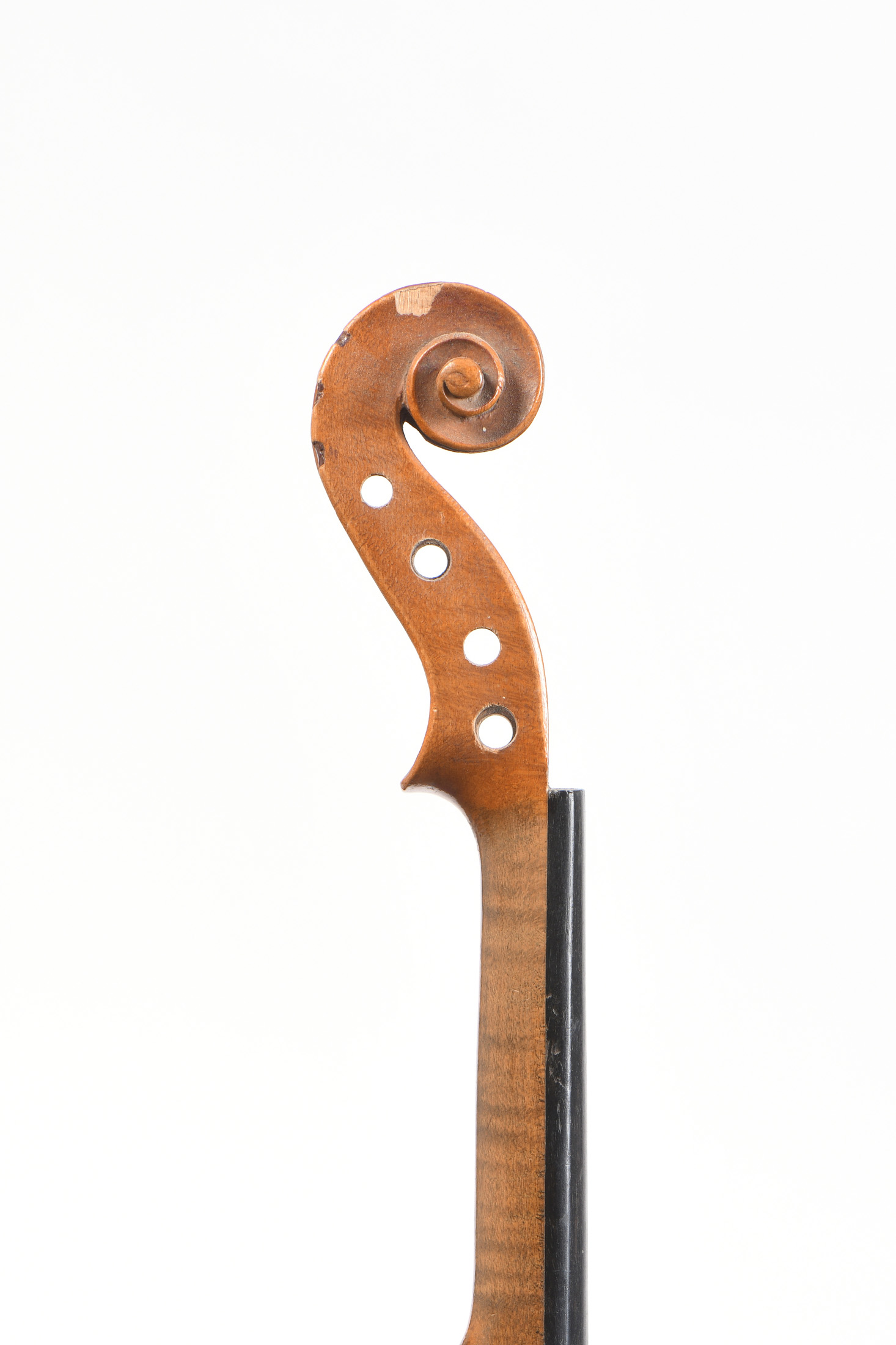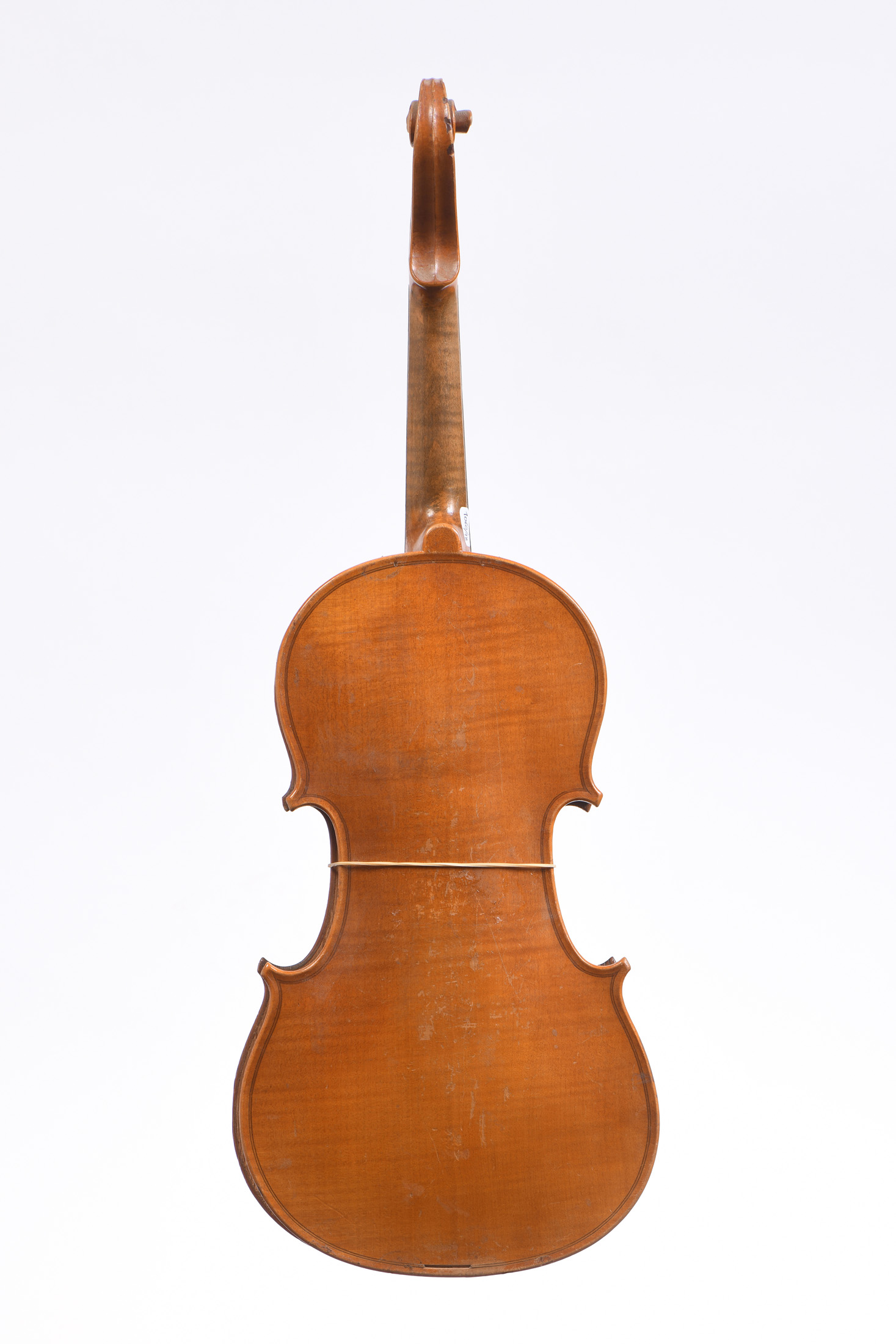 Fait à Mirecourt. Violon d'étude sans étiquette. Fond d'une pièce. Vernis brun doré. En l'état: Détablée, cassures: Cassures à la table restaurée. Cassure à la tête.