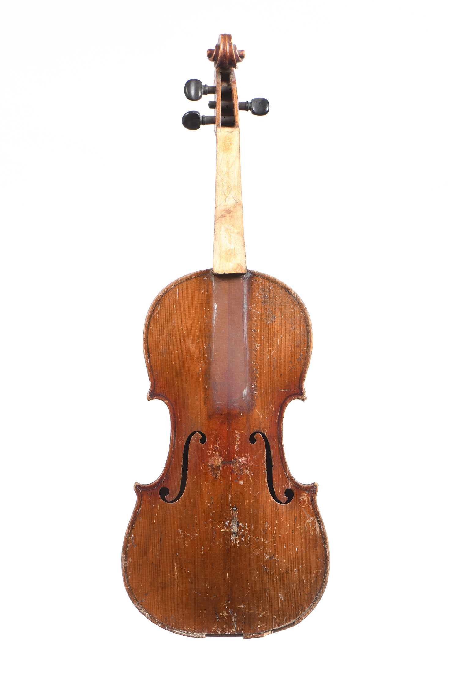 Fait anonymement, sans étiquette. Vernis orangé. Fond de deux pièces. Usures, manques, cassures: L'ensemble à restaurer. Restauration à la tête, Manques... 362 mm.