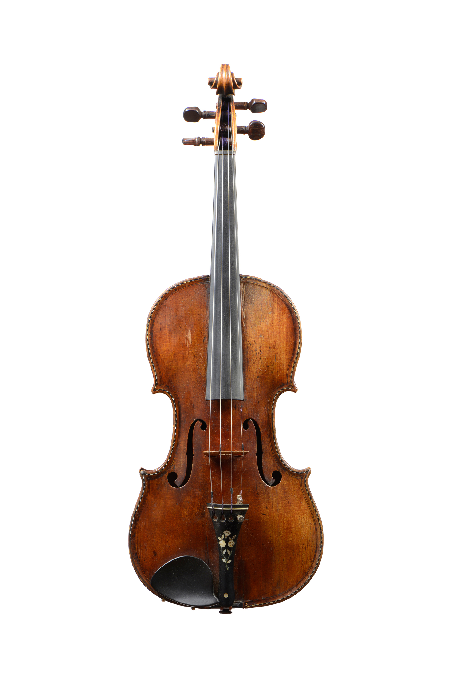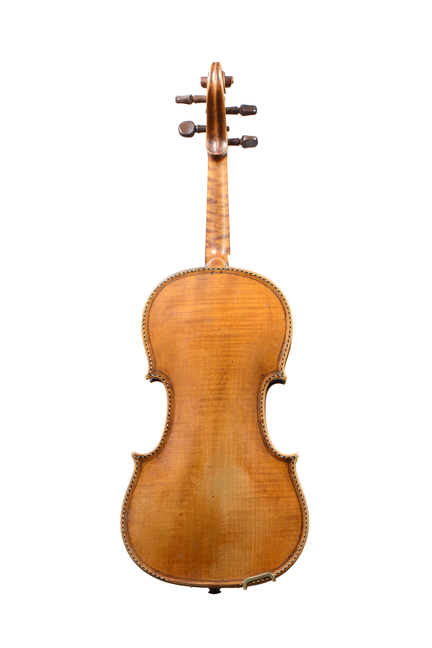 portant une étiquette Guarnerius. Fond d'une pièce pièce. Vernis brun sur fond doré. Double filet incrusté de morceaux de nacre, et ébène. Cassures de table dont une à l'âme restaurée. 361 mm. Avec boite et archet.