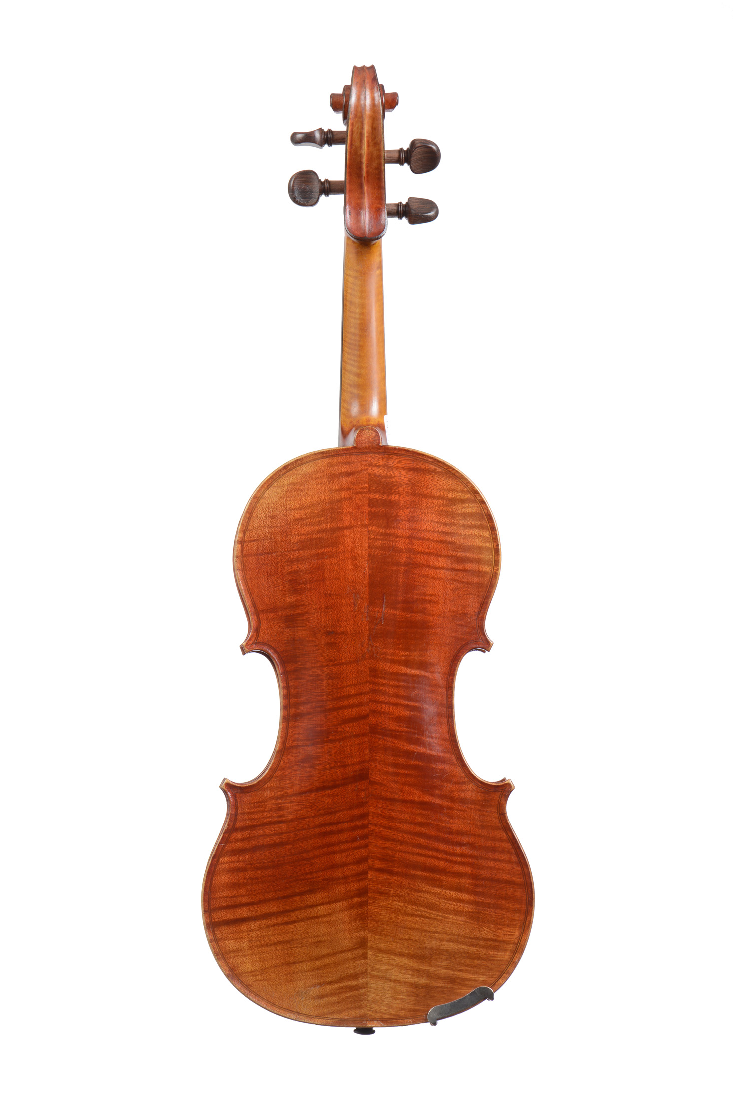 portant une étiquette Stradivarius 1721. Fait à Mirecourt au début du XXe. Fond de deux pièces en érable. Eclisses et tête du même bois. Vernis brun rouge sur fond doré. 356 mm.