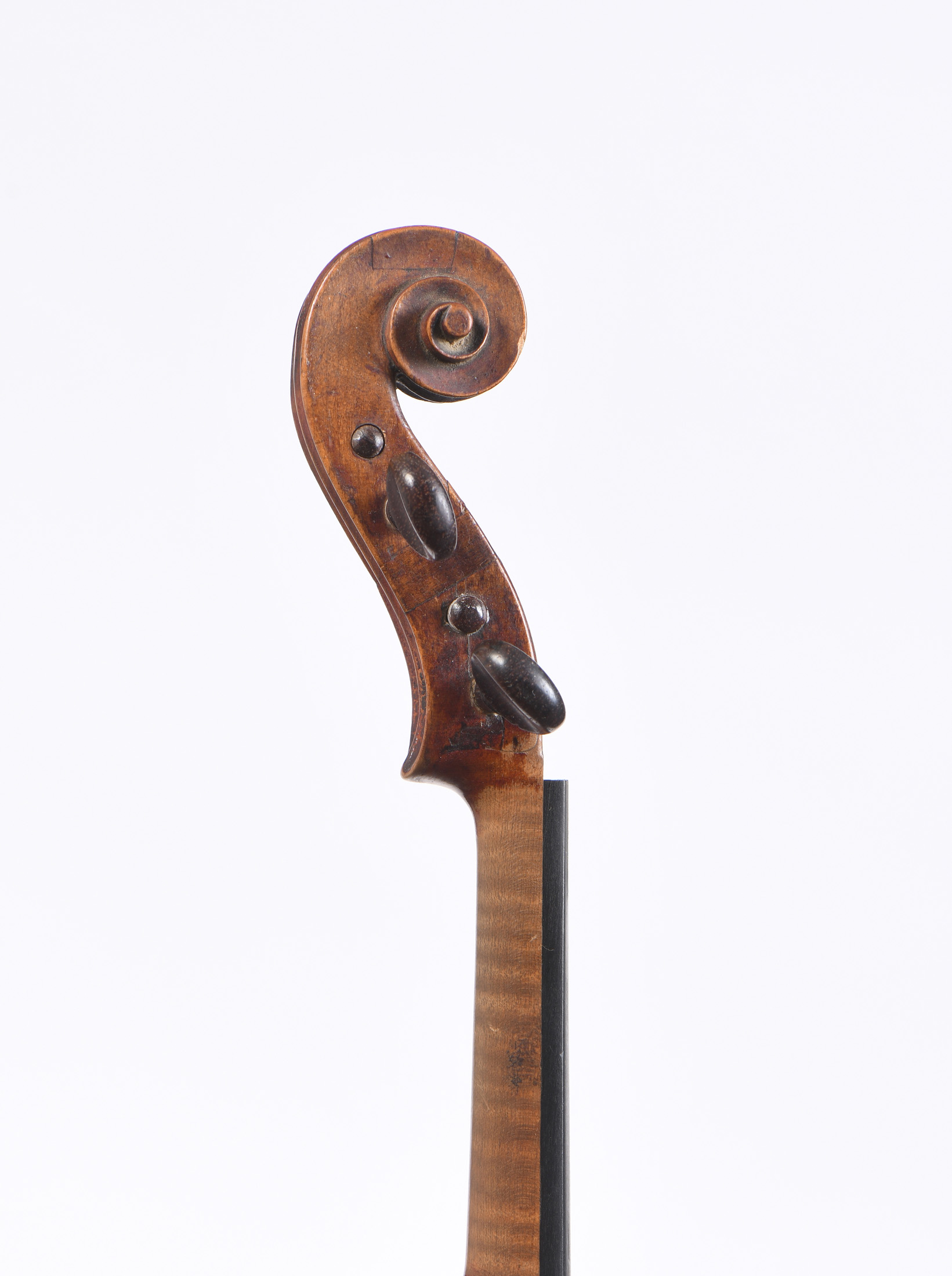 fait par François PILLEMENT, dont il porte la marque au fer "F.PILLEMENT". Fond de deux pièces. Vernis brun doré. 360 mm. Talon du manche restauré. Une cassure au fond. Diverses cassures et usures à la table. Restaurations à la tête.