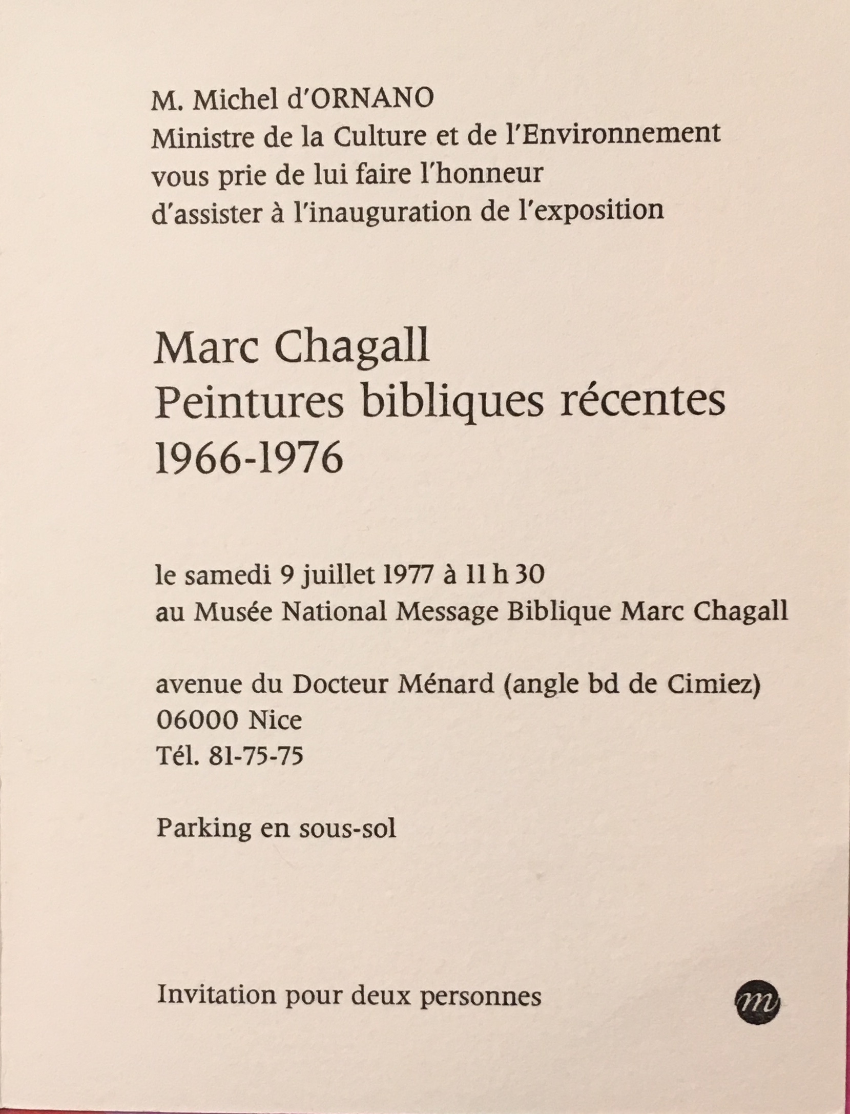 Carte de voeux lithographique. Reproduite au catalogue raisonné. Dépliant, Invitation de Michel d'Ornano, Ministre de la Culture.