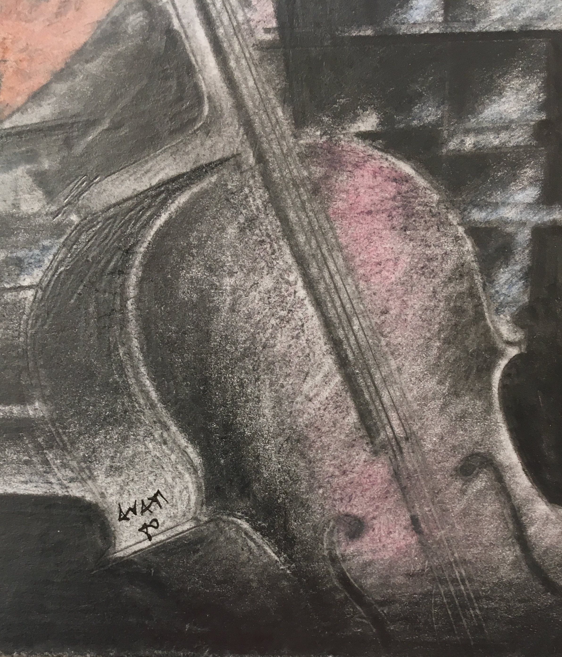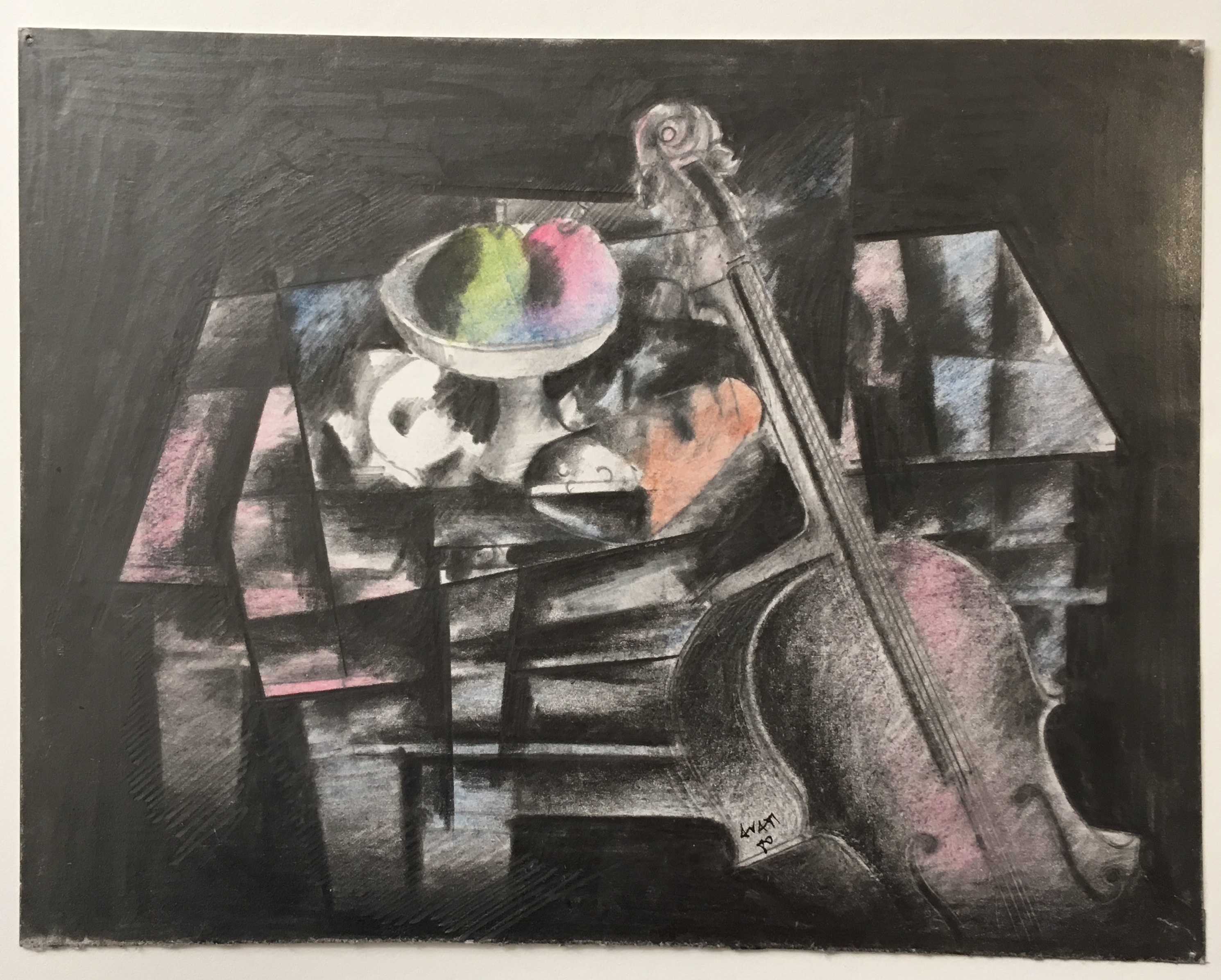 Pastel et crayon. Nature morte au violoncelle et coupe de fruits. Signé dans la composition.