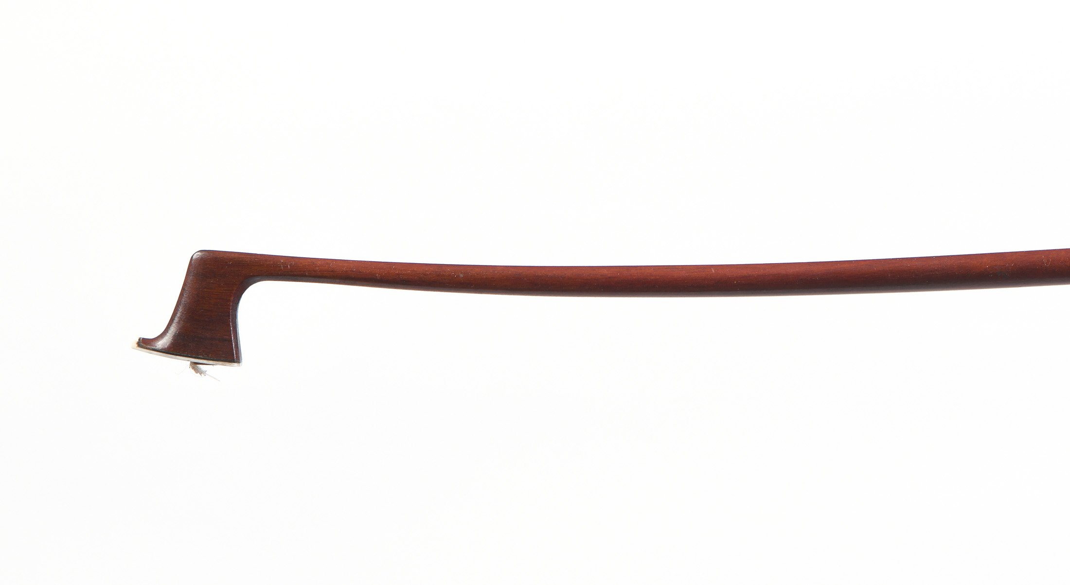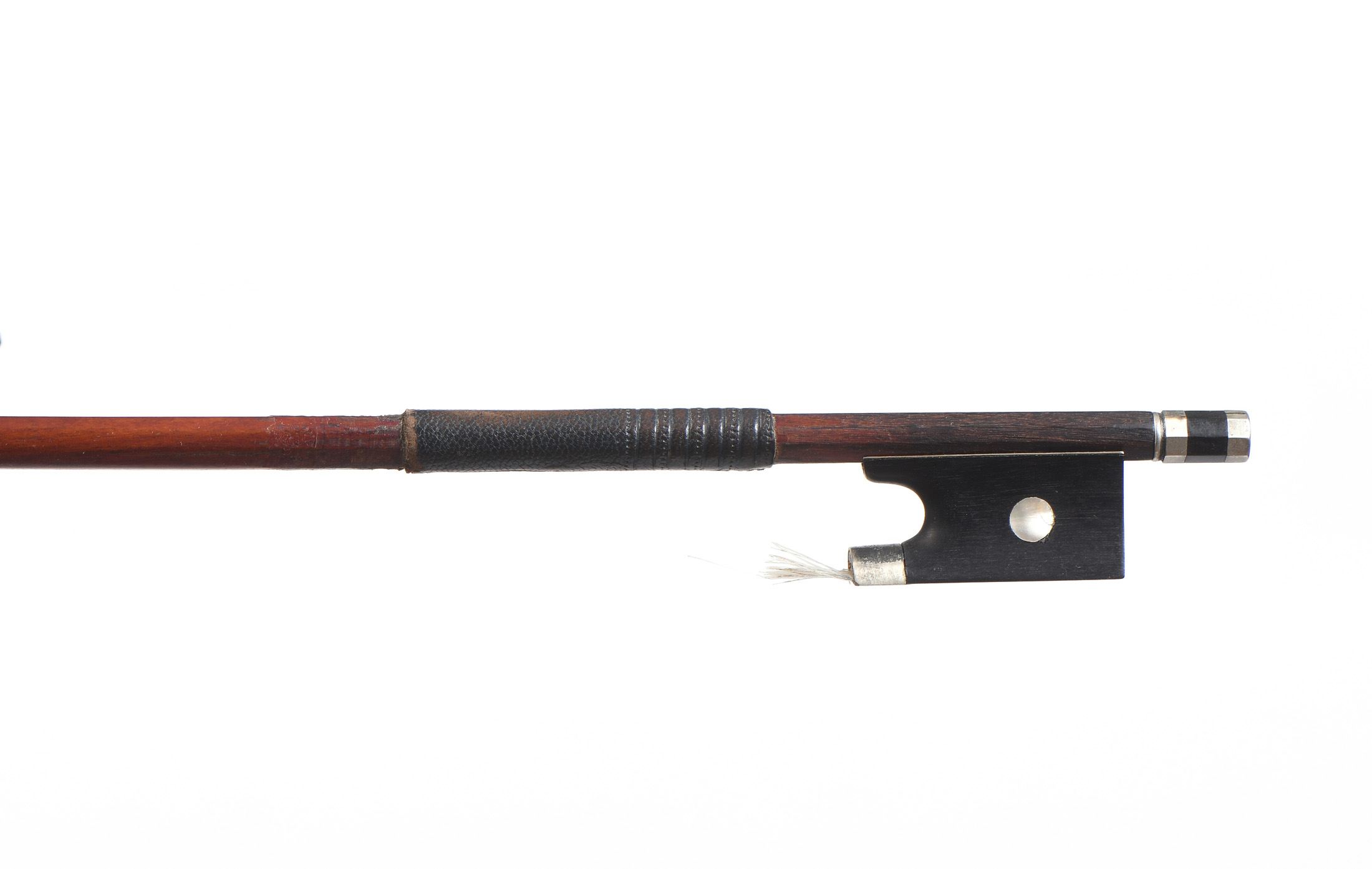 Anonyme, probablement Allemand. Baguette ronde en pernambouc. Hausse ébène d'un autre auteur. Monture maillechort. 726 mm. 51 g sans mèche, garniture cuire.