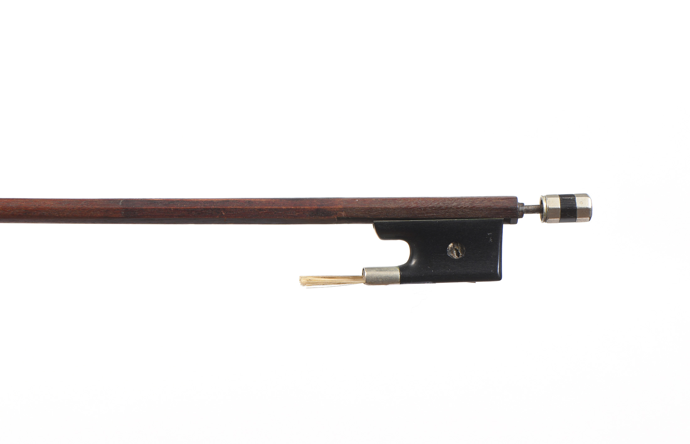 fait sur un modèle Vuillaume. XIXe siècle. Baguette ronde en bois de pernambouc. Hausse ébène, montée maillechort. Petit fel à la tête. 728 mm. 49 g sans mèche, ni garniture.