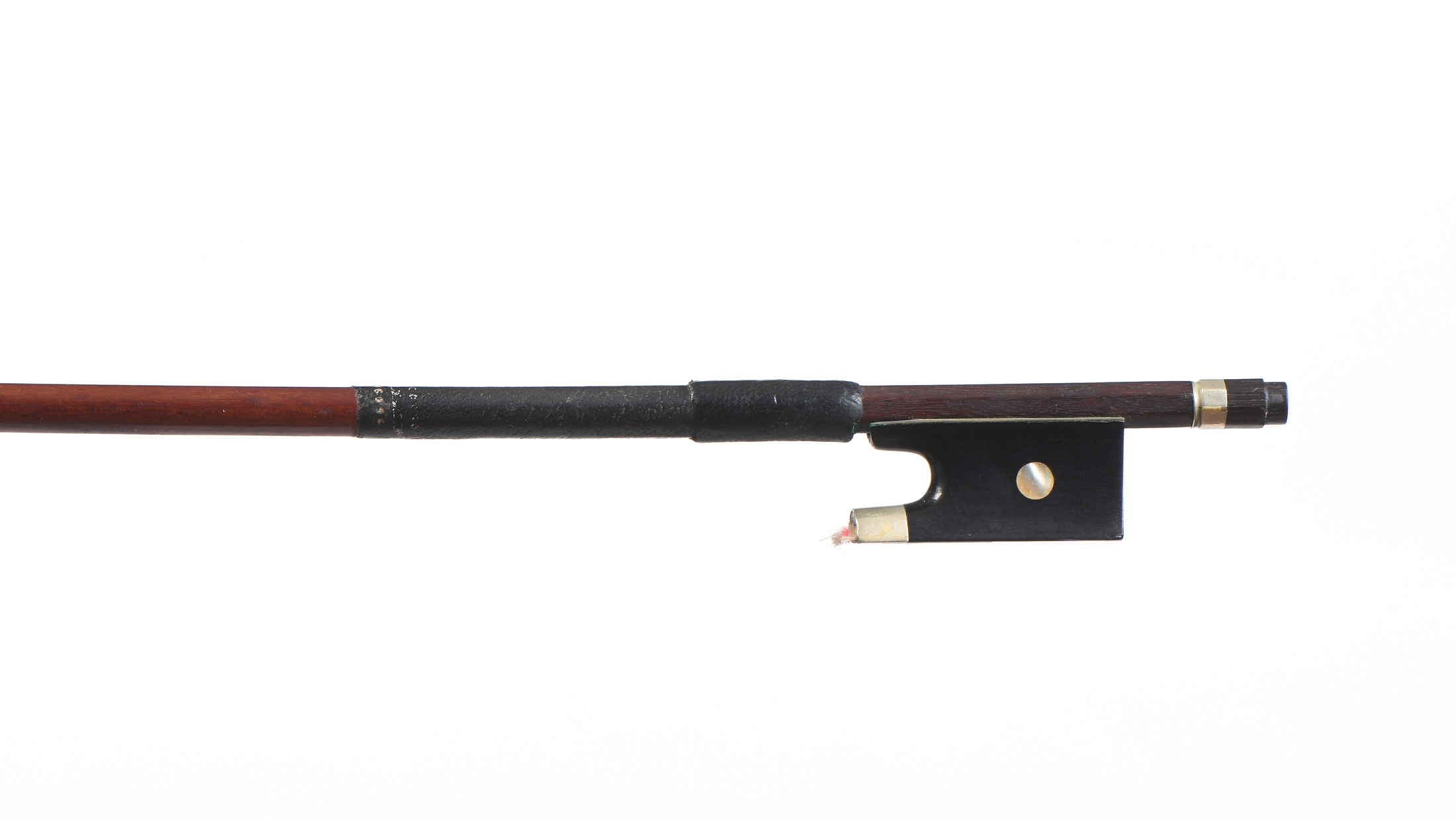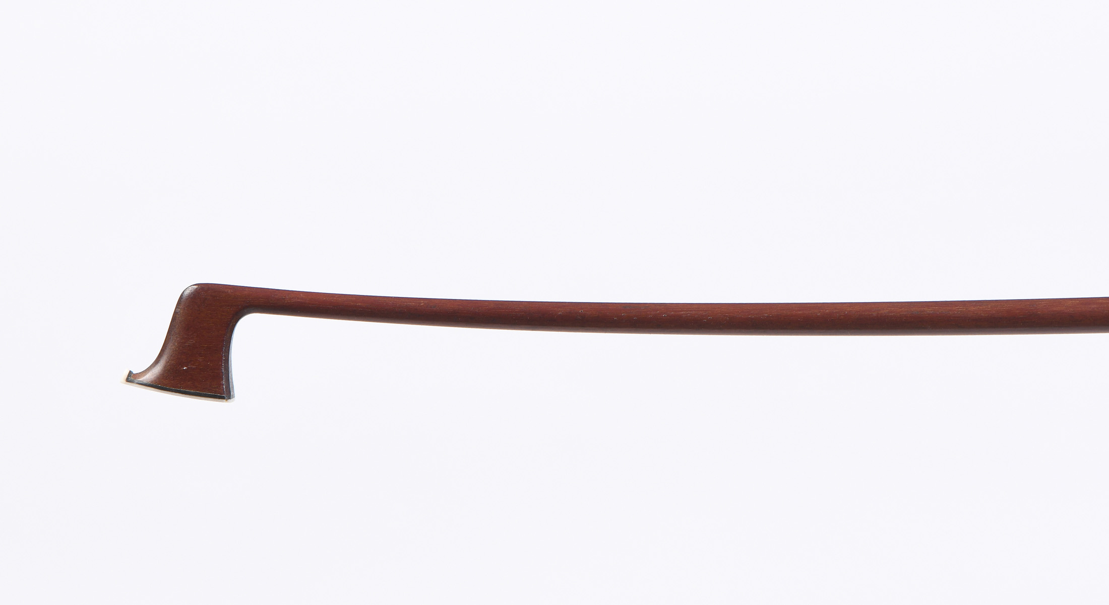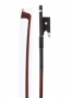Belle baguette en bois de Pernambouc. Baguette ronde. Hausse ébène montée maillechort. Bouton maillechort et bois. Manque virole. L'ensemble à restaurer. 725 mm.