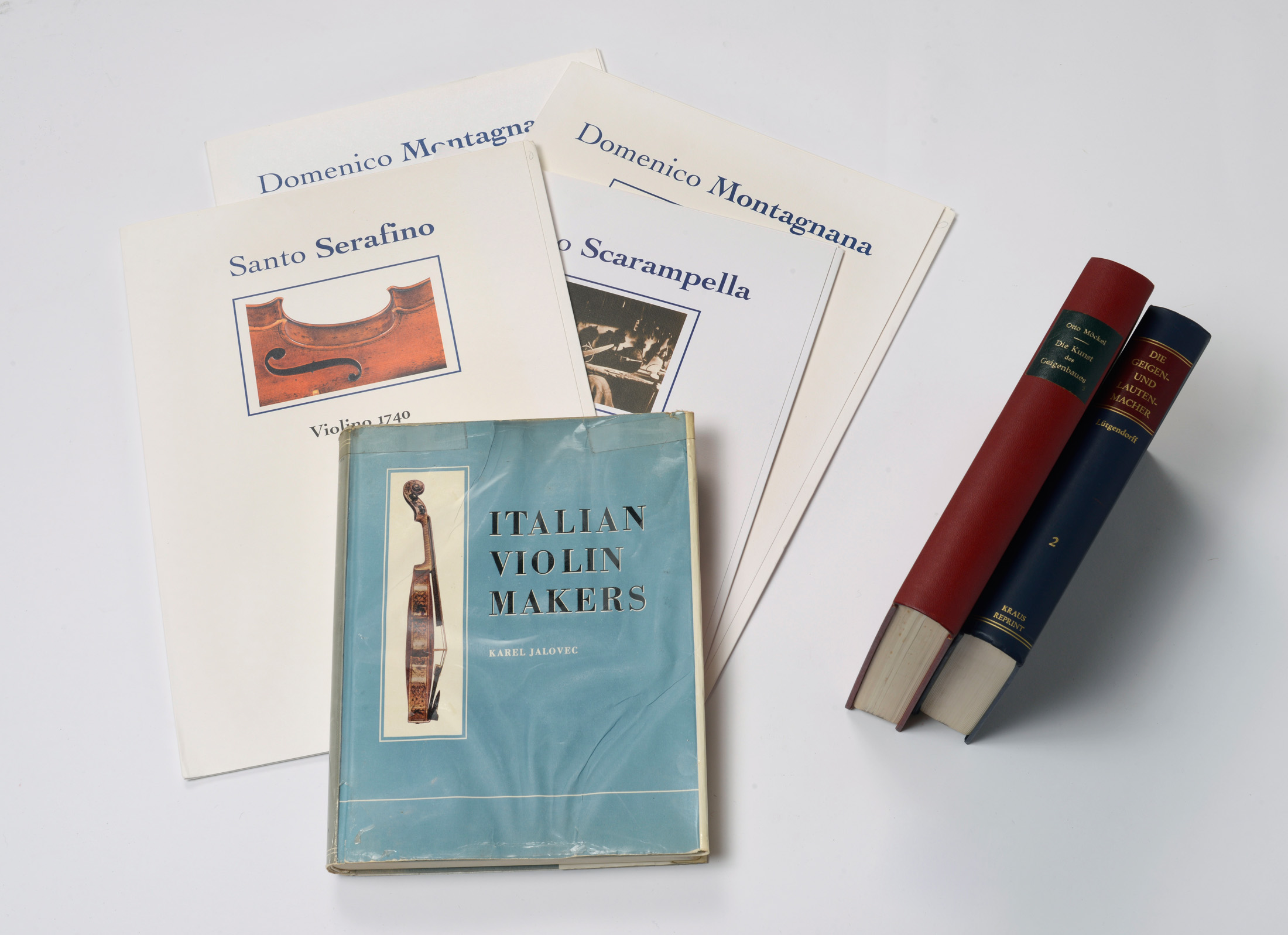- 4 grands livrets contenant des photos : Scarampella Violino 1904 / Montagnana Violoncello 1742 / Montagnana Violino 1730-40 / Santo Serafino Violino 1740. Cremona books. (Anglais / Italien) Bon état.